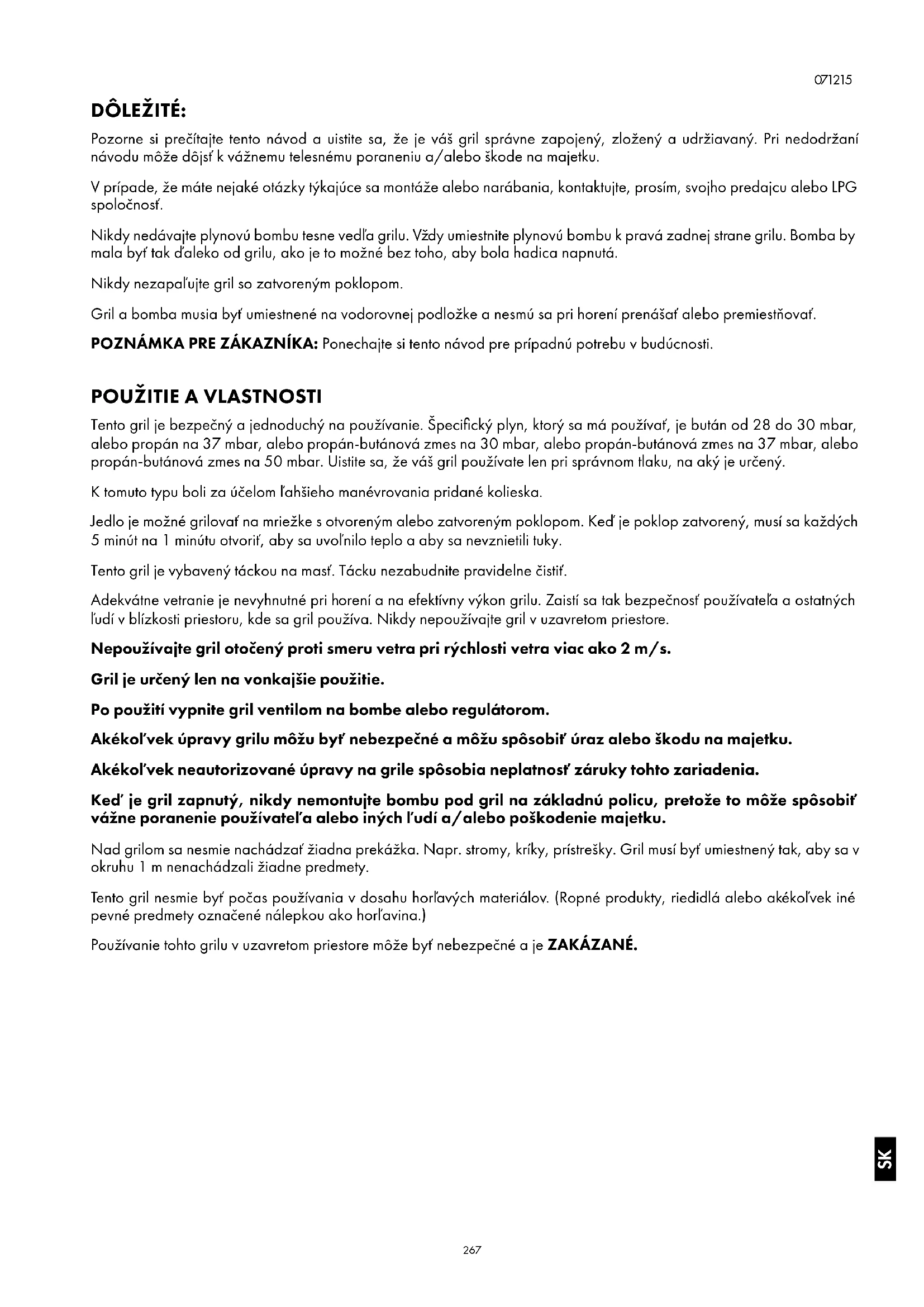 Tento gril je bezpečný a jednoduchý na používanie. Špecifický plyn, ktorý sa má používať, je bután od 28 do 30 mbar, alebo propán na 37 mbar, alebo propán-butánová zmes na 30 mbar, alebo propán-butánová zmes na 37 mbar, alebo propán-butánová zmes na 50 mbar. Uistite sa, že váš gril používate len pri správnom tlaku, na aký je určený. K tomuto typu boli za účelom ľahšieho manévrovania pridané kolieska. Jedlo je možné grilovať na mriežke s otvoreným alebo zatvoreným poklopom. Keď je poklop zatvorený, musí sa každých 5 minút na 1 minútu otvoriť, aby sa uvoľnilo teplo a aby sa nevznietili tuky. Tento gril je vybavený táckou na masť. Tácku nezabudnite pravidelne čistiť. Adekvátne vetranie je nevyhnutné pri horení a na efektívny výkon grilu. Zaistí sa tak bezpečnosť používateľa a ostatných ľudí v blízkosti priestoru, kde sa gril používa. Nikdy nepoužívajte gril v uzavretom priestore. Nepoužívajte gril otočený proti smeru vetra pri rýchlosti vetra viac ako 2 m/s. Gril je určený len na vonkajšie použitie. Po použití vypnite gril ventilom na bombe alebo regulátorom. Akékoľvek úpravy grilu môžu byť nebezpečné a môžu spôsobiť úraz alebo škodu na majetku. Akékoľvek neautorizované úpravy na grile spôsobia neplatnosť záruky tohto zariadenia. Keď je gril zapnutý, nikdy nemontujte bombu pod gril na základnú policu, pretože to môže spôsobiť vážne poranenie používateľa alebo iných ľudí a/alebo poškodenie majetku. Nad grilom sa nesmie nachádzať žiadna prekážka. Napr. stromy, kríky, prístrešky. Gril musí byť umiestnený tak, aby sa v okruhu 1 m nenachádzali žiadne predmety. Tento gril nesmie byť počas používania v dosahu horľavých materiálov. (Ropné produkty, riedidlá alebo akékoľvek iné pevné predmety označené nálepkou ako horľavina.) Používanie tohto grilu v uzavretom priestore môže byť nebezpečné a je ZAKÁZANÉ. SK268