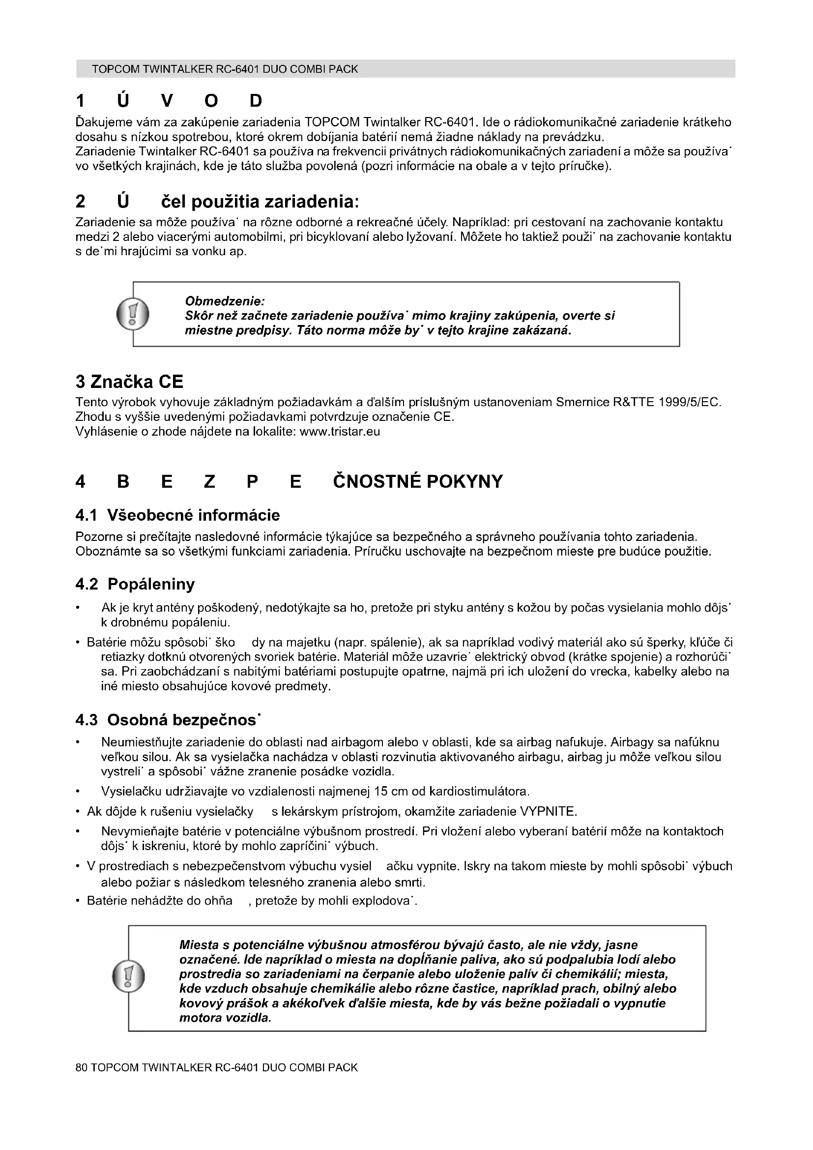 1ÚVOD Ďakujeme vám za zakúpenie zariadenia TOPCOM Twintalker RC-6401. Ide o rádiokomunikačné zariadenie krátkeho dosahu s nízkou spotrebou, ktoré okrem dobíjania batérií nemá žiadne náklady na prevádzku. Zariadenie Twintalker RC-6401 sa používa n a frekvencii privátnych rádiokomunikačných zariadení a môže sa používa˙ vo všetkých krajinách, kde je táto služba povolená (pozri informácie na obale a v tejto príručke). 2Účel použitia zariadenia: Zariadenie sa môže používa˙ na rôzne odborné a rekreačné účely. Napríklad: pri cestovaní na zachovanie kontaktu medzi 2 alebo viacerými automobilmi, pri bicyklovaní alebo lyžovaní. Môžete ho taktiež použi˙ na zachovanie kontaktu s de˙mi hrajúcimi sa vonku ap. Obmedzenie: Skôr než začnete zariadenie používa˙ mimo krajiny zakúpenia, overte si miestne predpisy. Táto norma môže by˙ v tejto krajine zakázaná. 3 Značka CE Tento výrobok vyhovuje základným požiadavkám a ďalším príslušným ustanoveniam Smernice R&TTE 1999/5/EC. Zhodu s vyššie uvedenými požiadavkami potvrdzuje označenie CE. Vyhlásenie o zhode nájdete na lokalite: www.tristar.eu