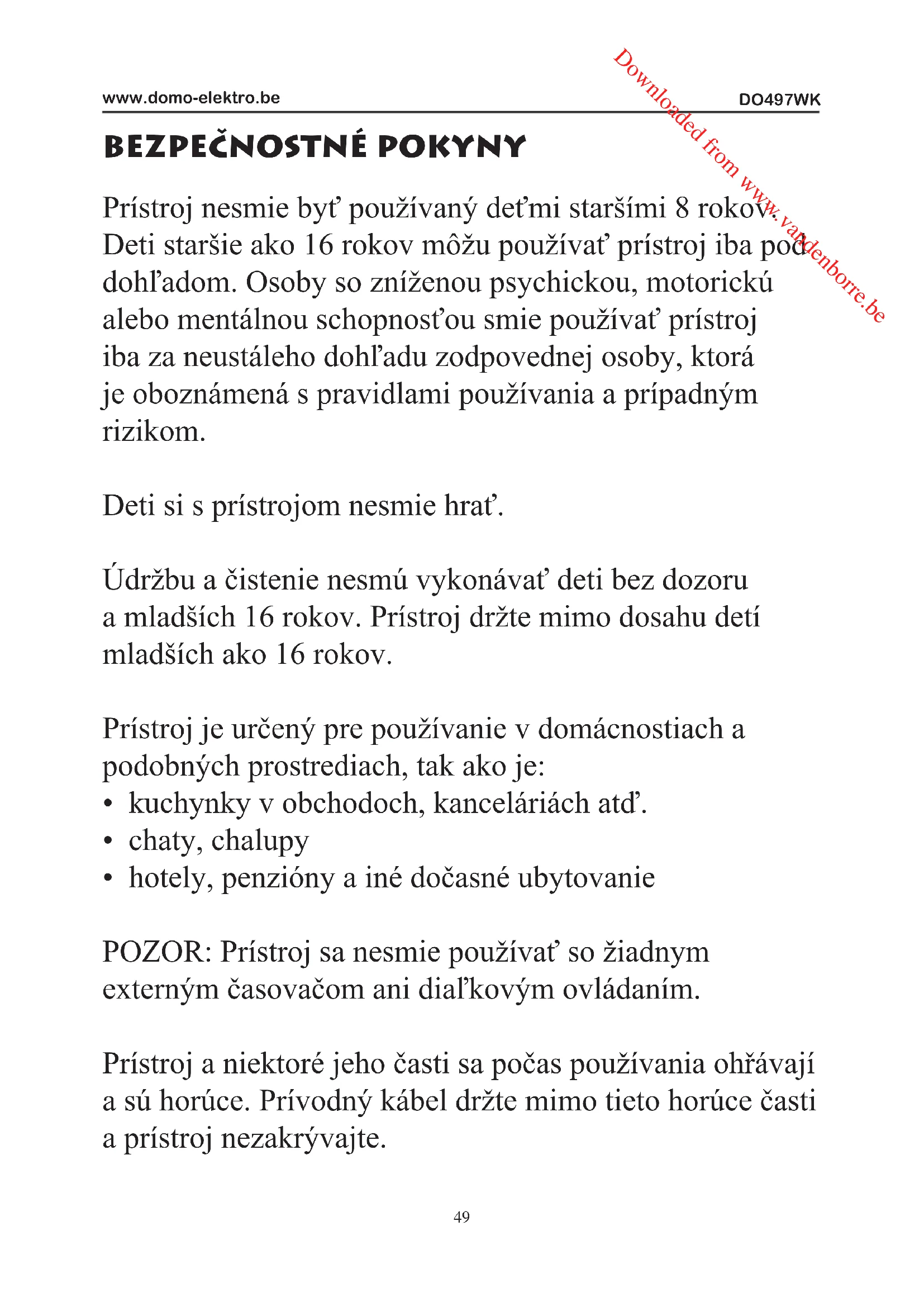 - Tento prístroj je určený iba pre domáce použitie. Výrobca ani predajca nie je schopný znášať riziká Downloaded from www.vandenborre.beDO497WK