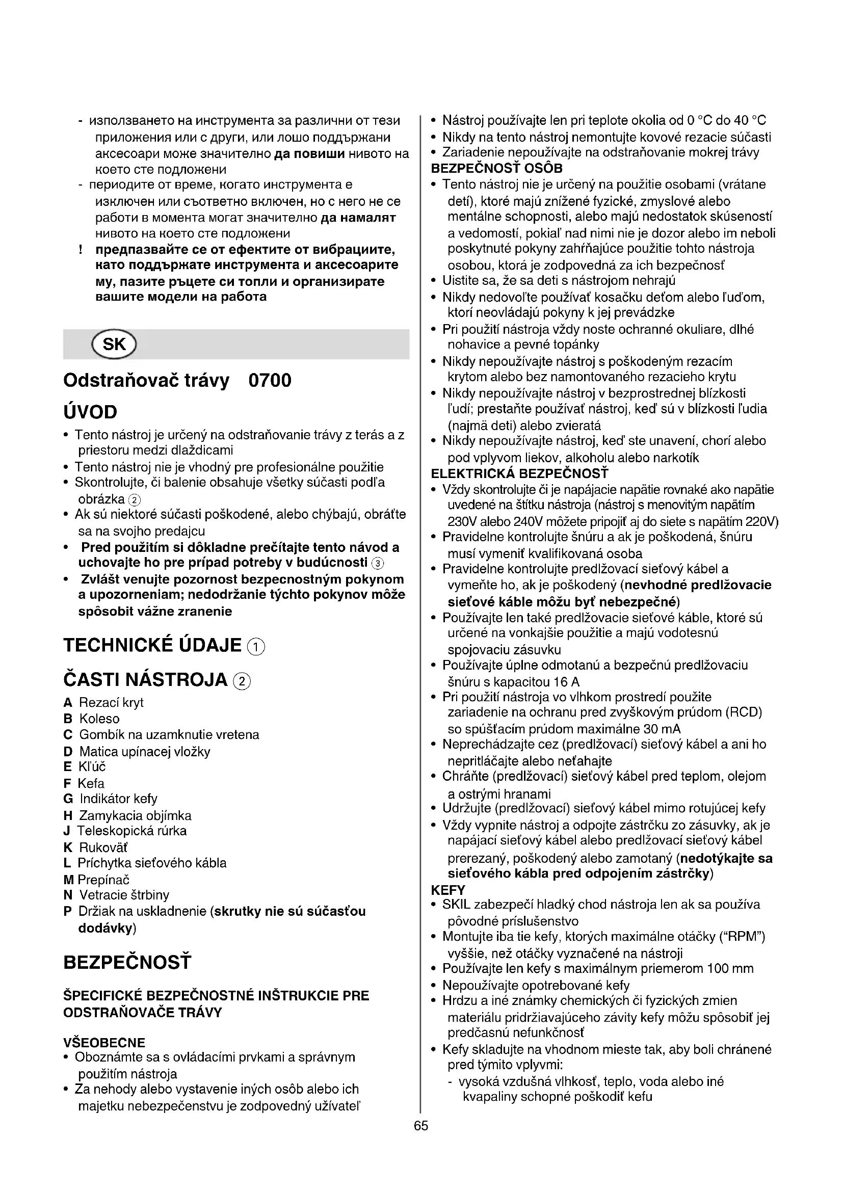 - Zvláštvenujtepozornostbezpecnostnýmpokynom aupozorneniam;nedodržanietýchtopokynovmôže spôsobitvážnezranenie TECHNICkÉ ÚDAJE 1 ČASTINÁSTROJA2 A Rezací kryt B Koleso C Gombík na uzamknutie vretena D Matica upínacej vložky E Kľúč F Kefa G Indikátor kefy H Zamykacia objímka J Teleskopická rúrka k Rukoväť l Príchytka sieťového kábla m Prepínač N Vetracie štrbiny P Držiak na uskladnenie (skrutkyniesúsúčasťou dodávky) BEZPEČNOSŤ