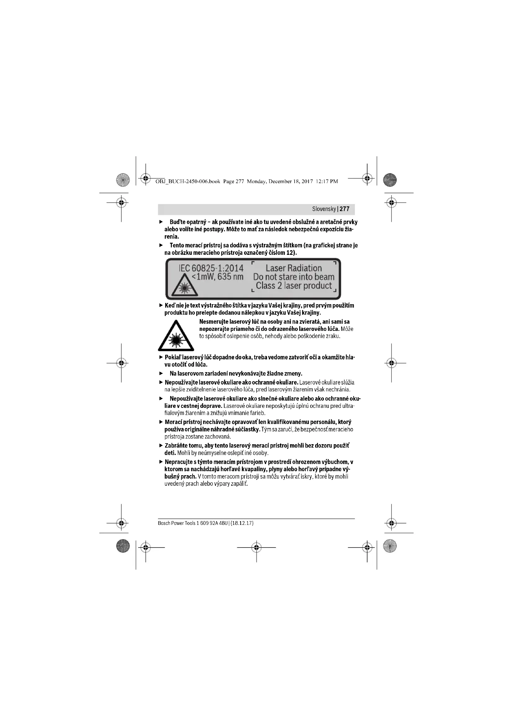Prevádzkové frekvenčné pásmo 2402 – 2480 MHz Max. vysielací výkon 2,5 mW Digitálny laserový diaľkomer GLM 50 C OBJ_BUCH-2450-006.book Page 279 Monday, December 18, 2017 12:17 PM280 | Slovensky 1 609 92A 48U | (18.12.17) Bosch Power Tools Vyobrazené komponenty Číslovanie jednotlivých zobrazených komponentov sa vzťahuje na vyobrazenie mera- cieho prístroja na grafickej strane tohto Návodu na používanie. 1 Displej 2 Meracie tlačidlo[ ] 3 Tlačidlo Plus[+] 4 Tlačidlo Voľba vzťažnej roviny 5 Tlačidlo vypínača[ ] 6 Tlačidlo Bluetooth® 7 Tlačidlo funkcií[Func] 8 Tlačidlo Mínus[–] 9 Viečko priehradky na batérie 10 Aretácia veka priehradky na batérie 11 Sériové číslo 12 Výstražný štítok laserového prístroja 13 1/4" závit statívu 14 Prijímacia šošovka 15 Výstup laserového žiarenia 16 Ochranná taška 17 Laserová cieľová tabuľka* A) Pri meraní od prednej hrany meracieho prístroja, platí pre veľmi dobré reflexné vlastnosti cieľa (napríklad nabielo natretá stena), slabé osvetlenie v pozadí a prevádzkovú teplotu 25 °C. Dodatoč- ne je potrebné počítať s odchýlkou ±0,05 mm/m. B) Pri meraní od zadnej hrany meracieho prístroja, platí pre vysoké reflexné vlastnosti cieľa (napr. biely kartón), silné osvetlenie v pozadí a prevádzkovú teplotu – 10 °C až +45 °C. Okrem toho je po- trebné počítať sodchýlkou ±0,15 mm/m. C) Po kalibrácii používateľom pri 0 ° a90 ° sa musí zohľadniť navyše chyba stúpania ±0,01 °/ stup- ňov až 45 ° (max.). Ako základná rovina pre meranie sklonu slúži ľavá strana meracieho prístroja. D) Pri prevádzkovej teplote 25 °C E) Vo funkcii Trvalé meranie je maximálna prevádzková teplota +40 °C. F) s výnimkou priehradky na batérie G) Pri použití prístrojov Bluetooth®-Low-Energy môže byť podľa modelu a prevádzkové systému možné, že sa nevytvorí spojenie. Prístroje Bluetooth® musia podporovať SPP profil. H) Bluetooth® deaktivovaný Na jednoznačnú identifikáciu Vášho meracieho prístroja slúži sériové číslo 11 na typovom štítku. OBJ_BUCH-2450-006.book Page 280 Monday, December 18, 2017 12:17 PMSlovensky | 281 Bosch Power Tools 1 609 92A 48U | (18.12.17) 18 Okuliare na zviditeľnenie laserového lúča* 19 Statív*