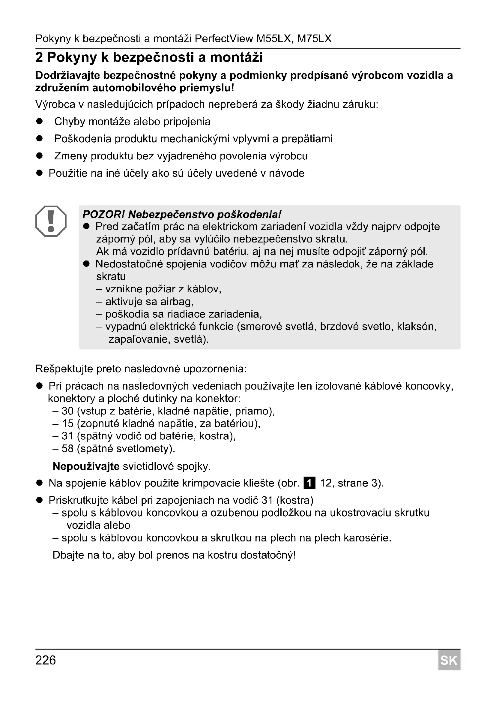 2 Pokyny k bezpečnosti a montáži Dodržiavajte bezpečnostné pokyny a podmienky predpísané výrobcom vozidla a združením automobilového priemyslu! Výrobca v nasledujúcich prípadoch nepreberá za škody žiadnu záruku: Chyby montáže alebo pripojenia Poškodenia produktu mechanickými vplyvmi a prepätiami Zmeny produktu bez vyjadreného povolenia výrobcu Použitie na iné účely ako sú účely uvedené v návode