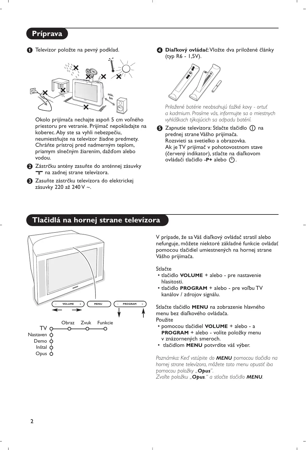 Okolo prijímača nechajte aspoň 5 cm voľného priestoru pre vetranie. Prijímač nepokladajte na koberec. Aby ste sa vyhli nebezpečiu, neumiestňujte na televízor žiadne predmety. Chráňte prístroj pred nadmerným teplom, priamym slnečným žiarením, dažďom alebo vodou. é Zástrčku antény zasuňte do anténnej zásuvky x na zadnej strane televízora. “ Zasuňte zástrčku televízora do elektrickej zásuvky 220 až 240 V ~. Priložené batérie neobsahujú ťažké kovy - ortuť a kadmium. Prosíme vás, informujte sa o miestnych vyhláškach týkajúcich sa odpadu batérií. ( Zapnutie televízora: Stlačte tlačidlo A na prednej strane Vášho prijímača. Rozsvieti sa svetielko a obrazovka. Ak je TV prijímač v pohotovostnom stave (červený indikator), stlačte na diaľkovom ovládači tlačidlo -P+ alebo B. Tlačidlá na hornej strane televízora V prípade, že sa Váš diaľkový ovládač stratil alebo nefunguje, môžete niektoré základné funkcie ovládať pomocou tlačidiel umiestnených na hornej strane Vášho prijímača. Stlačte