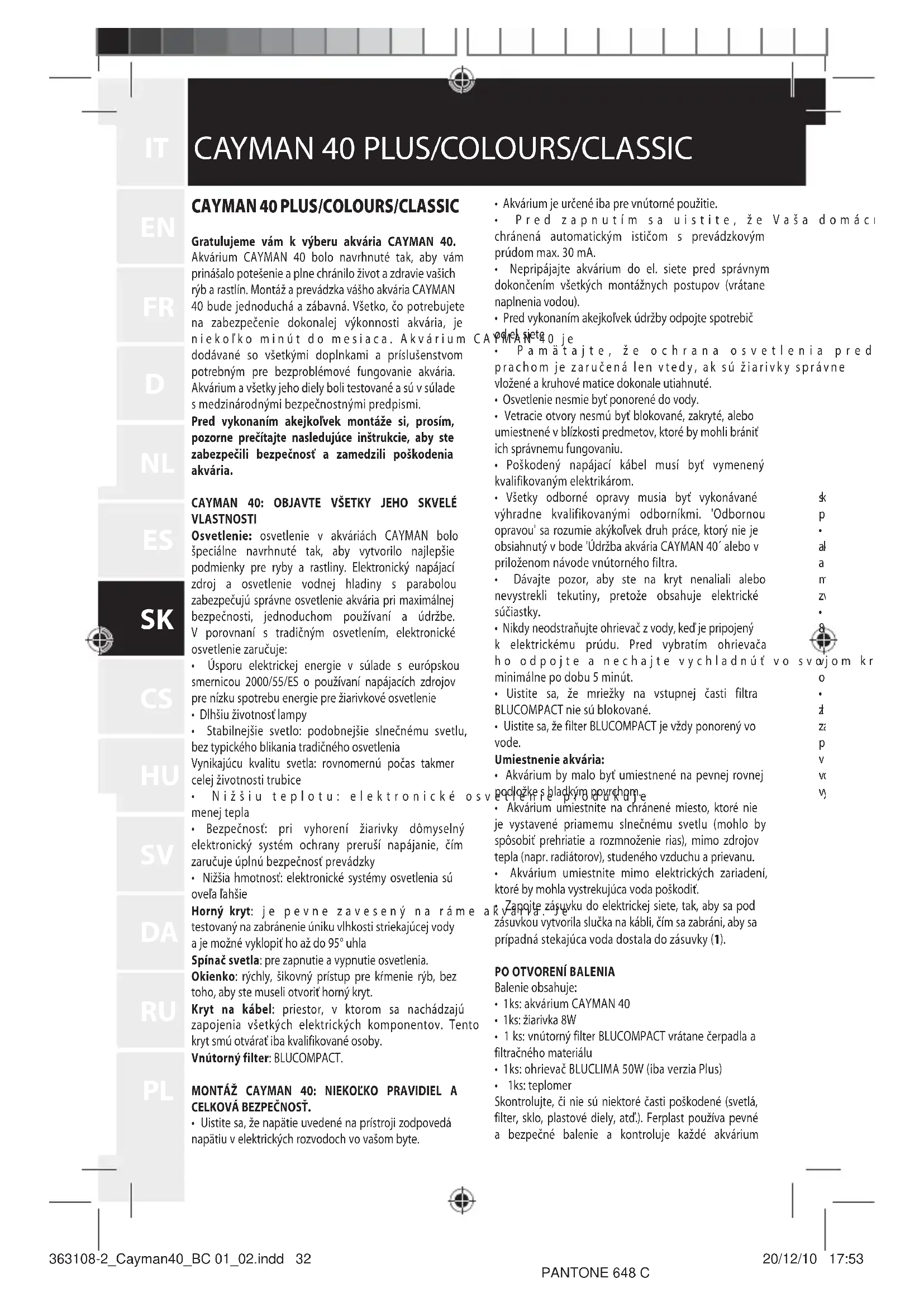 Akvarium CAYMAN 40 bylo navrhnuto tak, aby vam prinaseLO poteseni a plne chranilo zivot a zdrai vasich ryb a rostlin. Montaz a provoz vaseho akvria CAYMAN 40 bude Jednoducha a zabavna.Vsechno,co potrebujete na zabezpecni dokonale vykonnosti akvria,je nikolik minut za mésic.Akvarium CAYMAN se vsemi doplynky a prisluenstvim potrebnym pro bezproblmové fungovani akvria.Akvarium a vsechny jeho dily byly testované a jsou v souladus medzinarodnimi bezpecnostnimipredpisy.Pred vykonanim montaze si, prosim,pozorn prectete nasledujici instrukce,abyste zabezpecili bezpecnost a zamezili poskozeni akvria.