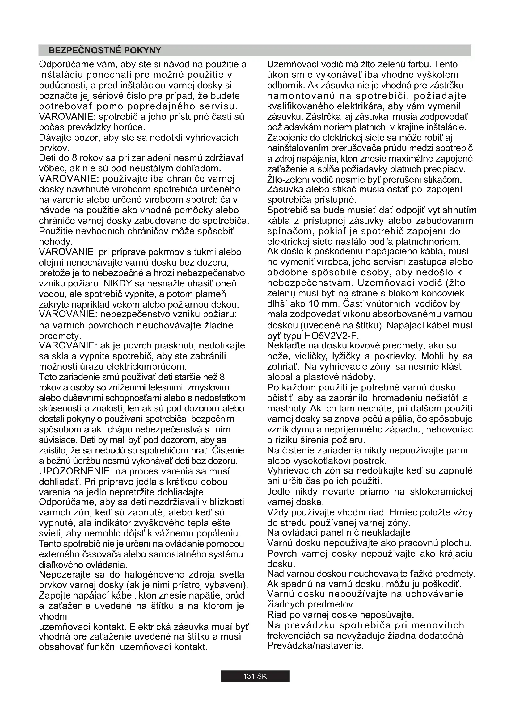 131 SK Uzemňovací vodič má žlto-zelenú farbu. Tento úkon smie vykonávať iba vhodne vyškolený odborník. Ak zásuvka nie je vhodná pre zástrčku namontovanú na spotrebiči, požiadajte kvalifikovaného elektrikára, aby vám vymenil zásuvku. Zástrčka aj zásuvka musia zodpovedať požiadavkám noriem platných v krajine inštalácie. Zapojenie do elektrickej siete sa môže robiť aj nainštalovaním prerušovača prúdu medzi spotrebič a zdroj napájania, ktorý znesie maximálne zapojené zaťaženie a spĺňa požiadavky platných predpisov. Žlto-zelený vodič nesmie byť prerušený stýkačom. Zásuvka alebo stýkač musia ostať po zapojení spotrebiča prístupné. Spotrebič sa bude musieť dať odpojiť vytiahnutím kábla z prístupnej zásuvky alebo zabudovaným spínačom, pokiaľ je spotrebič zapojený do elektrickej siete nastálo podľa platnýchnoriem. Ak došlo k poškodeniu napájacieho kábla, musí ho vymeniť výrobca, jeho servisný zástupca alebo obdobne spôsobilé osoby, aby nedošlo k nebezpečenstvám. Uzemňovací vodič (žlto zelený) musí byť na strane s blokom koncoviek dlhší ako 10 mm. Časť vnútorných vodičov by mala zodpovedať výkonu absorbovanému varnou doskou (uvedené na štítku). Napájací kábel musí byť typu HO5V2V2-F. Neklaďte na dosku kovové predmety, ako sú nože, vidličky, lyžičky a pokrievky. Mohli by sa zohriať. Na vyhrievacie zóny sa nesmie klásť alobal a plastové nádoby. Po každom použití je potrebné varnú dosku očistiť, aby sa zabránilo hromadeniu nečistôt a mastnoty. Ak ich tam necháte, pri ďalšom použití varnej dosky sa znova pečú a pália, čo spôsobuje vznik dymu a nepríjemného zápachu, nehovoriac o riziku šírenia požiaru. Na čistenie zariadenia nikdy nepoužívajte parný alebo vysokotlakový postrek. Vyhrievacích zón sa nedotýkajte keď sú zapnuté ani určitý čas po ich použití. Jedlo nikdy nevarte priamo na sklokeramickej varnej doske. Vždy používajte vhodný riad. Hrniec položte vždy do stredu používanej varnej zóny. Na ovládací panel nič neukladajte. Varnú dosku nepoužívajte ako pracovnú plochu. Povrch varnej dosky nepoužívajte ako krájaciu dosku. Nad varnou doskou neuchovávajte ťažké predmety. Ak spadnú na varnú dosku, môžu ju poškodiť. Varnú dosku nepoužívajte na uchovávanie žiadnych predmetov. Riad po varnej doske neposúvajte. Na prevádzku spotrebiča pri menovitých frekvenciách sa nevyžaduje žiadna dodatočná Prevádzka/nastavenie.KÓD VÝROBKU T Identifikačný štítok (nachádza sa pod krytom v spodnej časti varnej dosky)