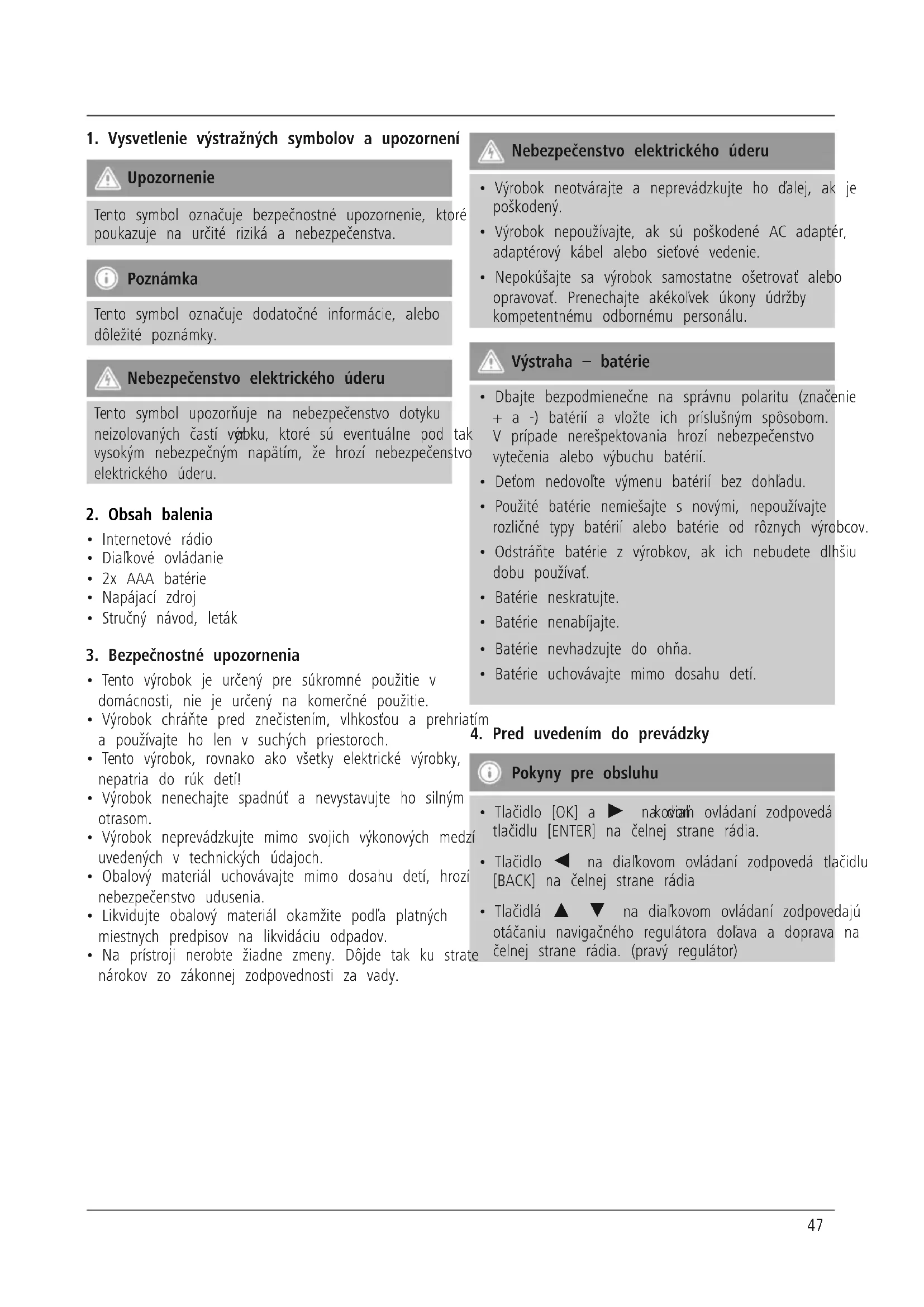 - Nepokúšajte sa výrobok samostatne ošetrovať alebo opravovať. Prenechajte akékoľvek úkony údržby kompetentnému odbornému personálu. Výstraha – batérie