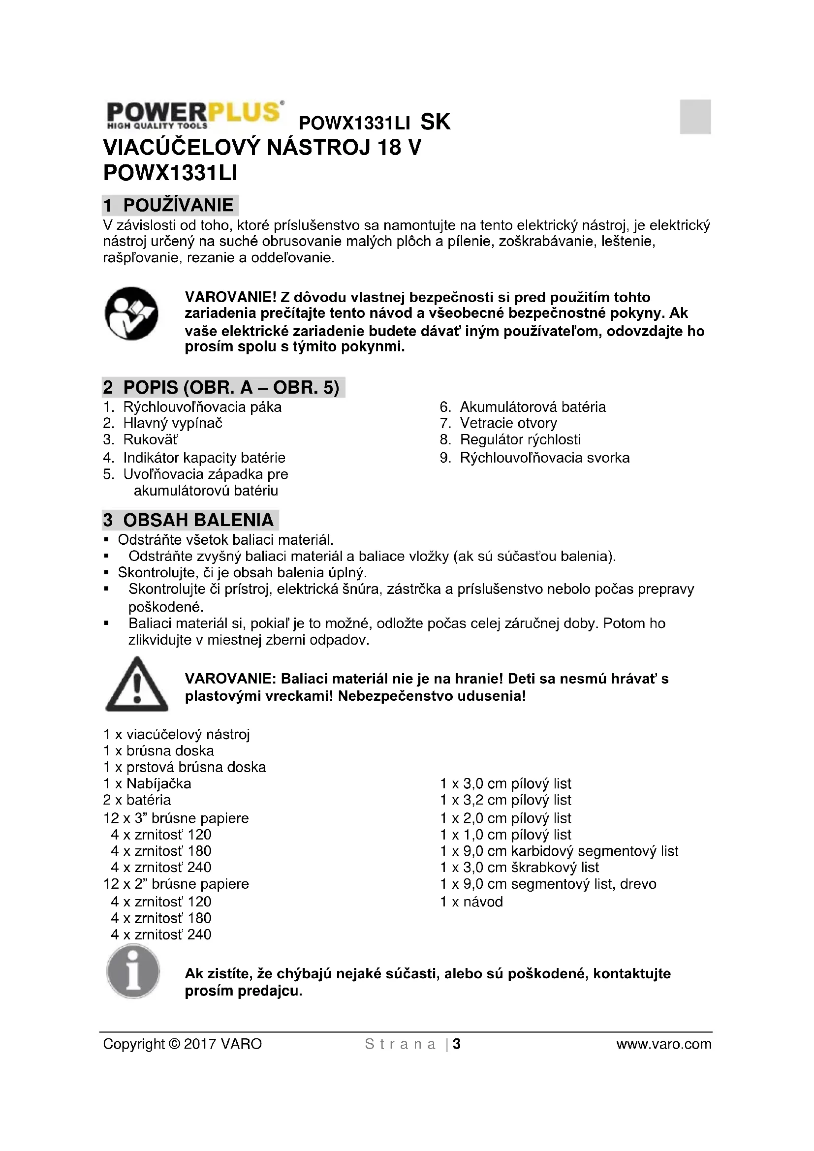 - Pri výmene pracovných nástrojov používajte pracovné rukavice. Pracovné nástroje sa pri dlhšom používaní rozpália.POWX1331LI SK Copyright © 2017 VARO S t r a n a | 8 www.varo.com