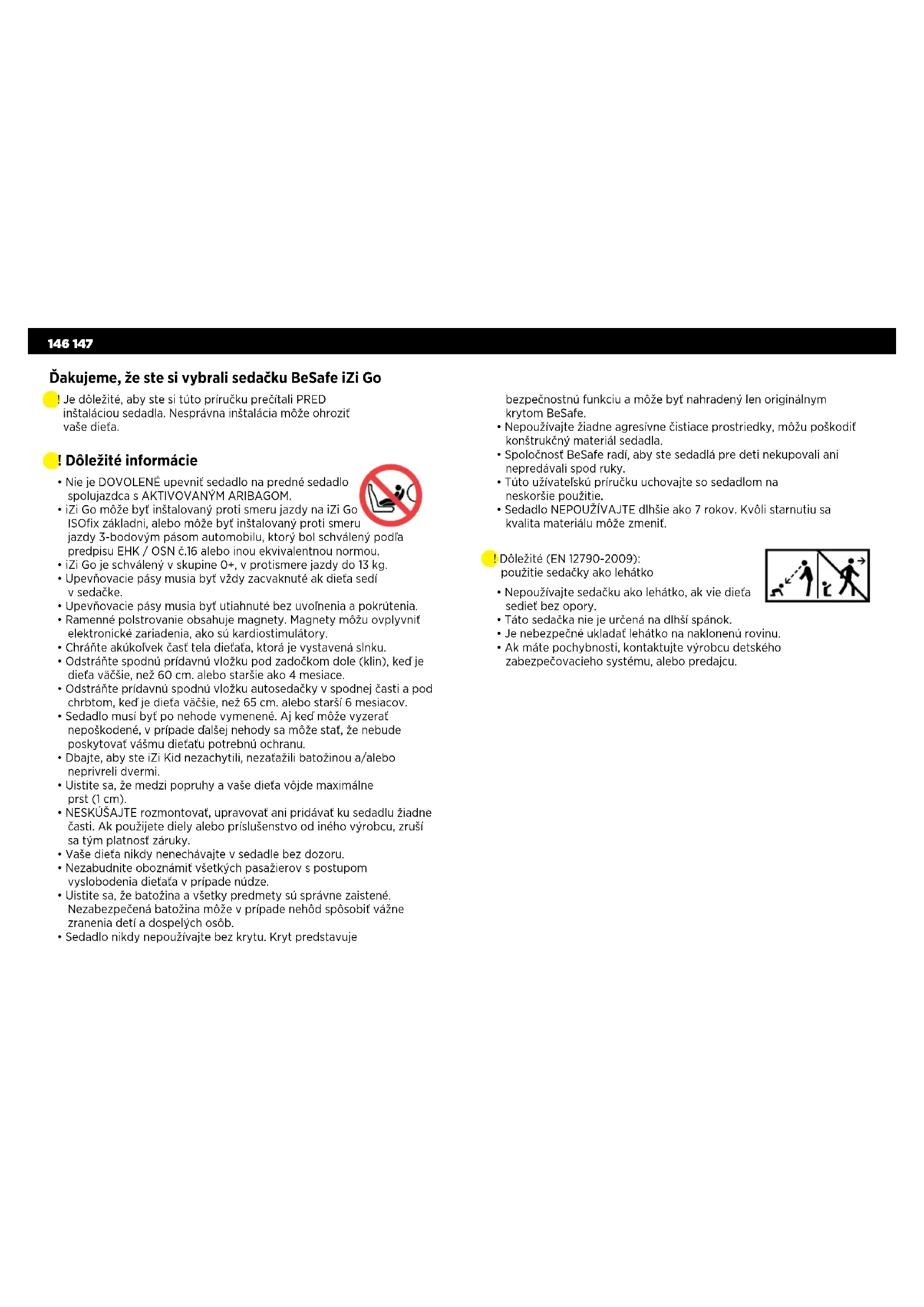 - Sedadlo nikdy nepoužívajte bez krytu. Kryt predstavuje Ďakujeme, že ste si vybrali sedačku BeSafe iZi Go ! Je dôležité, aby ste si túto príručku prečítali PRED inštaláciou sedadla. Nesprávna inštalácia môže ohroziť vaše dieťa. ! Dôležité (EN 12790-2009): použitie sedačky ako lehátko bezpečnostnú funkciu a môže byť nahradený len originálnym krytom BeSafe.