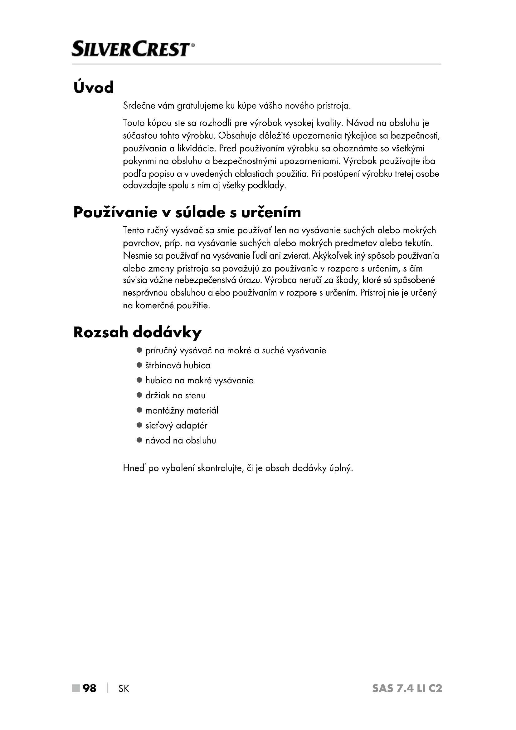 Úvod Srdečne vám gratulujeme ku kúpe vášho nového prístroja. Touto kúpou ste sa rozhodli pre výrobok vysokej kvality. Návod naobsluhu je súčasťou tohto výrobku. Obsahuje dôležité upozornenia týkajúce sa bezpečnosti, používania alikvidácie. Pred používaním výrobku sa oboznámte sovšetkými pokynmi na obsluhu abezpečnostnými upozorneniami. Výrobok používajte iba podľa popisu a vuvedených oblastiach použitia. Pri postúpení výrobku tretej osobe odovzdajte spolu sním aj všetky podklady. Používanie vsúlade surčením Tento ručný vysávač sa smie používať len na vysávanie suchých alebo mokrých povrchov, príp. na vysávanie suchých alebo mokrých predmetov alebo tekutín. Nesmie sa používať na vysávanie ľudí ani zvierat. Akýkoľvek iný spôsob používania alebo zmeny prístroja sa považujú za používanie v rozpore surčením, s čím súvisia vážne nebezpečenstvá úrazu. Výrobca neručí za škody, ktoré sú spôsobené nesprávnou obsluhou alebo používaním v rozpore surčením. Prístroj nie je určený na komerčné použitie. Rozsah dodávky ▯ príručný vysávač na mokré a suché vysávanie ▯ štrbinová hubica ▯ hubica na mokré vysávanie ▯ držiak na stenu ▯ montážny materiál ▯ sieťový adaptér ▯ návod naobsluhu Hneď po vybalení skontrolujte, či je obsah dodávky úplný.SK