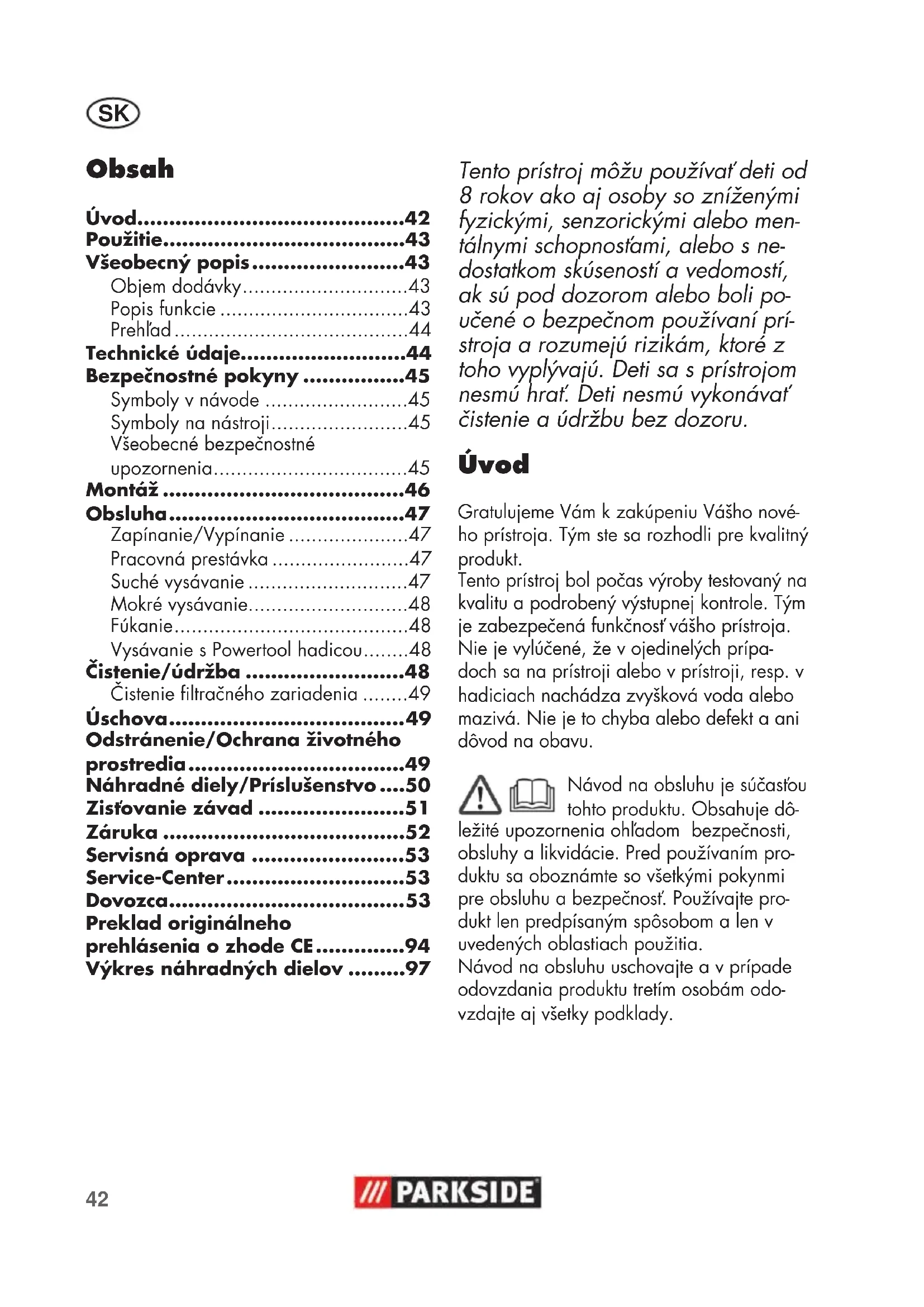- Výkres náhradných dielov Tento prístroj môžu používať deti od 8 rokov ako aj osoby so zníženými fyzickými, senzorickými alebo men- tálnymi schopnosťami, alebo s ne- dostatkom skúseností a vedomostí, ak sú pod dozorom alebo boli po- učené o bezpečnom používaní prí- stroja a rozumejú rizikám, ktoré z toho vyplývajú. Deti sa s prístrojom nesmú hrať. Deti nesmú vykonávať čistenie a údržbu bez dozoru. Úvod Gratulujeme Vám k zakúpeniu Vášho nové- ho prístroja. Tým ste sa rozhodli pre kvalitný produkt. Tento prístroj bol počas výroby testovaný na kvalitu a podrobený výstupnej kontrole. Tým je zabezpečená funkčnosť vášho prístroja. Nie je vylúčené, že v ojedinelých prípa- doch sa na prístroji alebo v prístroji, resp. v hadiciach nachádza zvyšková voda alebo mazivá. Nie je to chyba alebo defekt a ani dôvod na obavu. Návod na obsluhu je súčasťou tohto produktu. Obsahuje dô- ležité upozornenia ohľadom bezpečnosti, obsluhy a likvidácie. Pred používaním pro- duktu sa oboznámte so všetkými pokynmi pre obsluhu a bezpečnosť. Používajte pro- dukt len predpísaným spôsobom a len v uvedených oblastiach použitia. Návod na obsluhu uschovajte a v prípade odovzdania produktu tretím osobám odo- vzdajte aj všetky podklady.43 p. 97