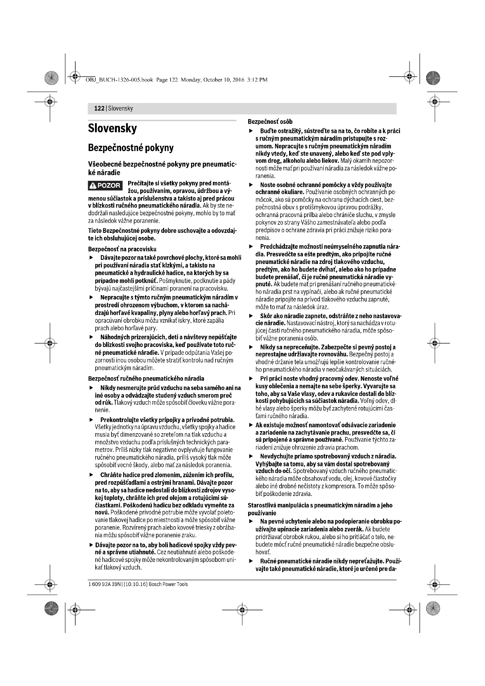 Ak existuje možnosť namontovať odsávacie zariadenie a zariadenie na zachytávanie prachu, presvedčte sa, či sú pripojené a správne používané. Používanie týchto za- riadení znižuje ohrozenie zdravia prachom. Nevdychujte priamo spotrebovaný vzduch z náradia. Vyhýbajte sa tomu, aby sa vám dostal spotrebovaný vzduch do očí. Spotrebovaný vzduch ručného pneumatic- kého náradia môže obsahovať vodu, olej, kovové čiastočky alebo iné drobné nečistoty z kompresora. To môže spôso- biť poškodenie zdravia. Starostlivá manipulácia s pneumatickým náradím a jeho používanie Na pevné uchytenie alebo na podopieranie obrobku po- užívajte upínacie zariadenia alebo zverák. Ak budete pridržiavať obrobok rukou, alebo si ho pritláčať o telo, ne- budete môcť ručné pneumatické náradie bezpečne obslu- hovať. Ručné pneumatické náradie nikdy nepreťažujte. Použí- vajte také pneumatické náradie, ktoré je určené pre da- POZOR OBJ_BUCH-1326-005.book Page 122 Monday, October 10, 2016 3:12 PMSlovensky | 123 Bosch Power Tools 1 609 92A 39N | (10.10.16) ný druh práce. Pomocou vhodného pneumatického nára- dia budete pracovať lepšie a bezpečnejšie v uvedenom roz- sahu výkonu náradia. Nepoužívajte nikdy také ručné pneumatické náradie, ktoré má pokazený vypínač. Ručné pneumatické nára- die, ktoré sa nedá zapnúť alebo vypnúť, je nebezpečné a treba ho poslať do opravy. Predtým ako začnete vykonávať na náradí nastavova- nie, vymieňať príslušenstvo a pred dlhším nepoužíva- ním náradia vždy prerušte prívod tlakového vzduchu. Toto preventívne bezpečnostné opatrenie zabraňuje ne- úmyselnému spusteniu ručného pneumatického náradia. Nepoužívané ručné pneumatické náradie uschovávajte tak, aby bolo mimo dosahu detí. Nedovoľte používať pneumatické náradie osobám, ktoré s ním nie sú dôver- ne oboznámené, alebo ktoré si neprečítali tieto Poky- ny. Ručné pneumatické náradie je nebezpečné vtedy, keď ho používajú neskúsené osoby. Ručné pneumatické náradie starostlivo ošetrujte. Kon- trolujte, či pohyblivé súčiastky ručného pneumatické- ho náradia bezchybne fungujú, alebo či neblokujú, či nie sú zlomené alebo poškodené niektoré súčiastky, ktoré by mohli negatívne ovplyvňovať fungovanie ruč- ného pneumatického náradia. Pred použitím ručného pneumatického náradia dajte poškodené súčiastky opraviť. Veľa pracovných úrazov bolo spôsobených ne- dostatočnou údržbou ručného pneumatického náradia. Ručné pneumatické náradie, príslušenstvo, pracovné nástroje atď. používajte podľa týchto pokynov. Pri prá- ci zohľadnite konkrétne pracovné podmienky a čin- nosť, ktorú budete vykonávať. Takýmto spôsobom sa v maximálnej možnej miere zredukuje produkovanie prachu, vibrácií a hluku. Ručné pneumatické náradie smú inštalovať a pripravo- vať, nastavovať alebo používať výlučne iba kvalifikova- ní a zaškolení pracovníci. Na tomto ručnom pneumatickom náradí sa nesmú vy- konávať žiadne zmeny. Zmeny by mohli znížiť účinnosť bezpečnostných opatrení a zvýšiť riziko pre obsluhujúci personál. Servis Ručné pneumatické náradie nechávajte opravovať len kvalifikovanému personálu, ktorý používa originálne náhradné súčiastky. Tým sa zaručí, že bezpečnosť ručné- ho pneumatického náradia zostane zachovaná. Bezpečnostné pokyny pre pneumatické excen- trické brúsky Ak sa zlomí pracovný nástroj, alebo niektorá časť prís- lušenstva, prípadne dokonca samotné pneumatické náradie, môže dôjsť k vymršteniu niektorej zo súčias- tok obrovskou rýchlosťou. Pri používaní pneumatického náradia, ako aj pri jeho oprave alebo údržbe a pri výmene náhradných súčias- tok náradia treba vždy používať ochranu zraku odolá- vajúcu nárazom. Stupeň požadovanej ochrany treba konkrétne zvážiť pre každý jednotlivý prípad použitia osobitnen. Keď pracujete v polohe nad hlavou, majte vždy nasade- nú ochrannú prilbu. Takýmto spôsobom sa vyhnete prí- padným poraneniam. Zabezpečte, aby sa iné osoby nachádzali v bezpečnej vzdialenosti od Vášho pracoviska. Každá osoba, ktorá vstúpi do pracovného dosahu náradia, musí byť vyba- vená osobnými ochrannými pomôckami. Úlomky obrob- ku alebo zlomený rezací kotúč môžu odletieť ďaleko a spô- sobiť poranenie osôb, aj takých, ktoré sa nachádzajú mimo priameho pracoviska. Zachovajte opatrnosť! Pri dlhšej prevádzke ručného pneumatického náradia sa môžu pracovné nástroje veľmi zahriať. Používajte pracovné rukavice. Obsluhujúca osoba a takisto aj personál vykonávajúci údržbu musia byť v stave fyzicky zvládnuť veľkosť, hmotnosť a výkon tohto pneumatického náradia. Buďte pripravený na neočakávané pohyby pneumatic- kého náradia, ktoré môžu vzniknúť následkom reakč- ných síl alebo v prípade zlomenia použitého pracovné- ho nástroja. Ručné pneumatické náradie držte pevne a svoje telo a svoje ruky udržiavajte vždy v takej polohe, aby ste prípadný spätný ráz náradia mohli zachytiť. Tie- to preventívne bezpečnostné opatrenia Vám pomôžu vy- hnúť sa poraneniam. Pri práci s týmto ručným pneumatickým náradím zauj- mite pohodlný postoj, dbajte na bezpečné držanie a vy- hýbajte sa nepriaznivým polohám a takisto takým polo- hám, pri ktorých sa Vám ťažko udržiava rovnováha. Ob- sluhujúca osoba by mala počas dlho trvajúcej práce me- niť polohu tela, čo jej môže pomáhať odvrátiť nepríjem- né pocity a únavu. V prípade prerušenia dodávky tlakového vzduchu ale- bo pri redukovanom prevádzkovom tlaku ručné pneumatické náradie vypnite. Skontrolujte prevádzkový tlak a pri optimálnom prevádzkovom tlaku náradie znova zapnite. Používajte len mastiace prostriedky odpor