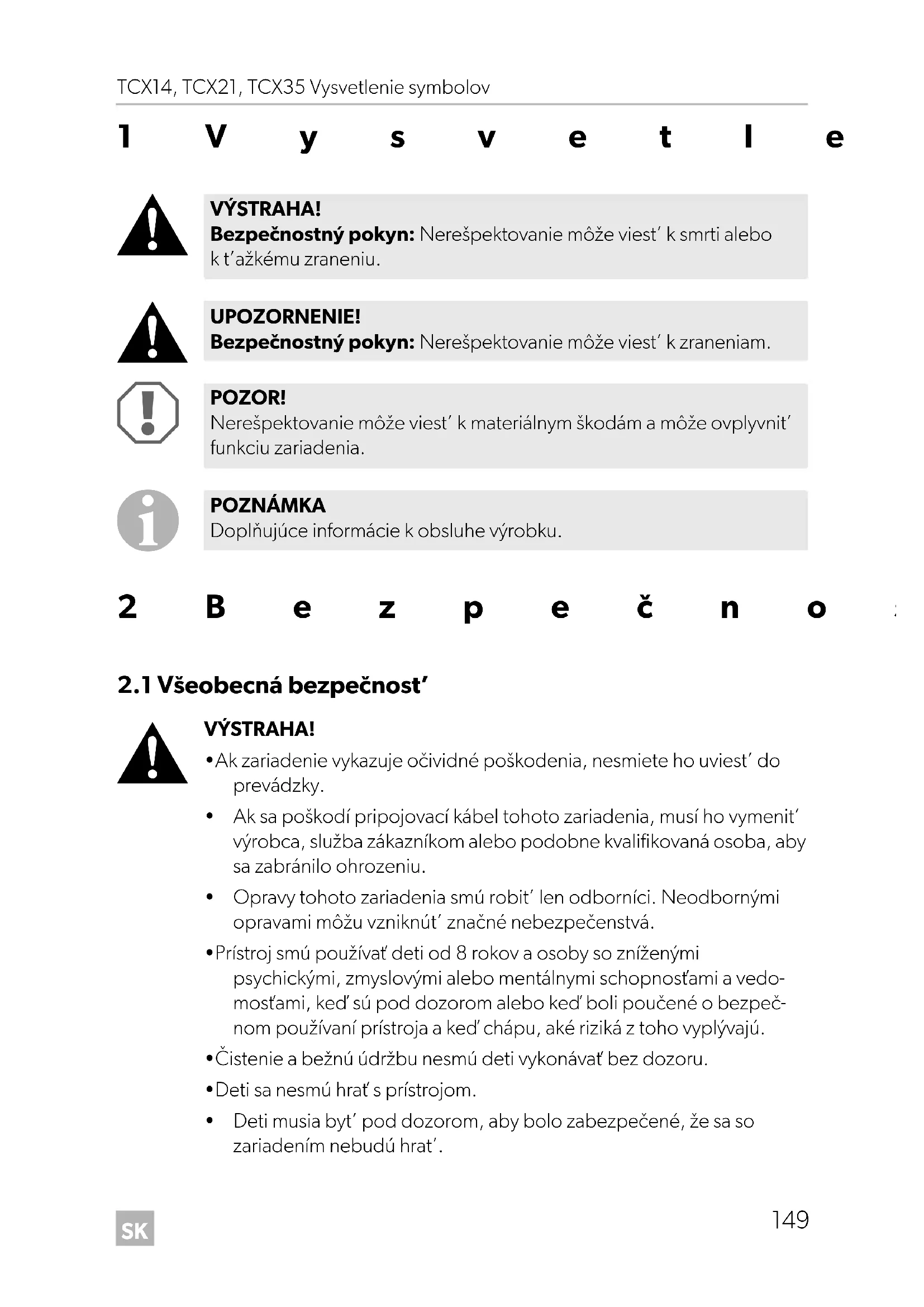 Bezpečnostný pokyn: Nerešpektovanie môže viest' k smrti alebo k t'ažkému zraneniu.