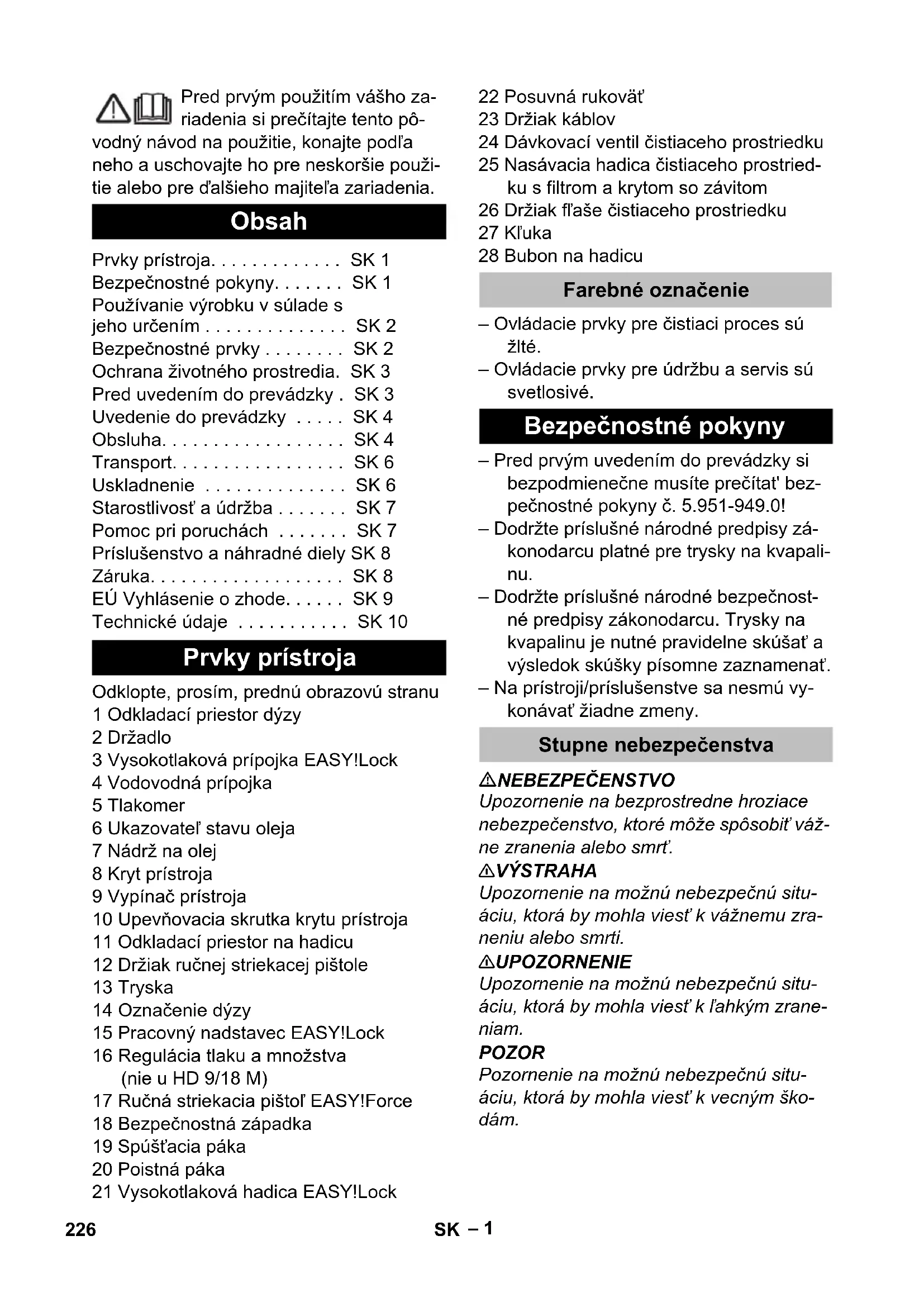 dB(A) 91 88 Substanţe tehnologice Cantitatea de ulei l 0,5 0,75 Tipul de ulei SAE 90 Hypoid Dimensiuni şi masa Lungime mm 554 Lăţime mm 509 Înălţime mm 1000 Masa fără accesorii (MX) kg 48,6 42,1 (49) 47 (55) 48 (50) 225RO– 1 Pred prvým použitím vášho za- riadenia si prečítajte tento pô- vodný návod na použitie, konajte podľa neho a uschovajte ho pre neskoršie použi- tie alebo pre ďalšieho majiteľa zariadenia. Odklopte, prosím, prednú obrazovú stranu 1 Odkladací priestor dýzy 2 Držadlo 3 Vysokotlaková prípojka EASY!Lock 4 Vodovodná prípojka 5 Tlakomer 6 Ukazovateľ stavu oleja 7 Nádrž na olej 8 Kryt prístroja 9 Vypínač prístroja 10 Upevňovacia skrutka krytu prístroja 11 Odkladací priestor na hadicu 12 Držiak ručnej striekacej pištole 13 Tryska 14 Označenie dýzy 15 Pracovný nadstavec EASY!Lock 16 Regulácia tlaku a množstva (nie u HD 9/18 M) 17 Ručná striekacia pištoľ EASY!Force 18 Bezpečnostná západka 19 Spúšťacia páka 20 Poistná páka 21 Vysokotlaková hadica EASY!Lock 22 Posuvná rukoväť 23 Držiak káblov 24 Dávkovací ventil čistiaceho prostriedku 25 Nasávacia hadica čistiaceho prostried- ku s filtrom a krytom so závitom 26 Držiak fľaše čistiaceho prostriedku 27 Kľuka 28 Bubon na hadicu – Ovládacie prvky pre čistiaci proces sú žlté. – Ovládacie prvky pre údržbu a servis sú svetlosivé. – Pred prvým uvedením do prevádzky si bezpodmienečne musíte prečítat' bez- pečnostné pokyny č. 5.951-949.0! – Dodržte príslušné národné predpisy zá- konodarcu platné pre trysky na kvapali- nu. – Dodržte príslušné národné bezpečnost- né predpisy zákonodarcu. Trysky na kvapalinu je nutné pravidelne skúšať a výsledok skúšky písomne zaznamenať. – Na prístroji/príslušenstve sa nesmú vy- konávať žiadne zmeny. NEBEZPEČENSTVO Upozornenie na bezprostredne hroziace nebezpečenstvo, ktoré môže spôsobiť váž- ne zranenia alebo smrť. 몇 VÝSTRAHA Upozornenie na možnú nebezpečnú situ- áciu, ktorá by mohla viesť k vážnemu zra- neniu alebo smrti. 몇 UPOZORNENIE Upozornenie na možnú nebezpečnú situ- áciu, ktorá by mohla viesť k ľahkým zrane- niam. POZOR Pozornenie na možnú nebezpečnú situ- áciu, ktorá by mohla viesť k vecným ško- dám. Obsah Prvky prístroja. . . . . . . . . . . . . SK 1 Bezpečnostné pokyny. . . . . . . SK 1 Používanie výrobku v súlade s jeho určením . . . . . . . . . . . . . . SK 2 Bezpečnostné prvky . . . . . . . . SK 2 Ochrana životného prostredia. SK 3 Pred uvedením do prevádzky . SK 3 Uvedenie do prevádzky . . . . . SK 4 Obsluha. . . . . . . . . . . . . . . . . . SK 4 Transport. . . . . . . . . . . . . . . . . SK 6 Uskladnenie . . . . . . . . . . . . . . SK 6 Starostlivosť a údržba . . . . . . . SK 7 Pomoc pri poruchách . . . . . . . SK 7 Príslušenstvo a náhradné diely SK 8 Záruka. . . . . . . . . . . . . . . . . . . SK 8 EÚ Vyhlásenie o zhode. . . . . . SK 9 Technické údaje . . . . . . . . . . . SK 10 Prvky prístroja Farebné označenie Bezpečnostné pokyny Stupne nebezpečenstva 226 SK– 2 Vysokotlakový prúd môže byť pri neodbornom použití nebezpeč- ný. Prúd sa nesmie nasmerovať na osoby, zvieratá, elektrické zariadenia pod napätím alebo na samotné zariadenie. Podľa platných predpisov sa ne- smie zariadenie prevádzkovať v sieti pitnej vody bez systémového oddeľovacieho zariadenia. Musíte použiť systémové oddeľovacie zariadenie firmy KÄRCHER alebo alternatívne systé- mové oddeľovacie zariadenie podľa EN 12729 typ BA. Voda, ktorá preteká cez systémový odlučo- vač, nie je pitná. 몇 UPOZORNENIE Systémové oddeľovacie zariadenie pripá- jajte vždy na zásobovanie vodou, nikdy nie priamo na prístroj. Toto vysokotlakové čistiace zariadenie po- užívajte výhradne – na čistenie nízkotlakovým prúdom a čistiacim prostriedkom (napr. čistenie strojov, vozidiel, stavebných objektov, náradia), – na čistenie vysokotlakovým prúdom bez čistiaceho prostriedku (napr. čiste- nie fasád, terás, záhradných prístrojov). Na pevne priľnuté nečistoty doporučujeme ako zvláštne príslušenstvo frézu na nečis- toty. U VT...Plus je súčasťou dodávky fréza na nečistoty. Požiadavky na kvalitu vody: POZOR Ako vysokotlakové médium sa smie použí- vať len čistá voda. Nečistoty spôsobujú predčasné opotrebovanie alebo vznik usa- denín v zariadení. Ak sa použije recyklovaná voda, nemôžu sa prekročiť nasledujúce hraničné hodnoty. Bezpečnostné zariadenia slúžia na ochra- nu užívateľa a nesmie sa vyradiť z prevádz- ky alebo obchádzať jeho funkcie. Pri znížení množstva vody pomocou regu- lácie tlaku a množstva sa otvorí prepúšťací ventil a časť vody prúdi späť do sacej stra- ny čerpadla. Pri uvoľnení poistnej páky ručnej striekacej pištole sa vypne tlakový spínač čerpadla, ktorý zastaví vysokotlakový prúd vody. Po potiahnutí poistnej páky sa čerpadlo znova zapne. Symboly na prístroji Používanie výrobku v súlade s jeho určením Hodnota pH 6,5...9,5 elektrická vodivosť * Vodivosť čerstvej vody +1200 µS/cm usadeniny ** < 0,5 mg/l látky s možnosťou filtrácie