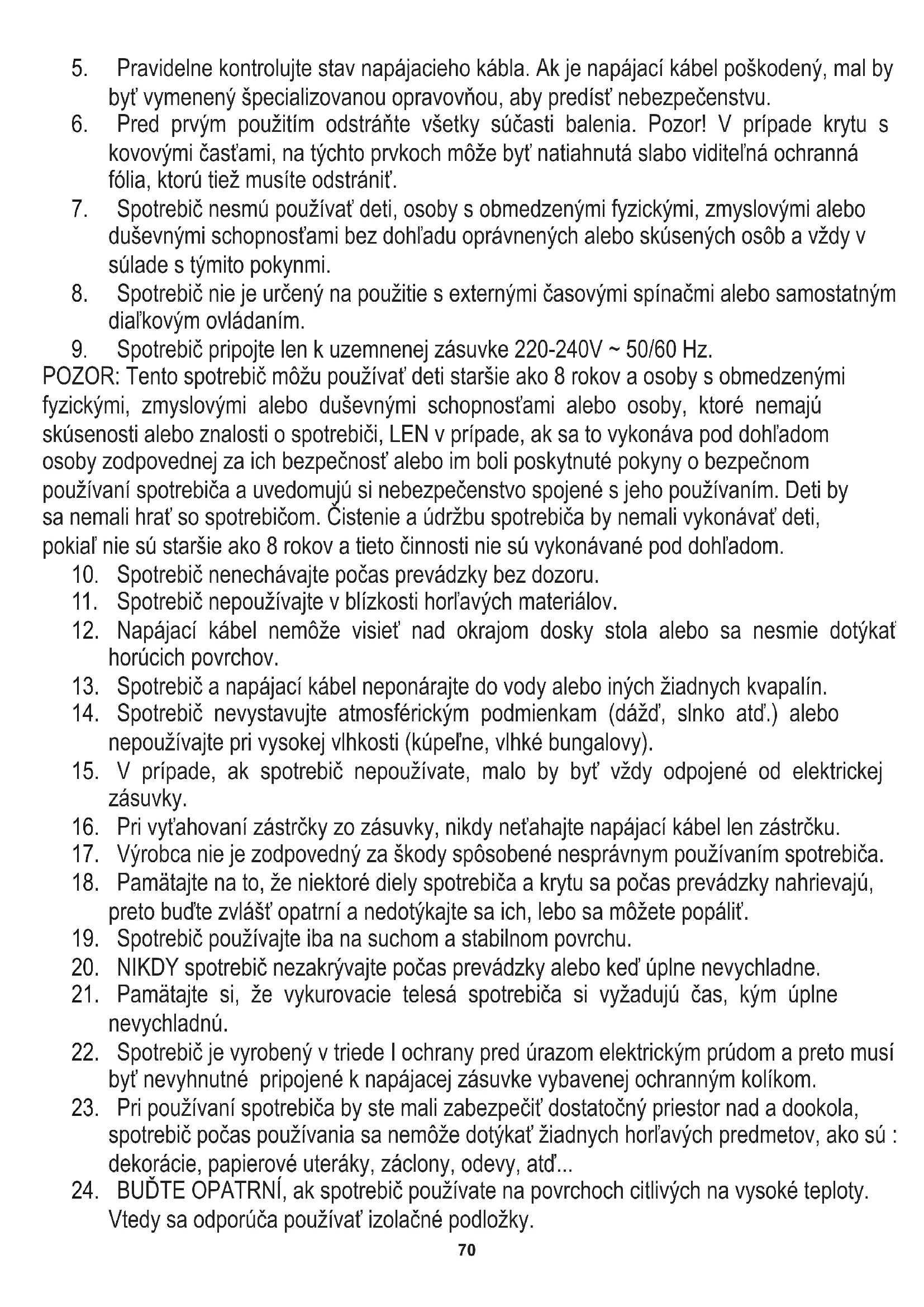 - Spotrebič pripojte len k uzemnenej zásuvke 220-240V \~ 50/60 Hz.
