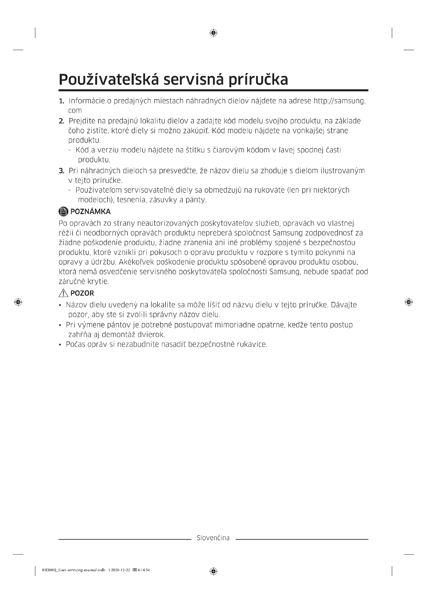 - Počas opráv si nezabudnite nasadiť bezpečnostné rukavice. RB3000J_User-servicing-manual.indb 1 2020-12-22 6:14:54Slovenčina Skutočný vzhľad a uvedené diely chladničky sa môžu líšiť v závislosti od modelu a krajiny.