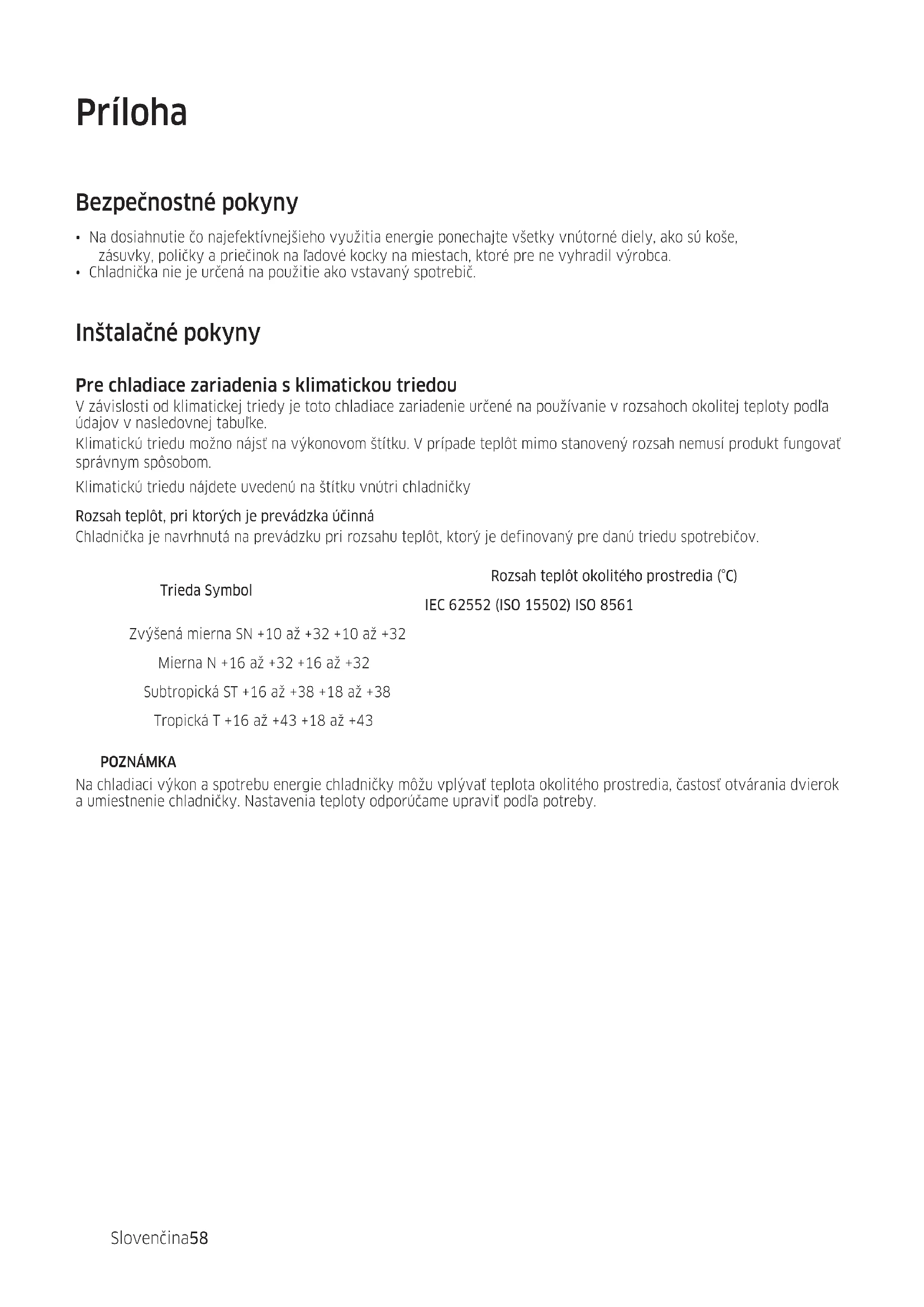 Zvýšená mierna SN +10 až +32 +10 až +32 Mierna N +16 až +32 +16 až +32 Subtropická ST +16 až +38 +18 až +38 Tropická T +16 až +43 +18 až +43 POZNÁMKA Na chladiaci výkon a spotrebu energie chladničky môžu vplývať teplota okolitého prostredia, častosť otvárania dvierok a umiestnenie chladničky. Nastavenia teploty odporúčame upraviť podľa potreby.Slovenčina 59 Pokyny týkajúce sa teploty Odporúčaná teplota Optimálne teplotné nastavenie na skladovanie potravín: