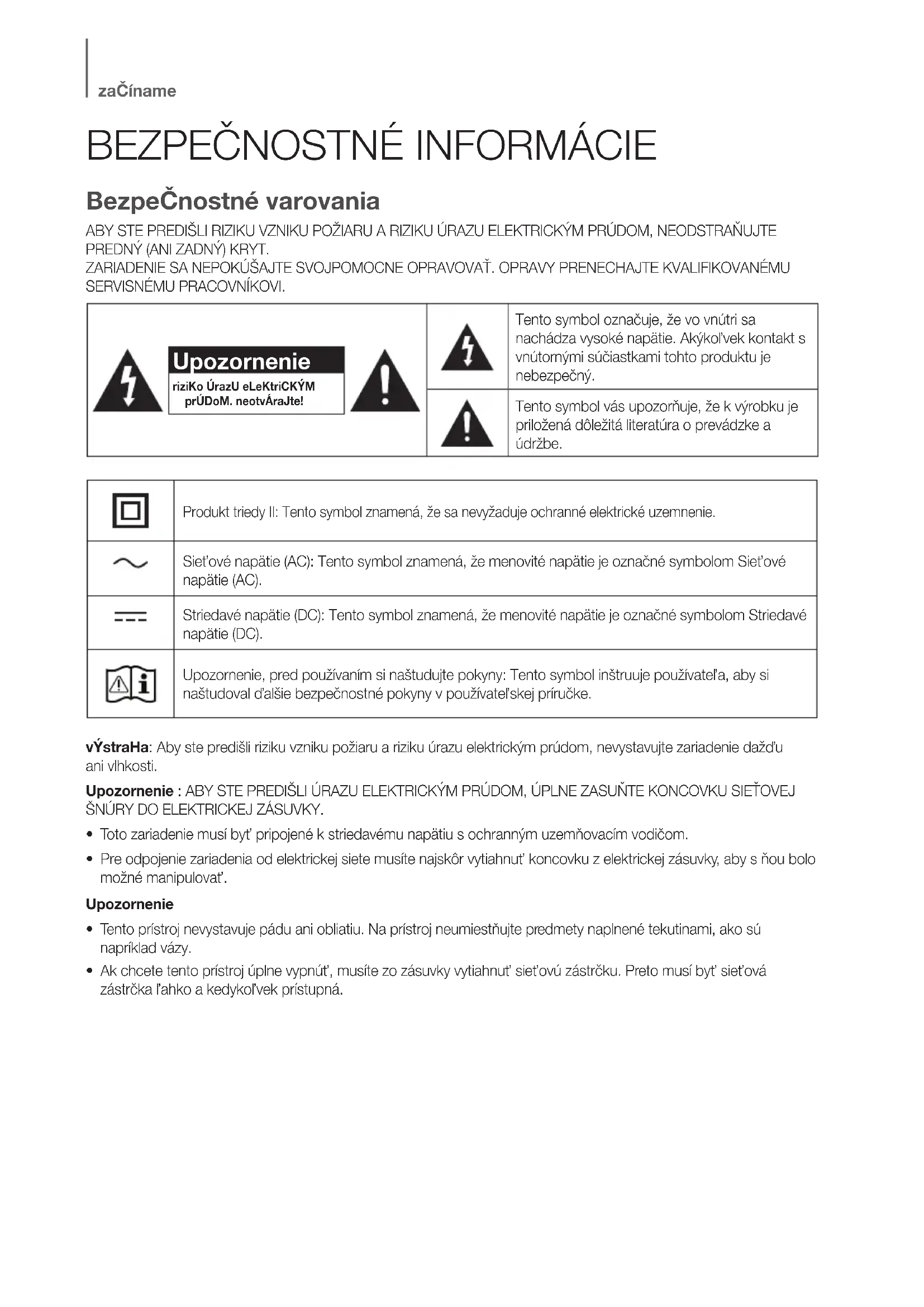 Bezpečnostné varovania ABY STE PREDIŠLI RIZIKU VZNIKU POŽIARU A RIZIKU ÚRAZU ELEKTRICKÝM PRÚDOM, NEODSTRAŇUJTE PREDNÝ (ANI ZADNÝ) KRYT. ZARIADENIE SA NEPOKÚŠAJTE SVOJPOMOCNE OPRAVOVAŤ. OPRAVY PRENECHAJTE KVALIFIKOVANÉMU SERVISNÉMU PRACOVNÍKOVI. Upozornenie riziKo ÚrazU eLeKtriCKÝM prÚDoM. neotvÁraJte!Tento symbol označuje, že vo vnútri sa nachádza vysoké napätie. Akýkoľvek kontakt s vnútornými súčiastkami tohto produktu je nebezpečný.Tento symbol vás upozorňuje, že k výrobku je priložená dôležitá literatúra o prevádzke a údržbe.Produkt triedy II: Tento symbol znamená, že sa nevyžaduje ochranné elektrické uzemnenie.Sieťové napätie (AC): Tento symbol znamená, že menovité napätie je označné symbolom Sieťové napätie (AC).Striedavé napätie (DC): Tento symbol znamená, že menovité napätie je označné symbolom Striedavé napätie (DC).Upozornenie, pred používaním si naštudujte pokyny: Tento symbol inštruuje používateľa, aby si naštudoval ďalšie bezpečnostné pokyny v používateľskej príručke. vÝstraHa: Aby ste predišli riziku vzniku požiaru a riziku úrazu elektrickým prúdom, nevystavujte zariadenie dažďu ani vlhkosti.Upozornenie : ABY STE PREDIŠLI ÚRAZU ELEKTRICKÝM PRÚDOM, ÚPLNE ZASUŇTE KONCOVKU SIEŤOVEJ ŠNÚRY DO ELEKTRICKEJ ZÁSUVKY.