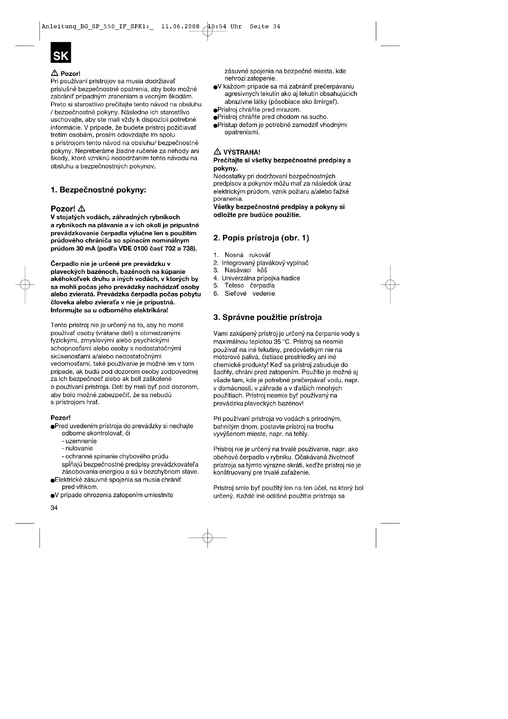 Pozor! V stojatých vodách, záhradných rybníkoch a rybníkoch na plávanie a v ich okolí je prípustné prevádzkovanie čerpadla výlučne len s použitím prúdového chrániča so spínacím nominálnym prúdom 30 mA (podľa VDE 0100 časť 702 a 738). Čerpadlo nie je určené pre prevádzku v plaveckých bazénoch, bazénoch na kúpanie akéhokoľvek druhu a iných vodách, v ktorých by sa mohli počas jeho prevádzky nachádzať osoby alebo zvieratá. Prevádzka čerpadla počas pobytu človeka alebo zvieraťa v nie je prípustná. Informujte sa u odborného elektrikára! Tento prístroj nie je určený na to, aby ho mohli používať osoby (vrátane detí) s obmedzenými fyzickými, zmyslovými alebo psychickými schopnosťami alebo osoby s nedostatočnými skúsenosťami a/alebo nedostatočnými vedomosťami, také používanie je možné len v tom prípade, ak budú pod dozorom osoby zodpovednej za ich bezpečnosť alebo ak boli zaškolené o používaní prístroja. Deti by mali byť pod dozorom, aby bolo možné zabezpečiť, že sa nebudú s prístrojom hrať. Pozor! Pred uvedením prístroja do prevádzky si nechajte odborne skontrolovať, či - uzemnenie - nulovanie - ochranné spínanie chybového prúdu spĺňajú bezpečnostné predpisy prevádzkovateľa zásobovania energiou a sú v bezchybnom stave. Elektrické zásuvné spojenia sa musia chrániť pred vlhkom. V prípade ohrozenia zatopením umiestnite zásuvné spojenia na bezpečné miesta, kde nehrozí zatopenie. V každom prípade sa má zabrániť prečerpávaniu agresívnych tekutín ako aj tekutín obsahujúcich abrazívne látky (pôsobiace ako šmirgeľ). Prístroj chráňte pred mrazom. Prístroj chráňte pred chodom na sucho. Prístup deťom je potrebné zamedziť vhodnými opatreniami. VÝSTRAHA! Prečítajte si všetky bezpečnostné predpisy a pokyny. Nedostatky pri dodržovaní bezpečnostných predpisov a pokynov môžu mať za následok úraz elektrickým prúdom, vznik požiaru a/alebo ťažké poranenia. Všetky bezpečnostné predpisy a pokyny si odložte pre budúce použitie.