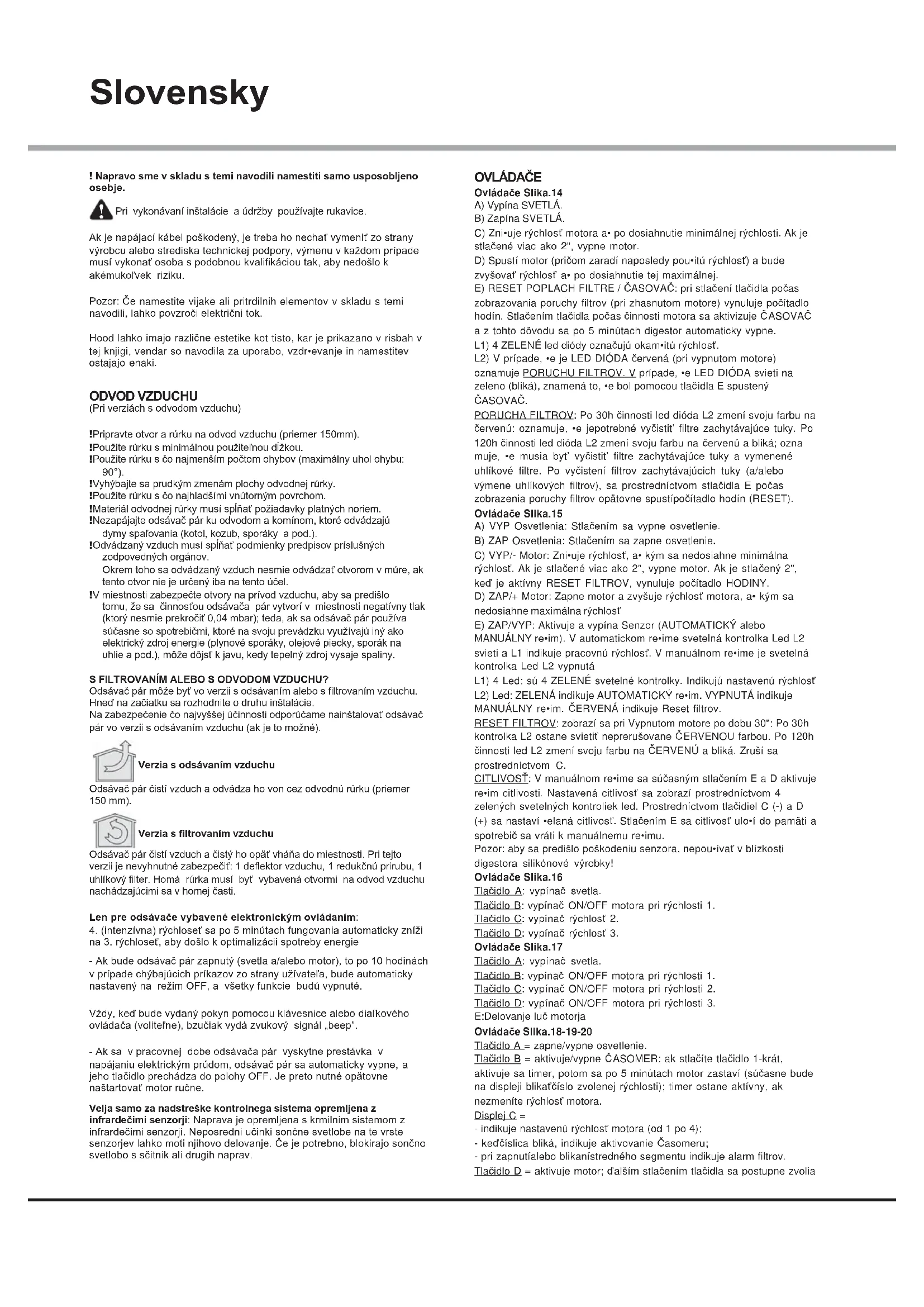 Pri vykonávaní inštalácie a údržby používajte rukavice. Ak je napájací kábel poškodený, je treba ho nechať vymeniť zo strany výrobcu alebo strediska technickej podpory, výmenu v každom prípade musí vykonať osoba s podobnou kvalifikáciou tak, aby nedošlo k akémukoľvek riziku. Pozor: Če namestite vijake ali pritrdilnih elementov v skladu s temi navodili, lahko povzroči električni tok. Hood lahko imajo različne estetike kot tisto, kar je prikazano v risbah v tej knjigi, vendar so navodila za uporabo, vzdr•evanje in namestitev ostajajo enaki. ODVOD VZDUCHU (Pri verziách s odvodom vzduchu) ! Pripravte otvor a rúrku na odvod vzduchu (priemer 150mm). ! Použite rúrku s minimálnou použiteľnou dĺžkou. ! Použite rúrku s čo najmenším počtom ohybov (maximálny uhol ohybu: 90°). ! Vyhýbajte sa prudkým zmenám plochy odvodnej rúrky. ! Použite rúrku s čo najhladšími vnútorným povrchom. ! Materiál odvodnej rúrky musí spĺňať požiadavky platných noriem. ! Nezapájajte odsávač pár ku odvodom a komínom, ktoré odvádzajú dymy spaľovania (kotol, kozub, sporáky a pod.). ! Odvádzaný vzduch musí spĺňať podmienky predpisov príslušných zodpovedných orgánov. Okrem toho sa odvádzaný vzduch nesmie odvádzať otvorom v múre, ak tento otvor nie je určený iba na tento účel. ! V miestnosti zabezpečte otvory na prívod vzduchu, aby sa predišlo tomu, že sa činnosťou odsávača pár vytvorí v miestnosti negatívny tlak (ktorý nesmie prekročiť 0,04 mbar); teda, ak sa odsávač pár používa súčasne so spotrebičmi, ktoré na svoju prevádzku využívajú iný ako elektrický zdroj energie (plynové sporáky, olejové piecky, sporák na uhlie a pod.), môže dôjsť k javu, kedy tepelný zdroj vysaje spaliny. S FILTROVANÍM ALEBO S ODVODOM VZDUCHU? Odsávač pár môže byť vo verzii s odsávaním alebo s filtrovaním vzduchu. Hneď na začiatku sa rozhodnite o druhu inštalácie. Na zabezpečenie čo najvyššej účinnosti odporúčame nainštalovať odsávač pár vo verzii s odsávaním vzduchu (ak je to možné). Verzia s odsávaním vzduchu Odsávač pár čistí vzduch a odvádza ho von cez odvodnú rúrku (priemer 150 mm). Verzia s filtrovaním vzduchu Odsávač pár čistí vzduch a čistý ho opäť vháňa do miestnosti. Pri tejto verzii je nevyhnutné zabezpečiť: 1 deflektor vzduchu, 1 redukčnú prirubu, 1 uhlíkový filter. Homá rúrka musí byť vybavená otvormi na odvod vzduchu nachádzajúcimi sa v homej časti. Len pre odsávače vybavené elektronickým ovládaním: