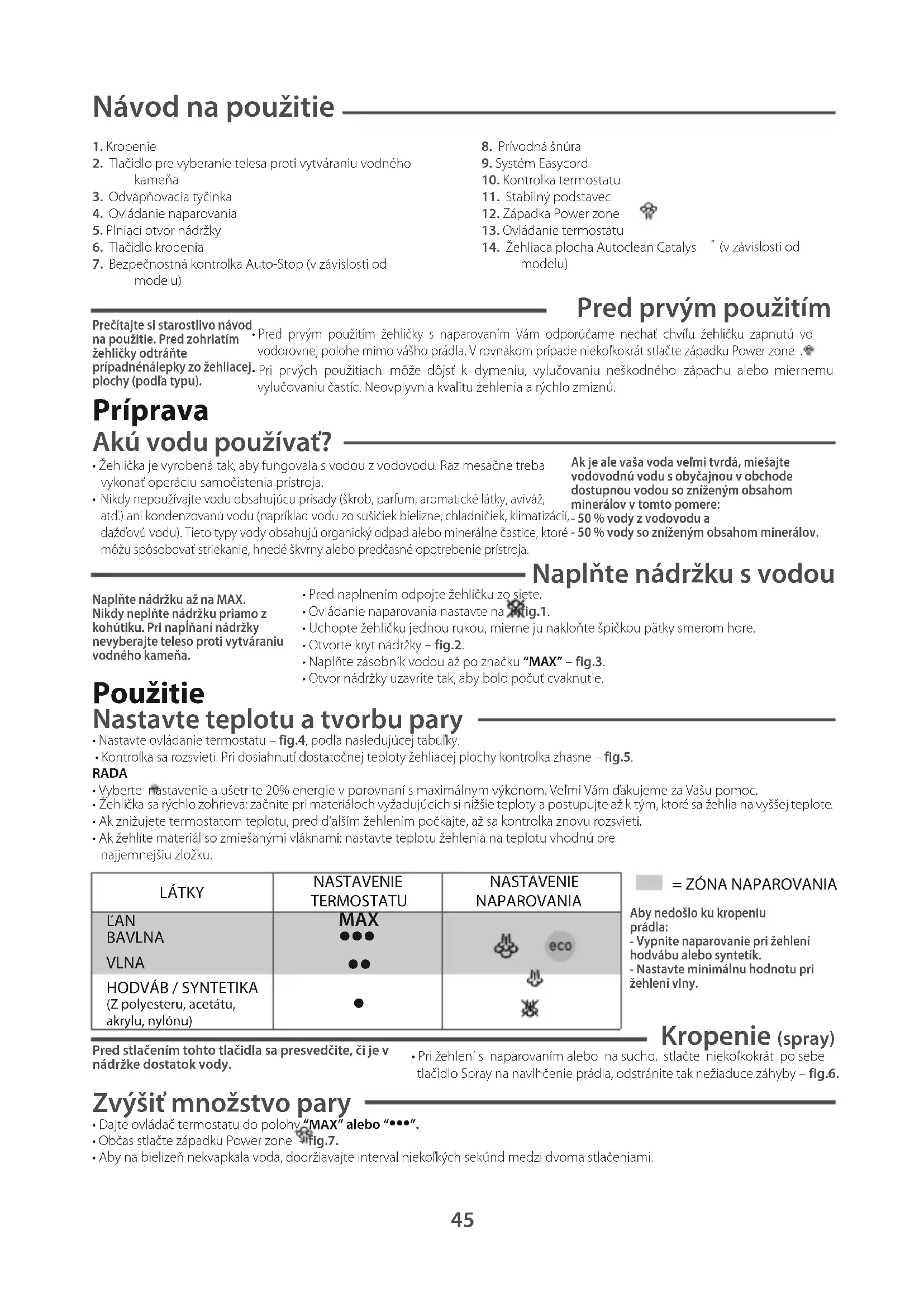 Návod na použitie 1. Kropenie2. Tlačidlo pre vyberanie telesa proti vytváraniu vodnéhokameňa 3. Odvápňovacia tyčinka4. Ovládanie naparovania5. Plniaci otvor nádržky6. TIačidIo kropenia7. Bezpečnostná kontrolka Auto-Stop (v závislosti odmodelu)8. Prívodná šnúra9. Systém Easycord10. Kontrolka termostatu11. Stabilný podstavec12. Západka Power zone 13. Ovládanie termostatu14. Žehliaca plocha Autoclean Catalys (v závislosti odmodelu) Pred prvým použitím