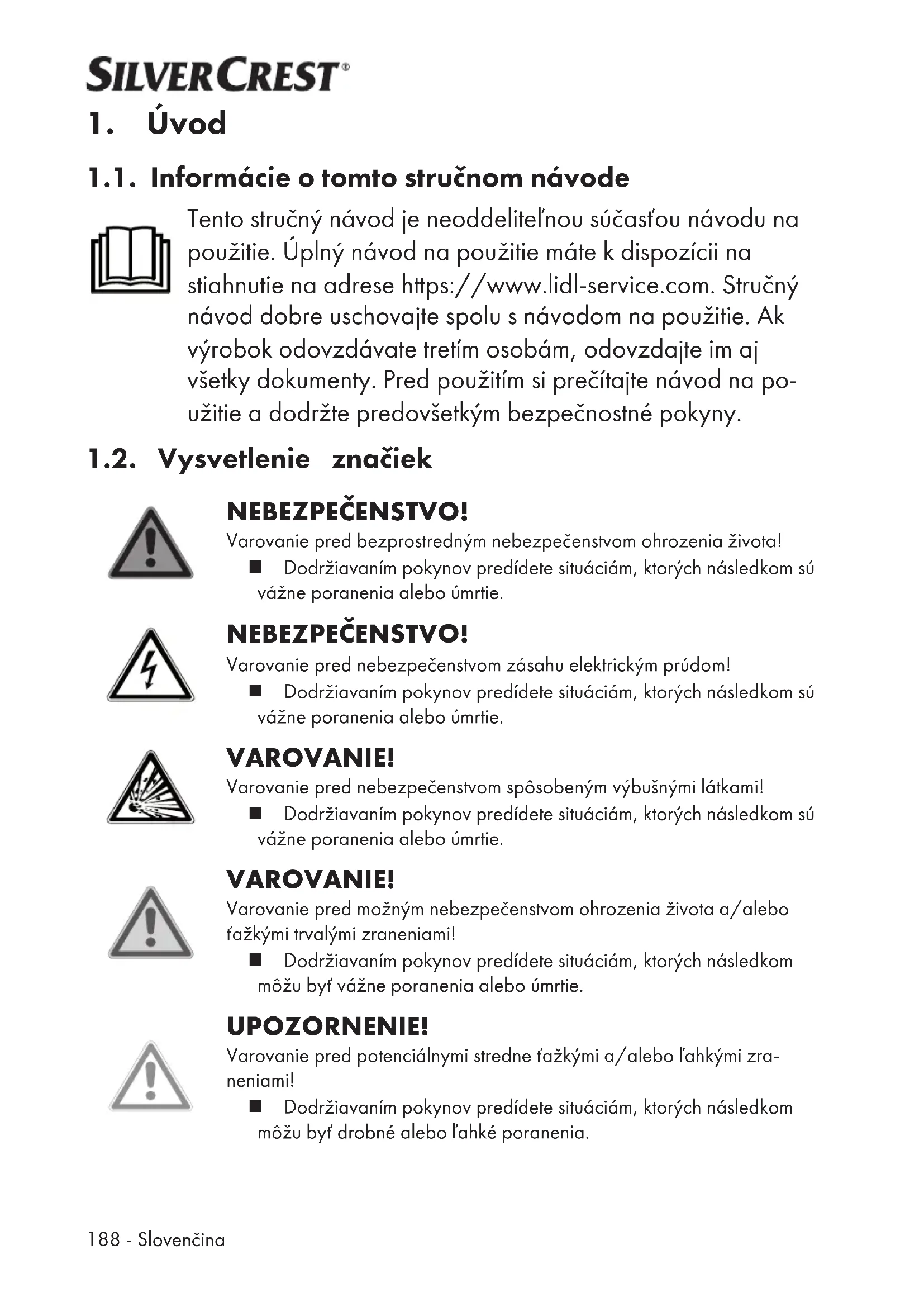1.1. Informácie otomto stručnom návode Tento stručný návod je neoddeliteľnou súčasťou návodu na použitie. Úplný návod na použitie máte kdispozícii na stiahnutie na adrese https://www.lidl-service.com. Stručný návod dobre uschovajte spolu snávodom na použitie. Ak výrobok odovzdávate tretím osobám, odovzdajte im aj všetky dokumenty. Pred použitím si prečítajte návod na po- užitie adodržte predovšetkým bezpečnostné pokyny. 1.2. Vysvetlenie značiek NEBEZPEČENSTVO! Varovanie pred bezprostredným nebezpečenstvom ohrozenia života! Dodržiavaním pokynov predídete situáciám, ktorých následkom sú vážne poranenia alebo úmrtie. NEBEZPEČENSTVO! Varovanie pred nebezpečenstvom zásahu elektrickým prúdom! Dodržiavaním pokynov predídete situáciám, ktorých následkom sú vážne poranenia alebo úmrtie. VAROVANIE! Varovanie pred nebezpečenstvom spôsobeným výbušnými látkami! Dodržiavaním pokynov predídete situáciám, ktorých následkom sú vážne poranenia alebo úmrtie. VAROVANIE! Varovanie pred možným nebezpečenstvom ohrozenia života a/alebo ťažkými trvalými zraneniami! Dodržiavaním pokynov predídete situáciám, ktorých následkom môžu byť vážne poranenia alebo úmrtie. UPOZORNENIE! Varovanie pred potenciálnymi stredne ťažkými a/alebo ľahkými zra- neniami! Dodržiavaním pokynov predídete situáciám, ktorých následkom môžu byť drobné alebo ľahké poranenia.Slovenčina -189 OZNÁMENIE! Dodržujte pokyny, aby ste predišli materiálnym škodám! Dodržiavaním pokynov predídete situáciám, ktorých následkom môžu byť materiálne škody. Poznámky k montáži alebo prevádzke Dodržujte pokyny uvedené vnávode na obsluhu!