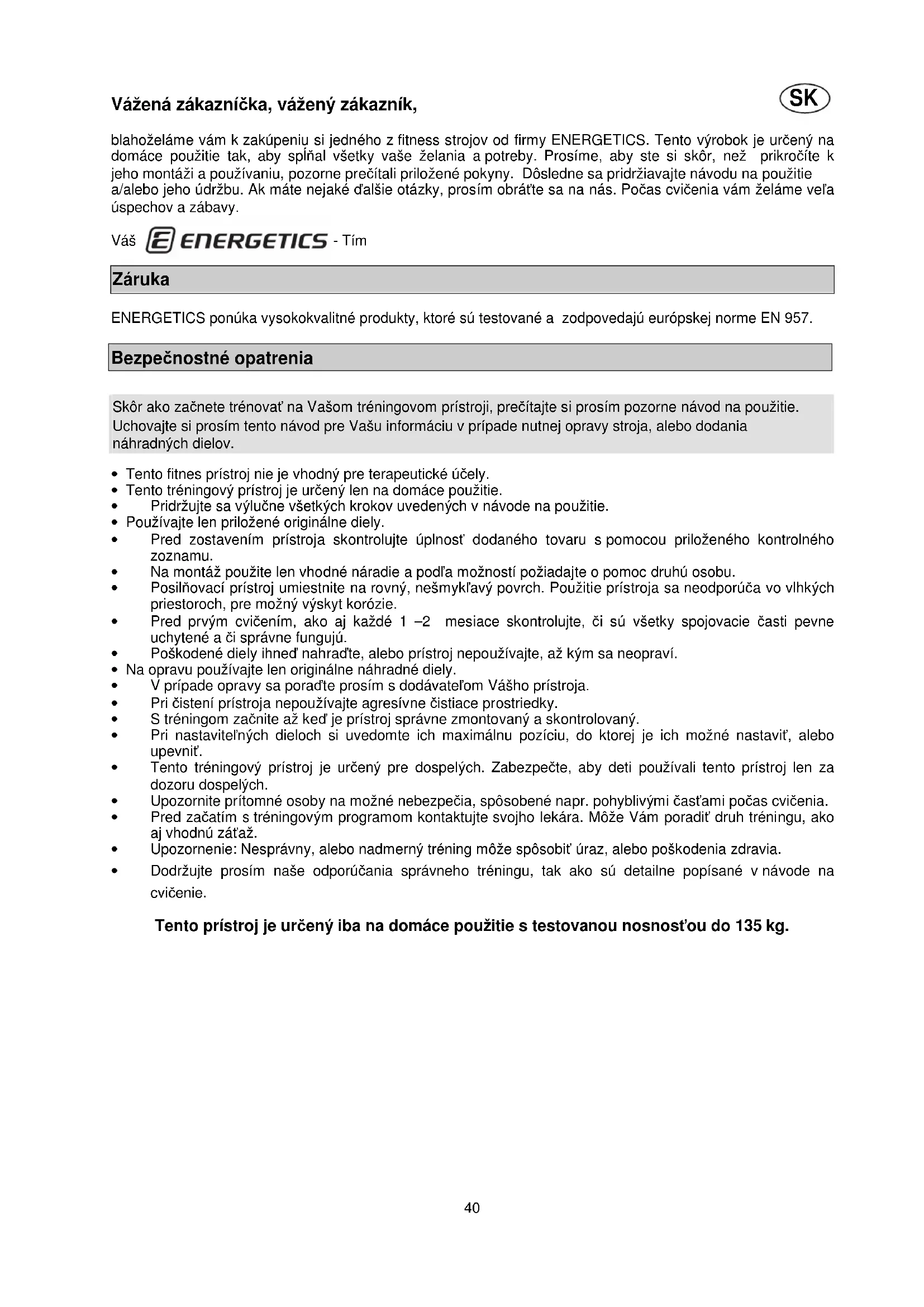 Vážená zákazníčka, vážený zákazník, blahoželáme vám k zakúpeniu si jedného z fitness strojov od firmy ENERGETICS. Tento výrobok je určený na domáce použitie tak, aby spĺňal všetky vaše želania a potreby. Prosíme, aby ste si skôr, než prikročíte k jeho montáži a používaniu, pozorne prečítali priložené pokyny. Dôsledne sa pridržiavajte návodu na použitie a/alebo jeho údržbu. Ak máte nejaké ďalšie otázky, prosím obráťte sa na nás. Počas cvičenia vám želáme veľa úspechov a zábavy. Váš - Tím Záruka ENERGETICS ponúka vysokokvalitné produkty, ktoré sú testované a zodpovedajú európskej norme EN 957. Bezpečnostné opatrenia