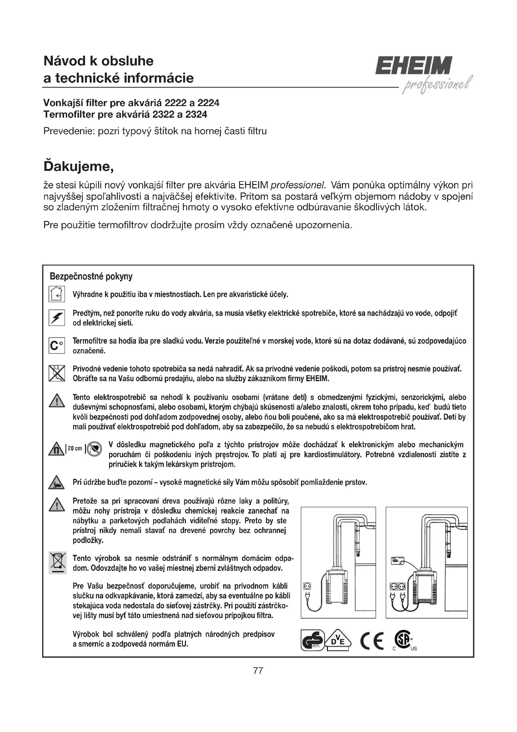°77 Návod k obsluhe a technické informácie Vonkajší filter pre akváriá 2222 a 2224 Termofilter pre akváriá 2322 a 2324 Prevedenie: pozri typový štítok na hornej časti filtru Ďakujeme, že stesi kúpili nový vonkajśí filter pre akvária EHEIM professionel. Vám ponúka optimálny výkon pri najvyššej spoľahlivosti a najväčšej efektivite. Pritom sa postará veľkým objemom nádoby v spojení so zladeným zložením filtračnej hmoty o vysoko efektívne odbúravanie škodlivých látok. Pre použitie termofiltrov dodržujte prosím vždy označené upozornenia. Bezpečnostné pokyny Výhradne k použitiu iba v miestnostiach. Len pre akvaristické účely.Predtým, než ponoríte ruku do vody akvária, sa musia všetky elektrické spotrebiče, ktoré sa nachádzajú vo vode, odpojiťod elektrickej sieti. Termofiltre sa hodia iba pre sladkú vodu. Verzie použiteľné v morskej vode, ktoré sú na dotaz dodávané, sú zodpovedajúco označené.Prívodné vedenie tohoto spotrebiča sa nedá nahradiť. Ak sa prívodné vedenie poškodí, potom sa prístroj nesmie používať.Obráťte sa na Vašu odbornú predajňu, alebo na služby zákazníkom firmy EHEIM. Tento elektrospotrebič sa nehodí k používaniu osobami (vrátane detí) s obmedzenými fyzickými, senzorickými, alebo duševnými schopnosťami, alebo osobami, ktorým chýbajú skúsenosti a/alebo znalosti, okrem toho prípadu, keď budú tietokvôli bezpečnosti pod dohľadom zodpovednej osoby, alebo ňou boli poučené, ako sa má elektrospotrebič používať. Deti bymali používať elektrospotrebič pod dohľadom, aby sa zabezpečilo, že sa nebudú s elektrospotrebičom hrat.V dôsledku magnetického poľa z týchto prístrojov môže dochádzať k elektronickým alebo mechanickým poruchám či poškodeniu iných pręstrojov. To platí aj pre kardiostimulátory. Potrebné vzdialenosti zistíte z príručiek k takým lekárskym prístrojom.Pri údržbe buďte pozorní – vysoké magnetické sily Vám môžu spôsobiť pomliaždenie prstov. Pretože sa pri spracovaní dreva používajú rôzne laky a politúry, môžu nohy prístroja v dôsledku chemickej reakcie zanechať na nábytku a parketových podlahách viditeľné stopy. Preto by steprístroj nikdy nemali stavať na drevené povrchy bez ochrannejpodložky.Tento výrobok sa nesmie odstrániť s normálnym domácim odpa-dom. Odovzdajte ho vo vašej miestnej zberni zvláštnych odpadov.Pre Vašu bezpečnosť doporučujeme, urobiť na prívodnom kábli slučku na odkvapkávanie, ktorá zamedzí, aby sa eventuálne po kábli stekajúca voda nedostala do sieťovej zástrčky. Pri použití zástrčko-vej lišty musí byť táto umiestnená nad sieťovou prípojkou filtra.Výrobok bol schválený podľa platných národných predpisova smerníc a zodpovedá normám EU.
