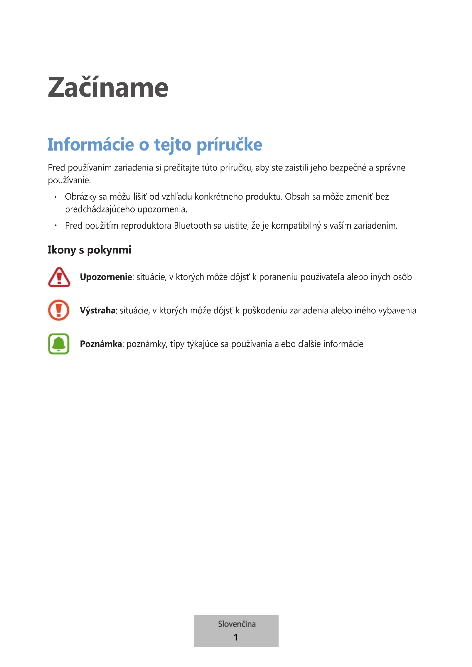 Začíname Informácie o tejto príručke Pred používaním zariadenia si prečítajte túto príručku, aby ste zaistili jeho bezpečné a správne používanie. Obrázky sa môžu líšiť od vzhľadu konkrétneho produktu. Obsah sa môže zmeniť bez predchádzajúceho upozornenia. Pred použitím reproduktora Bluetooth sa uistite, že je kompatibilný s vaším zariadením. Ikony s pokynmi Upozornenie: situácie, v ktorých môže dôjsť k poraneniu používateľa alebo iných osôbVýstraha: situácie, v ktorých môže dôjsť k poškodeniu zariadenia alebo iného vybaveniaPoznámka: poznámky, tipy týkajúce sa používania alebo ďalšie informácie Slovenčina 1Začíname