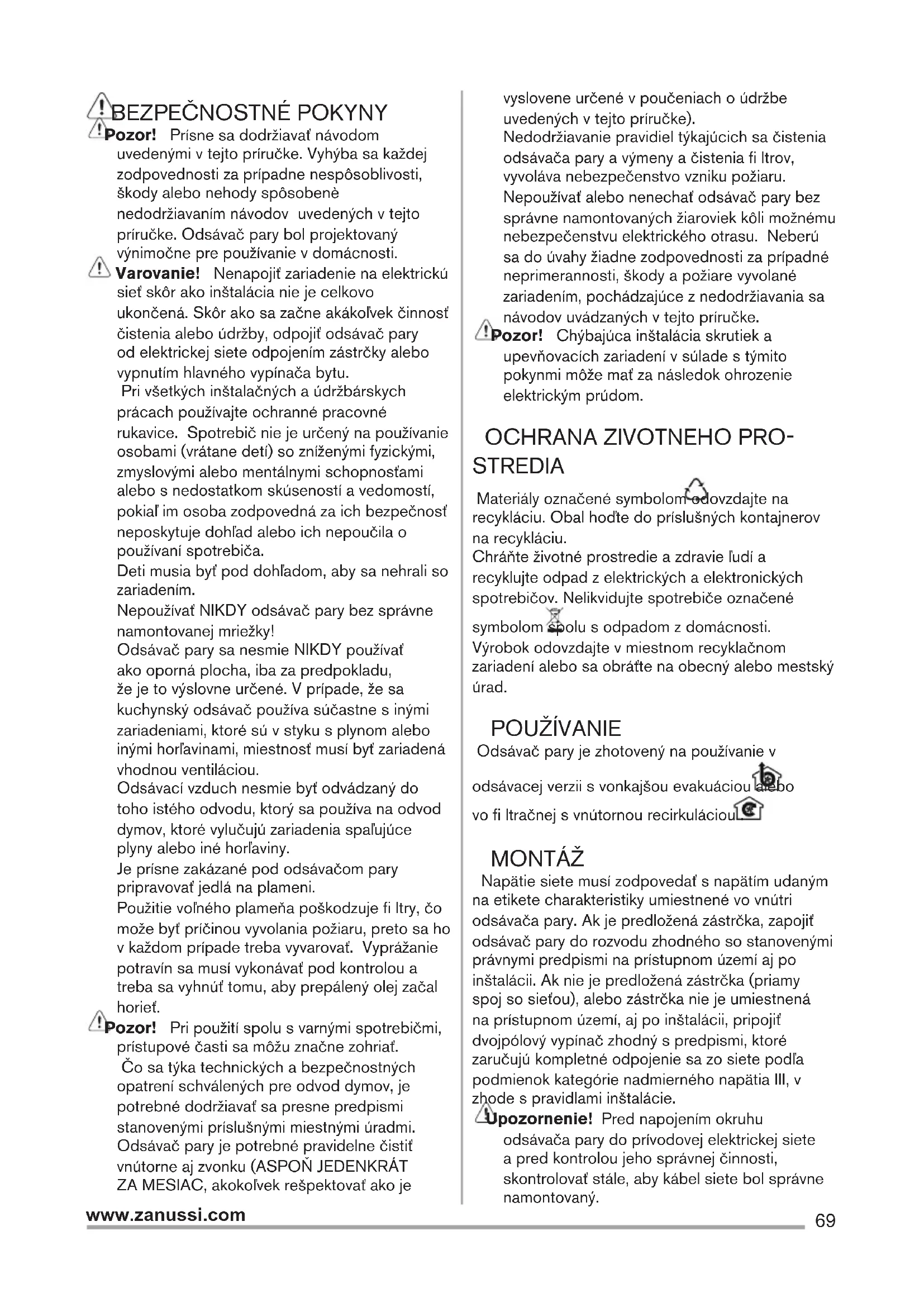STREDIA Materiály označené symbolom odovzdajte na recykláciu. Obal hoďte do príslušných kontajnerov na recykláciu. Chráňte životné prostredie a zdravie ľudí a recyklujte odpad z elektrických a elektronických spotrebičov. Nelikvidujte spotrebiče označené symbolom spolu s odpadom z domácnosti. Výrobok odovzdajte v miestnom recyklačnom zariadení alebo sa obráťte na obecný alebo mestský úrad. POUŽÍVANIE Odsávač pary je zhotovený na používanie v odsávacej verzii s vonkajšou evakuáciou alebo vo fi ltračnej s vnútornou recirkuláciou . MONTÁŽ Napätie siete musí zodpovedať s napätím udaným na etikete charakteristiky umiestnené vo vnútri odsávača pary. Ak je predložená zástrčka, zapojiť odsávač pary do rozvodu zhodného so stanovenými právnymi predpismi na prístupnom území aj po inštalácii. Ak nie je predložená zástrčka (priamy spoj so sieťou), alebo zástrčka nie je umiestnená na prístupnom území, aj po inštalácii, pripojiť dvojpólový vypínač zhodný s predpismi, ktoré zaručujú kompletné odpojenie sa zo siete podľa podmienok kategórie nadmierného napätia III, v zhode s pravidlami inštalácie. Upozornenie! Pred napojením okruhu odsávača pary do prívodovej elektrickej siete a pred kontrolou jeho správnej činnosti, skontrolovať stále, aby kábel siete bol správne namontovaný.70 www.zanussi.com Minimálna vzdialenosť medzi povrchom podstavca pre nádoby na kuchynskom sporáku a najspodnejšej časti kuchynského odsávača pary nesmie byť kratšia ako 43cm v prípade elektrického sporáka a ako 65cm v prípade plynového alebo kombinovaného sporáka. Ak návody kuchynského plynového aparátu uvádzajú väčšiu vzdialenosť, je ptrebné s tým počítať. ÚDRŽBA Skôr ako začína ktorákoľvek údržba, odpojiť odsávač pary z elektrického vedenia. Odsávač pary sa pravidelne čistí zvonku aj zvnútra (aspoň rovnako častým opakovaním ako sa vykonáva údržba fi ltrov tuku). Na čistenie používať vlhké plátno s neutrálnymi tekutými čistiacími prostriedkami. Vyhnúť sa používania prostriedkov obsahujúcich škrabacie látky. NEPOUŽÍVAŤ ALKOHOL! Upozornenie! Nedodržanie noriem na čistenie zariadenia a výmenu fi ltrov predstavuje riziko požiaru. Odporúča sa preto dodržiavať uvedené pokyny. Odmieta sa akákoľvek zodpovednosť za prípadné škody na motore, požiare vyvolané nesprávnou údržbou alebo nedodržaním vyššie uvedených upozornení. Protitukový fi lter - Musí byť čistený jedenkrát za mesiac s nedráždivými čistiacími prostriedkami, ručne alebo v umývačke riadu s nízkou teplotou a s krátkym umývacím cyklom. Umývaním v umývačke riadu, protitukový kovový fi lter môže vyblednúť, ale jeho fi ltračné vlastnosti sa tým vôbec nezmenia. Aktívno uhlíkový fi lter NIE umývateľný Nasýteľnosť uhoľného fi ltru sa odhaľuje iba po viac- menej predľženom použití, na základe typu kuchyne a pravidelnosti čistenia fi ltra tukov. V každom prípade je nevyhnutné vymeniť zásobník maximálne každé štyri mesiace. NEMÔŽE byť umývaný alebo regenerovaný. Clack!
