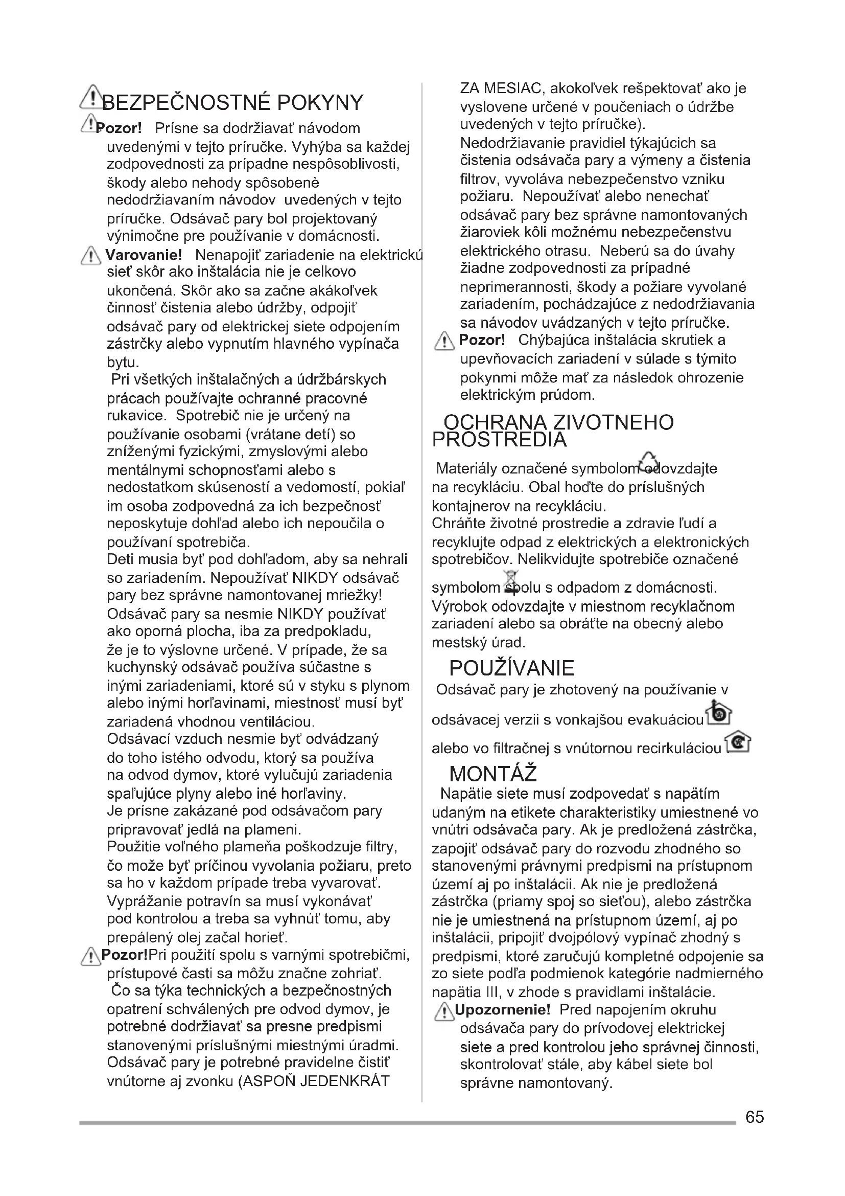 Pozor! Prísne sa dodržiavať návodom uvedenými v tejto príručke. Vyhýba sa každej zodpovednosti za prípadne nespôsoblivosti, škody alebo nehody spôsobenè nedodržiavaním návodov uvedených v tejto príručke. Odsávač pary bol projektovaný výnimočne pre používanie v domácnosti. Varovanie! Nenapojiť zariadenie na elektrickú sieť skôr ako inštalácia nie je celkovo ukončená. Skôr ako sa začne akákoľvek činnosť čistenia alebo údržby, odpojiť odsávač pary od elektrickej siete odpojením zástrčky alebo vypnutím hlavného vypínača bytu. Pri všetkých inštalačných a údržbárskych prácach používajte ochranné pracovné rukavice. Spotrebič nie je určený na používanie osobami (vrátane detí) so zníženými fyzickými, zmyslovými alebo mentálnymi schopnosťami alebo s nedostatkom skúseností a vedomostí, pokiaľ im osoba zodpovedná za ich bezpečnosť neposkytuje dohľad alebo ich nepoučila o používaní spotrebiča. Deti musia byť pod dohľadom, aby sa nehrali so zariadením. Nepoužívať NIKDY odsávač pary bez správne namontovanej mriežky! Odsávač pary sa nesmie NIKDY používať ako oporná plocha, iba za predpokladu, že je to výslovne určené. V prípade, že sa kuchynský odsávač používa súčastne s inými zariadeniami, ktoré sú v styku s plynom alebo inými horľavinami, miestnosť musí byť zariadená vhodnou ventiláciou. Odsávací vzduch nesmie byť odvádzaný do toho istého odvodu, ktorý sa používa na odvod dymov, ktoré vylučujú zariadenia spaľujúce plyny alebo iné horľaviny. Je prísne zakázané pod odsávačom pary pripravovať jedlá na plameni. Použitie voľného plameňa poškodzuje filtry, čo može byť príčinou vyvolania požiaru, preto sa ho v každom prípade treba vyvarovať. Vyprážanie potravín sa musí vykonávať pod kontrolou a treba sa vyhnúť tomu, aby prepálený olej začal horieť. Pozor! Pri použití spolu s varnými spotrebičmi, prístupové časti sa môžu značne zohriať. Čo sa týka technických a bezpečnostných opatrení schválených pre odvod dymov, je potrebné dodržiavať sa presne predpismi stanovenými príslušnými miestnými úradmi. Odsávač pary je potrebné pravidelne čistiť vnútorne aj zvonku (ASPOŇ JEDENKRÁT ZA MESIAC, akokoľvek rešpektovať ako je vyslovene určené v poučeniach o údržbe uvedených v tejto príručke). Nedodržiavanie pravidiel týkajúcich sa čistenia odsávača pary a výmeny a čistenia filtrov, vyvoláva nebezpečenstvo vzniku požiaru. Nepoužívať alebo nenechať odsávač pary bez správne namontovaných žiaroviek kôli možnému nebezpečenstvu elektrického otrasu. Neberú sa do úvahy žiadne zodpovednosti za prípadné neprimerannosti, škody a požiare vyvolané zariadením, pochádzajúce z nedodržiavania sa návodov uvádzaných v tejto príručke. Pozor! Chýbajúca inštalácia skrutiek a upevňovacích zariadení v súlade s týmito pokynmi môže mať za následok ohrozenie elektrickým prúdom. OCHRANA ZIVOTNEHO PROSTREDIA Materiály označené symbolom odovzdajte na recykláciu. Obal hoďte do príslušných kontajnerov na recykláciu. Chráňte životné prostredie a zdravie ľudí a recyklujte odpad z elektrických a elektronických spotrebičov. Nelikvidujte spotrebiče označené symbolom spolu s odpadom z domácnosti. Výrobok odovzdajte v miestnom recyklačnom zariadení alebo sa obráťte na obecný alebo mestský úrad. POUŽÍVANIE Odsávač pary je zhotovený na používanie v odsávacej verzii s vonkajšou evakuáciou alebo vo filtračnej s vnútornou recirkuláciou . MONTÁŽ Napätie siete musí zodpovedať s napätím udaným na etikete charakteristiky umiestnené vo vnútri odsávača pary. Ak je predložená zástrčka, zapojiť odsávač pary do rozvodu zhodného so stanovenými právnymi predpismi na prístupnom území aj po inštalácii. Ak nie je predložená zástrčka (priamy spoj so sieťou), alebo zástrčka nie je umiestnená na prístupnom území, aj po inštalácii, pripojiť dvojpólový vypínač zhodný s predpismi, ktoré zaručujú kompletné odpojenie sa zo siete podľa podmienok kategórie nadmierného napätia III, v zhode s pravidlami inštalácie. Upozornenie! Pred napojením okruhu odsávača pary do prívodovej elektrickej siete a pred kontrolou jeho správnej činnosti, skontrolovať stále, aby kábel siete bol správne namontovaný.66 Minimálna vzdialenosť medzi povrchom podstavca pre nádoby na kuchynskom sporáku a najspodnejšej časti kuchynského odsávača pary nesmie byť kratšia ako 43cm v prípade elektrického sporáka a ako 65cm v prípade plynového alebo kombinovaného sporáka. Ak návody kuchynského plynového aparátu uvádzajú väčšiu vzdialenosť, je ptrebné s tým počítať. ÚDRŽBA Skôr ako začína ktorákoľvek údržba, odpojiť odsávač pary z elektrického vedenia. Odsávač pary sa pravidelne čistí zvonku aj zvnútra (aspoň rovnako častým opakovaním ako sa vykonáva údržba filtrov tuku). Na čistenie používať vlhké plátno s neutrálnymi tekutými čistiacími prostriedkami. Vyhnúť sa používania prostriedkov obsahujúcich škrabacie látky. NEPOUŽÍVAŤ ALKOHOL! Upozornenie! Nedodržanie noriem na čistenie zariadenia a výmenu filtrov predstavuje riziko požiaru. Odporúča sa preto dodržiavať uvedené pokyny. Odmieta sa akákoľvek zodpovednosť za prípadné škody na motore, požiare vyvolané nesprávnou údržbou alebo nedodržaním vyššie uvedených upozornení. Protitukový filter - Musí byť čistený jedenkrát za mesiac s nedráždivými čistiacími prostriedkami, ručne alebo v umývačke riadu s nízkou teplotou a s krátkym umývacím cyklom. Umývaním v umývačke riadu, protitukový kovový filter môže vyblednúť, ale jeho filtračné vlastnosti sa tým vôbec nezmenia. Aktívno uhlíkový filter NIE umývateľný Nasýteľnosť uhoľného filtru sa odhaľuje 