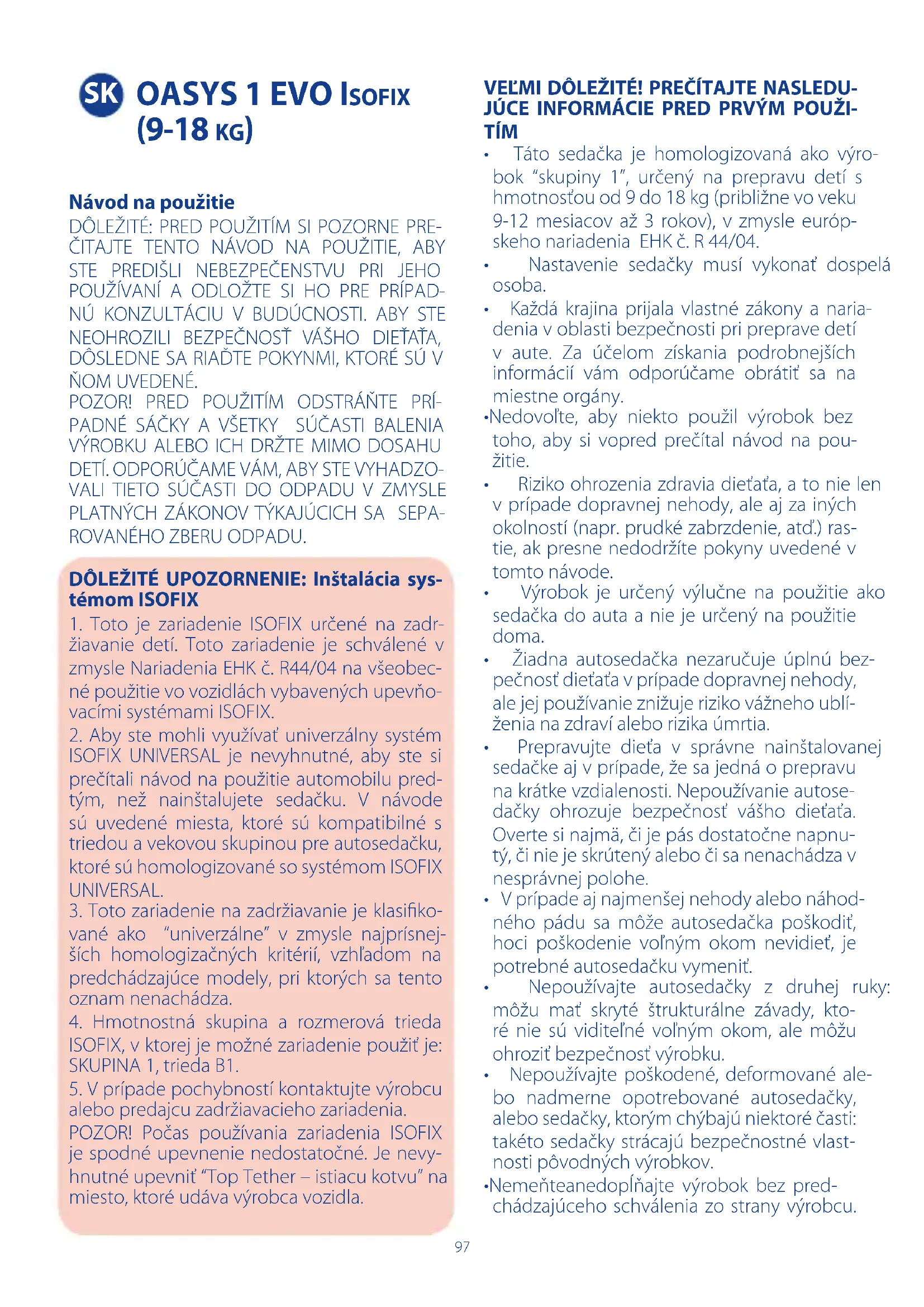 alebo predajcu zadržiavacieho zariadenia. POZOR! Počas používania zariadenia ISOFIX je spodné upevnenie nedostatočné. Je nevy- hnutné upevniť “Top Tether – istiacu kotvu” na miesto, ktoré udáva výrobca vozidla. VEĽMI DÔLEŽITÉ! PREČÍTAJTE NASLEDU- JÚCE INFORMÁCIE PRED PRVÝM POUŽI- TÍM