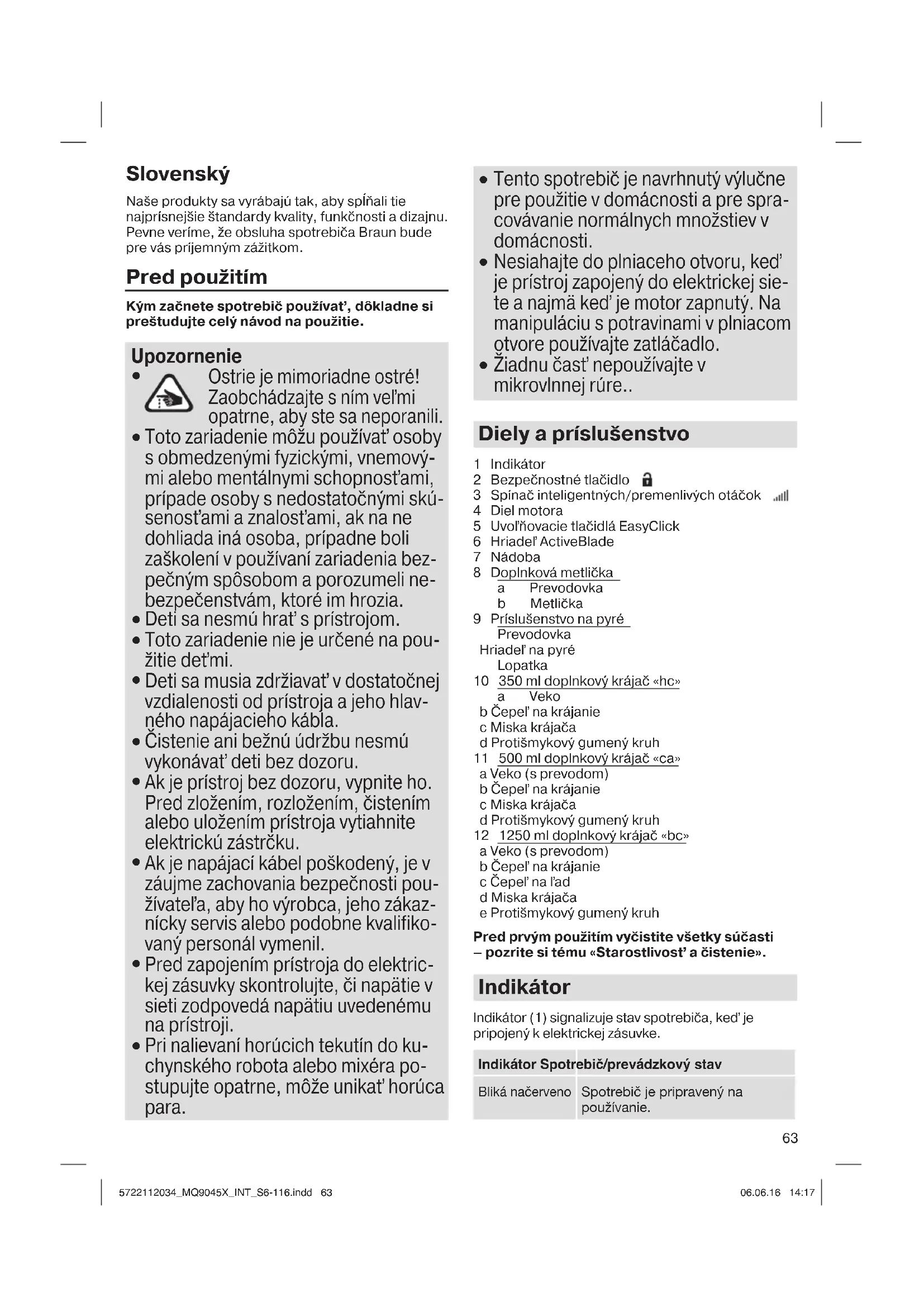 Žiadnu časť nepoužívajte v mikrovlnnej rúre.. Diely a príslušenstvo 1 Indikátor 2 Bezpečnostné tlačidlo 3 Spínač inteligentných/premenlivých otáčok 4 Diel motora 5 Uvoľňovacie tlačidlá EasyClick 6 Hriadeľ ActiveBlade 7 Nádoba 8 Doplnková metlička a Prevodovka b Metlička 9 Príslušenstvo na pyré Prevodovka Hriadeľ na pyré Lopatka 10 350 ml doplnkový krájač «hc» a Veko b Čepeľ na krájanie c Miska krájača d Protišmykový gumený kruh 11 500 ml doplnkový krájač «ca» a Veko (s prevodom) b Čepeľ na krájanie c Miska krájača d Protišmykový gumený kruh 12 1250 ml doplnkový krájač «bc» a Veko (s prevodom) b Čepeľ na krájanie c Čepeľ na ľad d Miska krájača e Protišmykový gumený kruh Pred prvým použitím vyčistite všetky súčasti – pozrite si tému «Starostlivosť a čistenie». Indikátor Indikátor (1) signalizuje stav spotrebiča, keď je pripojený k elektrickej zásuvke. Indikátor Spotrebič/prevádzkový stav Bliká načerveno Spotrebič je pripravený na používanie. 5722112034_MQ9045X_INT_S6-116.indd 635722112034_MQ9045X_INT_S6-116.indd 63 06.06.16 14:1706.06.16 14:1764 Svieti nazeleno Spotrebič je uvoľnený (prepínacie tlačidlo uvoľnenia je stlačené) a dá sa zapnúť Svieti načerveno Včasné varovanie pred prehriatím. Otáčky motora postupne klesajú, až kým sa motor nevypne. Zari- adenie nechajte vychladnúť. Keď bude indikátor blikať načerveno, spotrebič je znovu pripravený na použitie. Ak maximálne otáčky klesnú pri vysokom zaťažení a dlhej dobe prevádzky, napriek tomu môžete dokončiť prípravu. Následne by ste však spotrebič mali nechať vychladnúť. Obsluha spotrebiča Spínač inteligentných otáčok pre variabilné otáčky Jedno stlačenie, všetky otáčky. Čím viac stlačíte, tým vyššie budú otáčky. Čím vyššie sú otáčky, tým rýchlejšie a jemnejšie budú výsledky mixovania a krájania. Obsluha jednou rukou: spínač inteligentných otáčok (3) vám umožňuje zapnúť spotrebič a ovládať otáčky jednou rukou. Obsluha ručného mixéra Prvé použitie: Odstráňte prepravnú zámku z dielu motora (4) potiahnutím za červený pásik. Zapnutie (A) Spotrebič sa dodáva vybavený bezpečnostným tlačidlom na uvoľnenie spínača inteligentných otáčok. Ak ho chcete bezpečne zapnúť, dodržiavajte tieto zásady:
