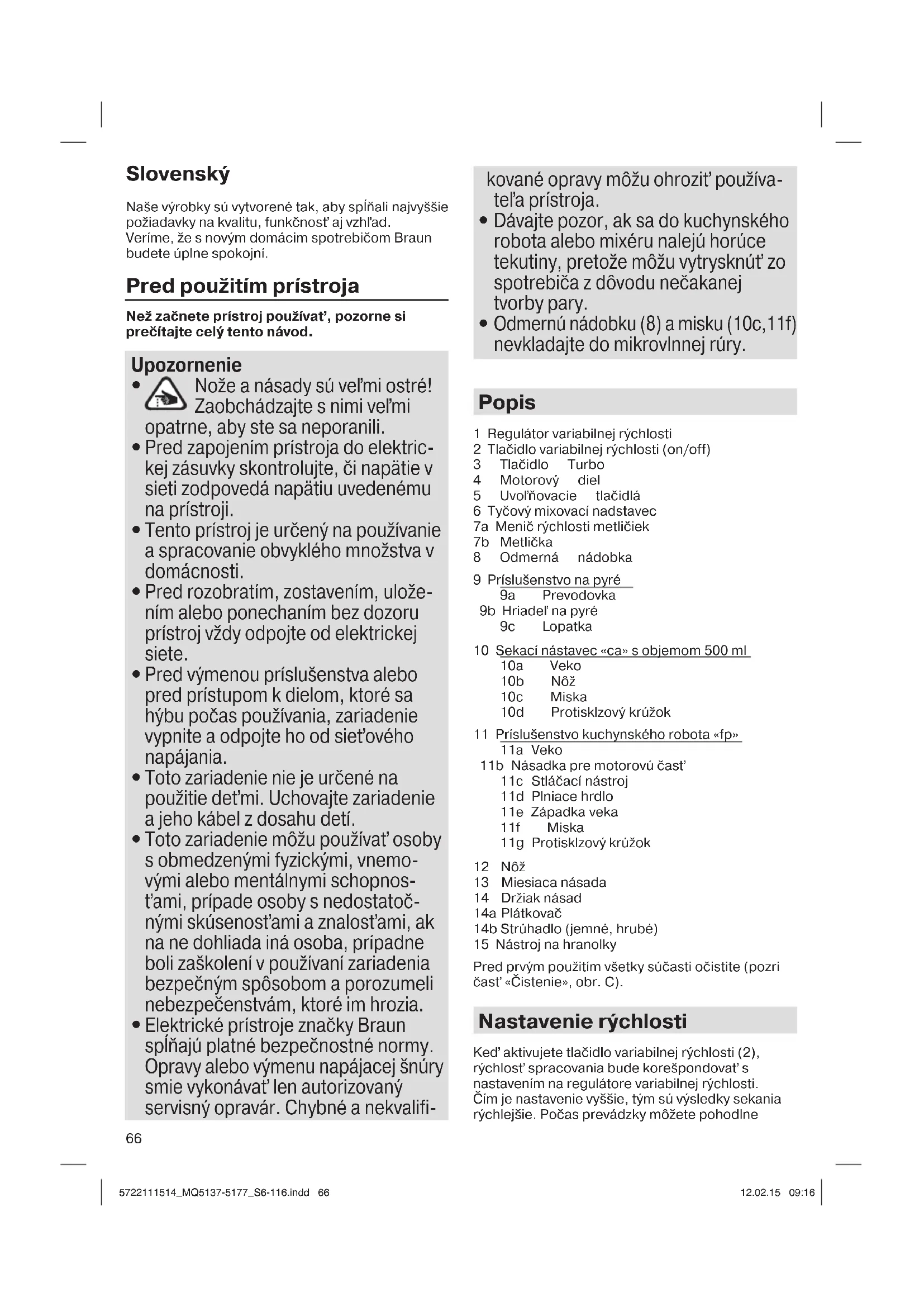 Odmernú nádobku (8) a misku (10c,11f) nevkladajte do mikrovlnnej rúry. Popis 1 Regulátor variabilnej rýchlosti 2 Tlačidlo variabilnej rýchlosti (on/off) 3 Tlačidlo Turbo 4 Motorový diel 5 Uvoľňovacie tlačidlá 6 Tyčový mixovací nadstavec 7a Menič rýchlosti metličiek 7b Metlička 8 Odmerná nádobka 9 Príslušenstvo na pyré 9a Prevodovka 9b Hriadeľ na pyré 9c Lopatka 10 Sekací nástavec «ca» s objemom 500 ml 10a Veko 10b Nôž 10c Miska 10d Protisklzový krúžok 11 Príslušenstvo kuchynského robota «fp» 11a Veko 11b Násadka pre motorovú časť 11c Stláčací nástroj 11d Plniace hrdlo 11e Západka veka 11f Miska 11g Protisklzový krúžok 12 Nôž 13 Miesiaca násada 14 Držiak násad 14a Plátkovač 14b Strúhadlo (jemné, hrubé) 15 Nástroj na hranolky Pred prvým použitím všetky súčasti očistite (pozri časť «Čistenie», obr. C). Nastavenie rýchlosti Keď aktivujete tlačidlo variabilnej rýchlosti (2), rýchlosť spracovania bude korešpondovať s nastavením na regulátore variabilnej rýchlosti. Čím je nastavenie vyššie, tým sú výsledky sekania rýchlejšie. Počas prevádzky môžete pohodlne 5722111514_MQ5137-5177_S6-116.indd 665722111514_MQ5137-5177_S6-116.indd 66 12.02.15 09:1612.02.15 09:1667 nastaviť rýchlosť tak, že otočíte regulátor rýchlosti pomocou palca alebo ukazováka. Avšak maximálna rýchlosť spracovania sa dá dosiahnuť len stlačením tlačidla Turbo (3). Tlačidlo Turbo môžete tiež použiť pre okamžité výkonné impulzy bez toho, aby ste museli manipulovať s regulátorom rýchlosti. Ručný mixér (A) Ručný mixér sa dokonale hodí na prípravu dipov, omáčok, polievok, majonézy a detskej stravy, ako aj na miešanie nápojov alebo mliečnych koktailov. Odporúčame mixovať čo najvyššou rýchlosťou.