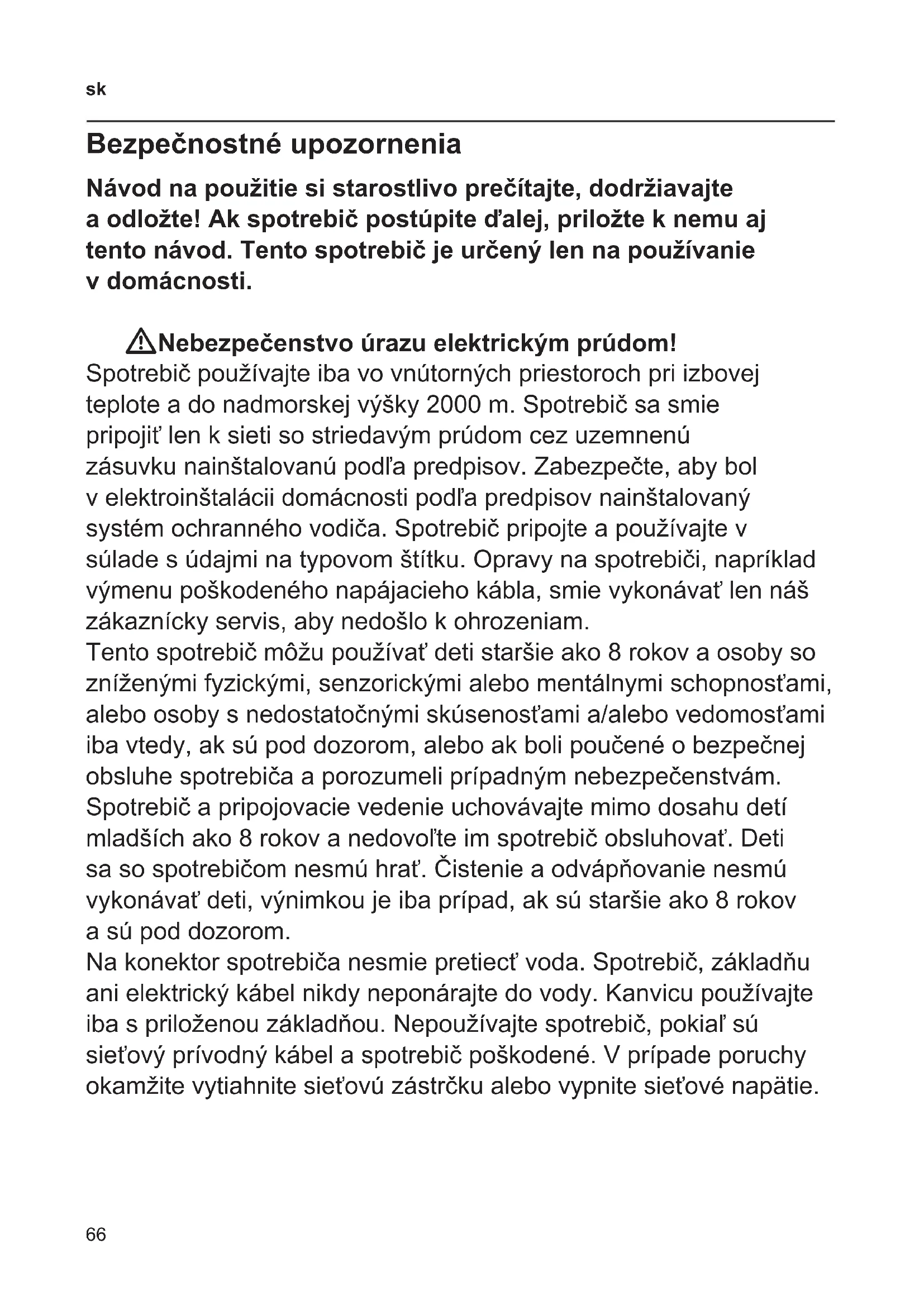 Bezpečnostné upozornenia Návod na použitie si starostlivo prečítajte, dodržiavajte a odložte! Ak spotrebič postúpite ďalej, priložte k nemu aj tento návod. Tento spotrebič je určený len na používanie v domácnosti. WNebezpečenstvo úrazu elektrickým prúdom! Spotrebič používajte iba vo vnútorných priestoroch pri izbovej teplote a do nadmorskej výšky 2000 m. Spotrebič sa smie pripojiť len k sieti so striedavým prúdom cez uzemnenú zásuvku nainštalovanú podľa predpisov. Zabezpečte, aby bol v elektroinštalácii domácnosti podľa predpisov nainštalovaný systém ochranného vodiča. Spotrebič pripojte a používajte v súlade s údajmi na typovom štítku. Opravy na spotrebiči, napríklad výmenu poškodeného napájacieho kábla, smie vykonávať len náš zákaznícky servis, aby nedošlo k ohrozeniam. Tento spotrebič môžu používať deti staršie ako 8 rokov a osoby so zníženými fyzickými, senzorickými alebo mentálnymi schopnosťami, alebo osoby s nedostatočnými skúsenosťami a/alebo vedomosťami iba vtedy, ak sú pod dozorom, alebo ak boli poučené o bezpečnej obsluhe spotrebiča a porozumeli prípadným nebezpečenstvám. Spotrebič a pripojovacie vedenie uchovávajte mimo dosahu detí mladších ako 8 rokov a nedovoľte im spotrebič obsluhovať. Deti sa so spotrebičom nesmú hrať. Čistenie a odvápňovanie nesmú vykonávať deti, výnimkou je iba prípad, ak sú staršie ako 8 rokov a sú pod dozorom. Na konektor spotrebiča nesmie pretiecť voda. Spotrebič, základňu ani elektrický kábel nikdy neponárajte do vody. Kanvicu používajte iba s priloženou základňou. Nepoužívajte spotrebič, pokiaľ sú sieťový prívodný kábel a spotrebič poškodené. V prípade poruchy okamžite vytiahnite sieťovú zástrčku alebo vypnite sieťové napätie.67