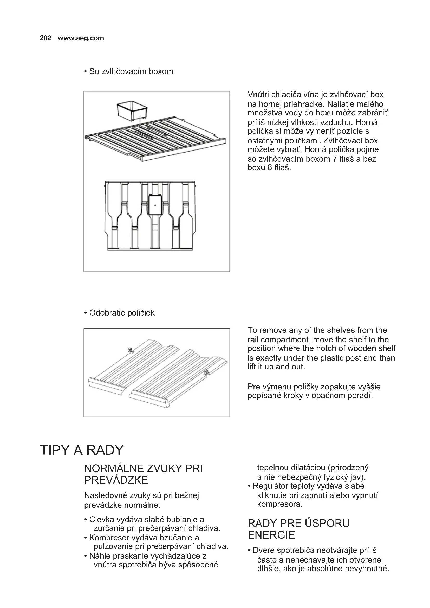 Väčšinavýpadkovprúdujeopravených doniekoľkýchhodínanemaliby ovplyvniťteplotuvášhospotrebičaak obmedzítepočetotváranídverí.Ak budenapájanievypnutépodlhšiudobu, musítevykonaťvhodnékrokynaochranu jehoobsahu.SLOVENSKY 209 Problém Možné príčiny Riešenie Kompresor pracuje nepretržite. Teplotavmiestnostijevyššia akozvyčajne. Overteteplotuvmiestnosti. Dvierkasteotváralipríliš často. Dvierkanenechávajteotvorené dlhšienežjepotrebné. Dvierkaniesúúplne zatvorené. Overte,čisúdvierkaúplne zatvorené. Tesneniedverínetesní správne. Overte stav tesnenia a v prípadnehovyčistitevlhkou špongiousneutrálnymumývacím prostriedkomavodou. Osvetlenie nefunguje. Spotrebičniejezapojený. Zapojtespotrebič. Zasiaholprerušovačokruhu alebojevyhodenápoistka. Zapniteprerušovačokruhualebo vymeňtepoistku. LEDžiarovkajevypálená. Obráťtesanaservisnéstredisko. Tlačidloosvetlenia nefunguje. Obráťtesanaservisnéstredisko. Prílišveľa vibrácií. Skontrolujte,čijevinotéka vovodorovnejpolohe. Vyrovnajtespotrebič. Prílišveľa hluku. Štrkotavýzvukmôže pochádzaťzobtekania chladiva,čojenormálne. Zmršťovaniearozpínanie vnútornýchstienmôže spôsobovaťstrieľajúce apraskajúcezvuky. Akzvukyzosilnejú,obráťte sanaservisnéstredisko. Vinotékaniejevovodorovnej polohe. Vyrovnajtespotrebič. Dvierka sanedajú správne zatvoriť. Vinotékaniejevovodorovnej polohe. Vyrovnajtespotrebič. Tesnenieješpinavé. Vyčistitetesneniedverívlhkou špongiousneutrálnymumývacím prostriedkomavodou.210 www.aeg.com ZVUKY Počasbežnejprevádzkyspotrebičvydávazvuky(kompresor,chladiaciokruh). BRRR! HISSS! CLICK! BLUBB! CRACK! SSSRR
