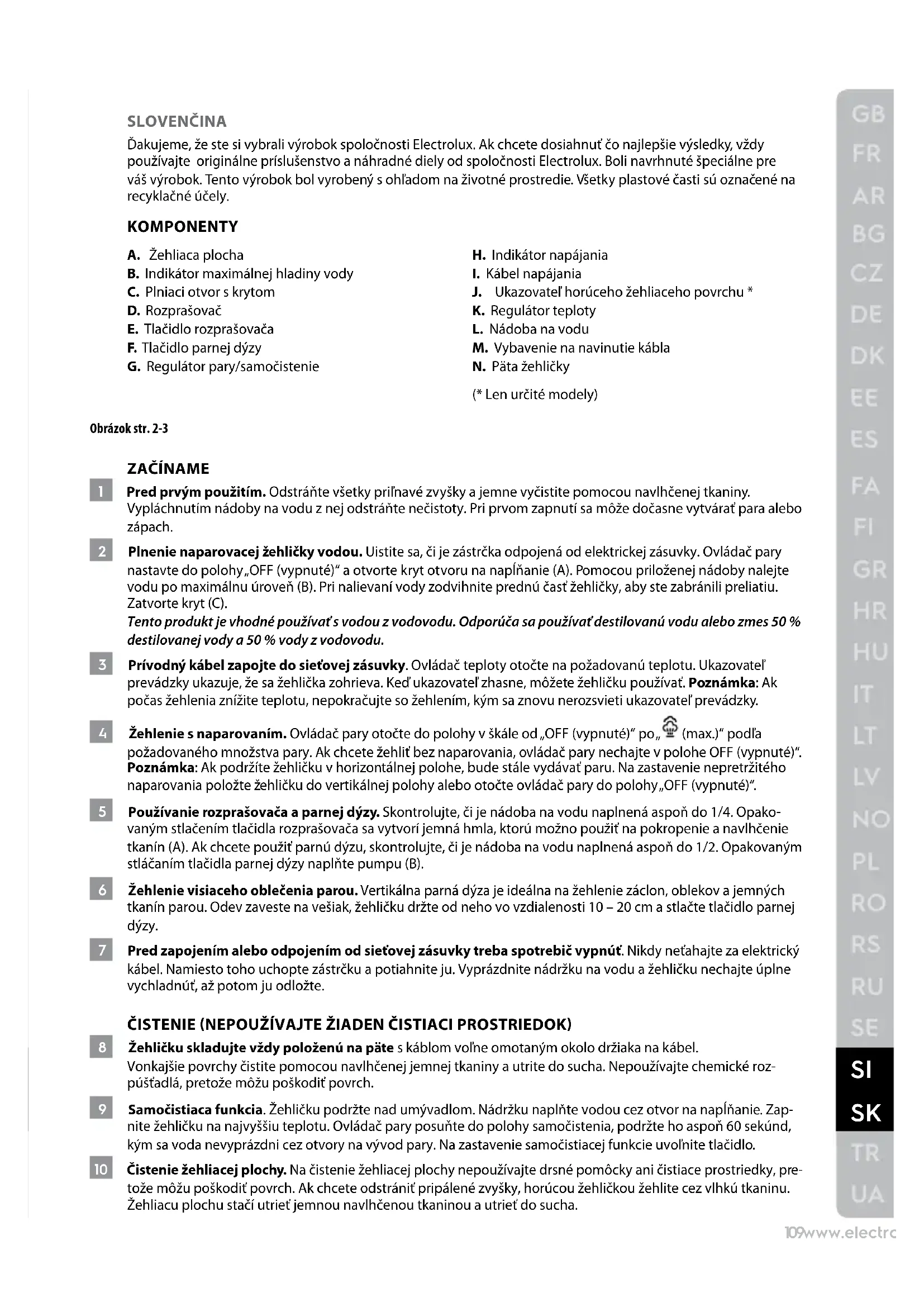 SLOVENČINA Ďakujeme, že ste si vybrali výrobok spoločnosti Electrolux. Ak chcete dosiahnuť čo najlepšie výsledky, vždy používajte originálne príslušenstvo a náhradné diely od spoločnosti Electrolux. Boli navrhnuté špeciálne pre váš výrobok. Tento výrobok bol vyrobený s ohľadom na životné prostredie. Všetky plastové časti sú označené na recyklačné účely. KOMPONENTY A. Žehliaca plocha B. Indikátor maximálnej hladiny vody C. Plniaci otvor s krytom D. Rozprašovač E. Tlačidlo rozprašovača F. Tlačidlo parnej dýzy G. Regulátor pary/samočistenie H. Indikátor napájania