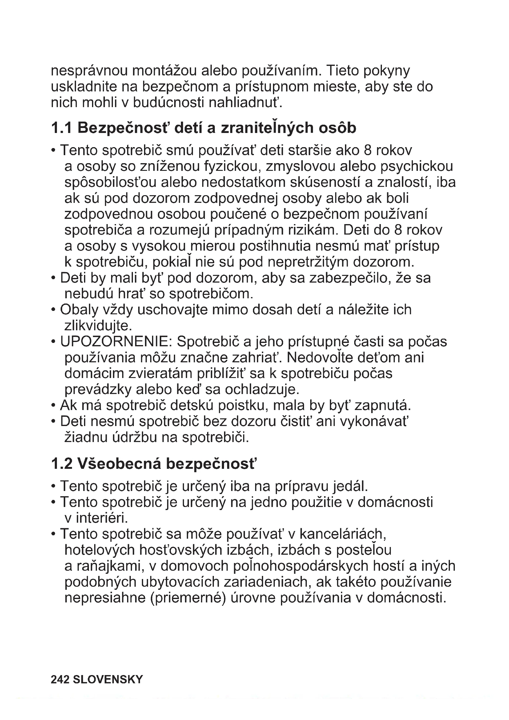 - Tento spotrebič smú používať deti staršie ako 8 rokov a osoby so zníženou fyzickou, zmyslovou alebo psychickou spôsobilosťou alebo nedostatkom skúseností a znalostí, iba ak sú pod dozorom zodpovednej osoby alebo ak boli zodpovednou osobou poučené o bezpečnom používaní spotrebiča a rozumejú prípadným rizikám. Deti do 8 rokov a osoby s vysokou mierou postihnutia nesmú mať prístup k spotrebiču, pokiaľ nie sú pod nepretržitým dozorom.