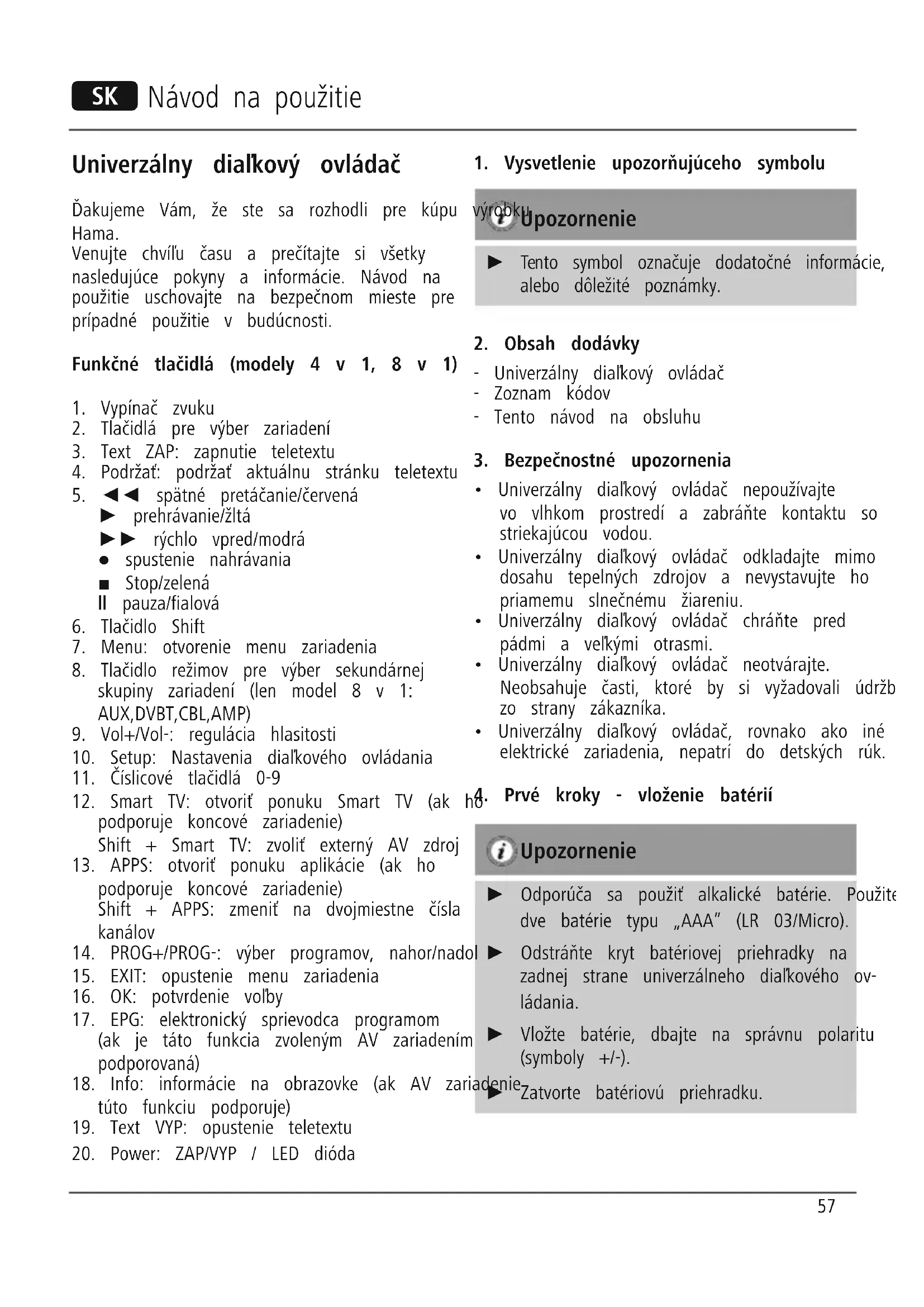 - Univerzálny diaľkový ovládač neotvárajte. Neobsahuje časti, ktoré by si vyžadovali údržbu zo strany zákazníka.