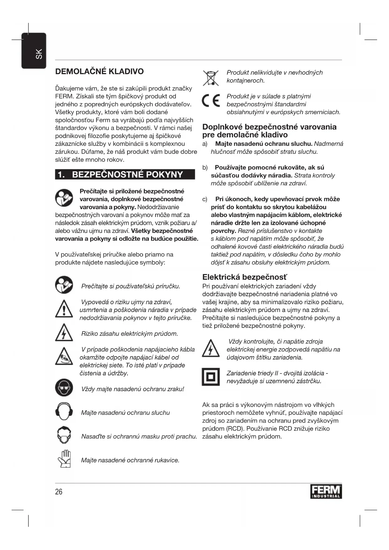 Dakujeme vam, ze ste si zakupili produkt značky FERM. Získali ste tym špičkový produkt od jegného z popredných europskych dodávatělov. Vsetky produkty, ktoré vam boli dodané spolocnostou Ferm sa vyrabaju podfá najvyšsich šandardov vykonu a bezpečnosti. V rámci nasej podnikovej filozofie poskytujeme aj špičkové zákaznicke sluzby v kombinácii s komplexnou zárukou. Dufame, ze nás produkt vam bude dobre sluzit' este mnoho rokov.
