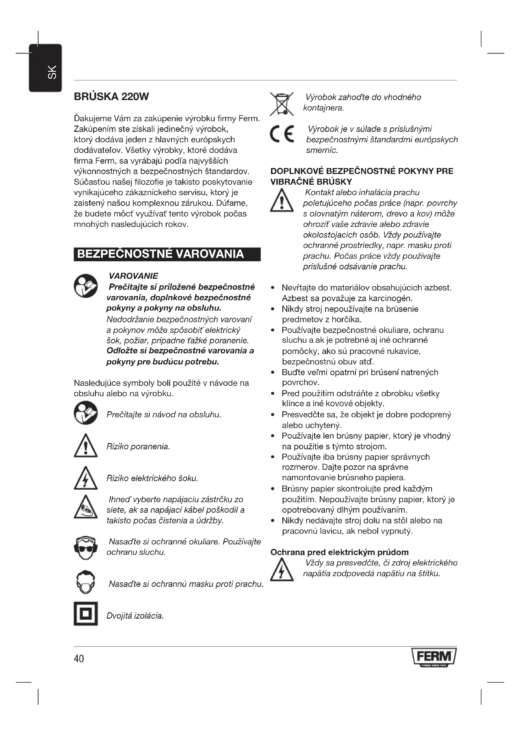 VAROVANIE Prečítajte si priložené bezpečnostné varovania, doplnkové bezpečnostné pokyny a pokyny na obsluhu. Nedodržanie bezpečnostných varovaní a pokynov môže spôsobiť elektrický šok, požiar, prípadne ťažké poranenie. Odložte si bezpečnostné varovania a pokyny pre budúcu potrebu. Nasledujúce symboly boli použité v návode na obsluhu alebo na výrobku. Prečítajte si návod na obsluhu. Riziko poranenia. Riziko elektrického šoku. Ihneď vyberte napájaciu zástrčku zo siete, ak sa napájací kábel poškodil a takisto počas čistenia a údržby. Nasaďte si ochranné okuliare. Používajte ochranu sluchu. Nasaďte si ochrannú masku proti prachu. Dvojitá izolácia. Výrobok zahoďte do vhodného kontajnera. Výrobok je v súlade s príslušnými bezpečnostnými štandardmi európskych smerníc.