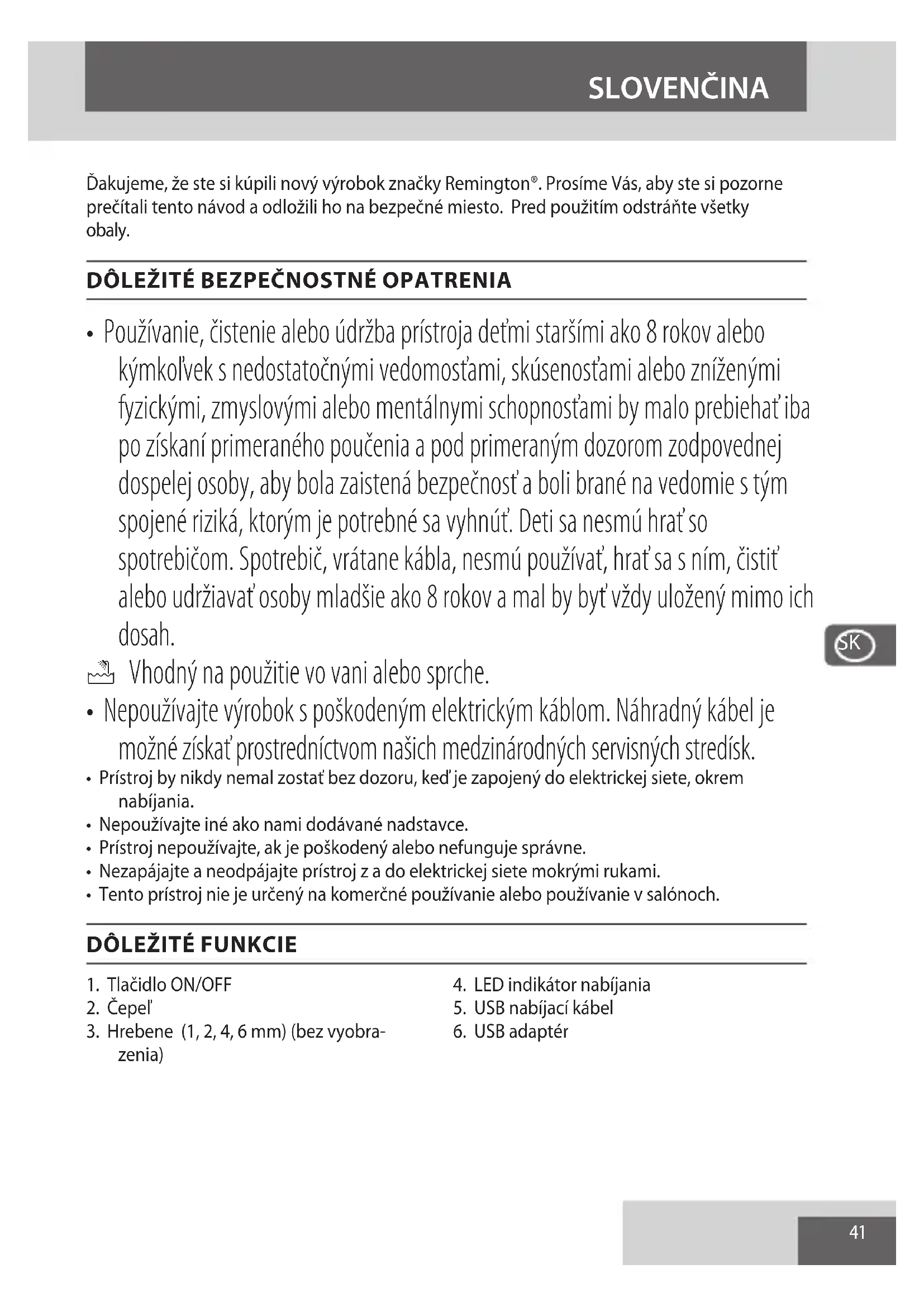 Aby sme sa vyhli environmentálnym a zdravotným problémom vyplývajúcim z nebezpečných látok, prístroje a nabíjateľné a nenabíjateľné batérie označené niektorým z týchto symbolov nesmú byť vyhadzované do netriedeného komunálneho odpadu. Vždy odovzdávajte elektrické a elektronické výrobky a tam, kde je to možné, aj nabíjateľné a nenabíjateľné batérie, na k tomu určených ociálnych recyklačných/zberných miestach. SLOVENČINA45 Děkujeme, že jste si zakoupili nový výrobek značky Remington®. Přečtěte si prosím pozorně návod a uložte ho na bezpečné místo. Před použitím odstraňte veškeré obaly. DŮLEŽITÁ BEZPEČNOSTNÍ OPATŘENÍ