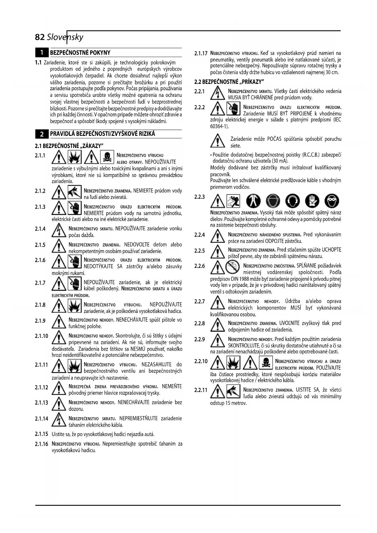 produktom od jedného z popredných európskych výrobcov vysokotlakových čerpadiel. Ak chcete dosiahnuť najlepší výkon vášho zariadenia, pozorne si prečítajte brožúrku a pri použití zariadenia postupujte podľa pokynov. Počas pripájania, používania a servisu spotrebiča urobte všetky možné opatrenia na ochranu svojej vlastnej bezpečnosti a bezpečnosti ľudí v bezprostrednej blízkosti. Pozorne si prečítajte bezpečnostné predpisy a dodržiavajte ich pri každej činnosti. V opačnom prípade môžete ohroziť zdravie a bezpečnosť a spôsobiť škody spojené s vysokými nákladmi.
