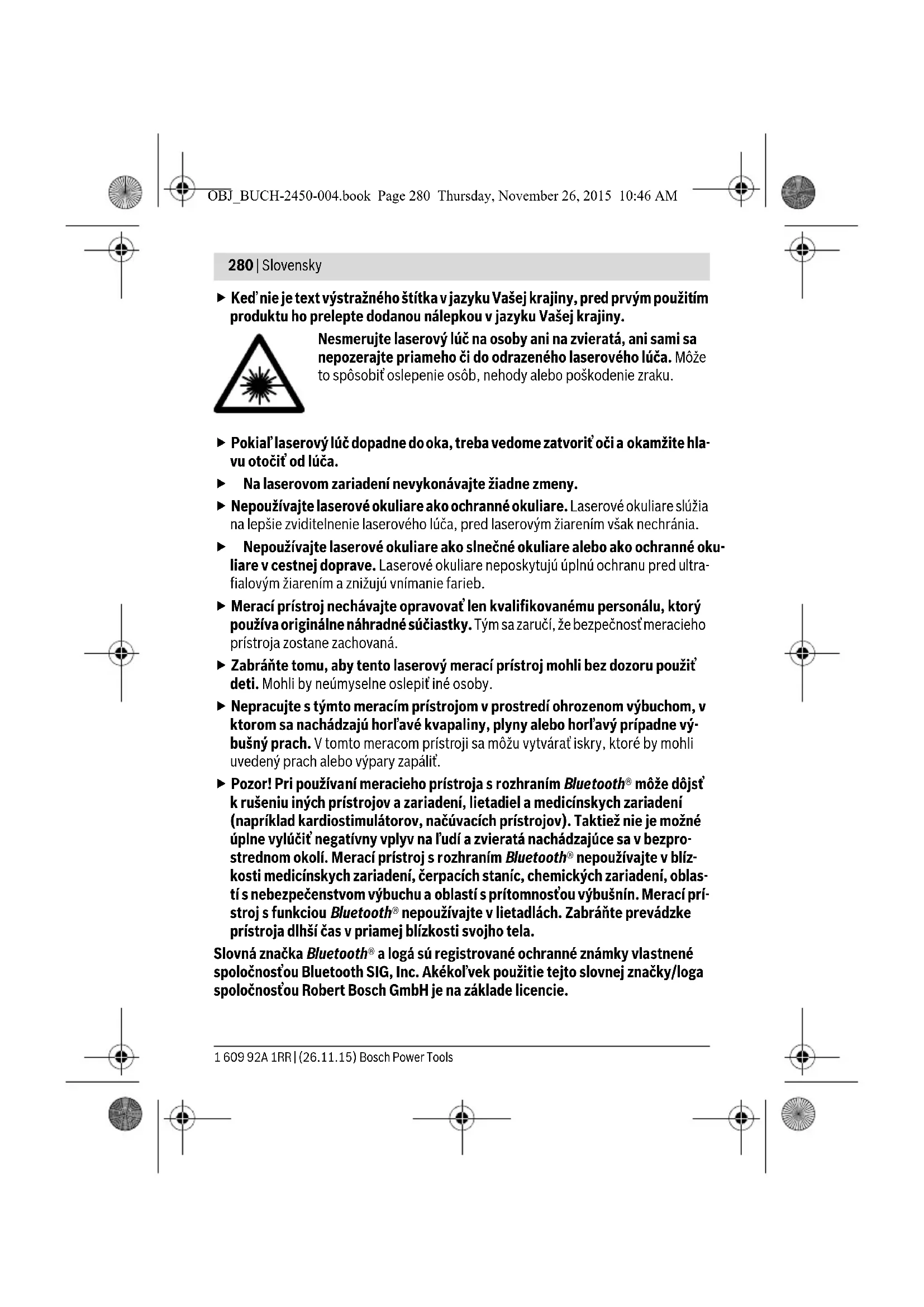 Na jednoznačnú identifikáciu Vášho meracieho prístroja slúži sériové číslo 11 na typovom štítku. Digitálny laserový diaľkomer GLM 50 C OBJ_BUCH-2450-004.book Page 282 Thursday, November 26, 2015 10:46 AMSlovensky | 283 Bosch Power Tools 1 609 92A 1RR | (26.11.15) Vyhlásenie o konformite Vyhlasujeme na výhradnú zodpovednosť, že výrobok opísaný v časti „Technické údaje“ spĺňa všetky príslušné ustanovenia smerníc 1999/5/ES a 2011/65/EÚ vrátane ich zmien a je v súlade s nasledujúcimi normami: EN 61010-1: 2010-10, EN 60825-1: 2014-08, EN 300 328 V1.8.1: 2012-06, EN 301 489-1 V1.8.1: 2008-04, EN 301 489-1 V1.9.2: 2011-09, EN 301 489-17 V2.2.1: 2012-09, EN 62479: 2010-09, EN 50581: 2012. Technické podklady má spoločnosť: Robert Bosch GmbH, PT/ETM9, 70764 Leinfelden-Echterdingen, GERMANY Robert Bosch GmbH, Power Tools Division 70764 Leinfelden-Echterdingen, GERMANY Leinfelden, 10.11.2015 Vyobrazené komponenty Číslovanie jednotlivých zobrazených komponentov sa vzťahuje na vyobrazenie mera- cieho prístroja na grafickej strane tohto Návodu na používanie. 1 Displej 2 Meracie tlačidlo[ ] 3 Tlačidlo Plus[+] 4 Tlačidlo Voľba vzťažnej roviny 5 Tlačidlo vypínača[ ] 6 Tlačidlo Bluetooth® 7 Tlačidlo funkcií[Func] 8 Tlačidlo Mínus[–] 9 Viečko priehradky na batérie 10 Aretácia veka priehradky na batérie 11 Sériové číslo 12 Výstražný štítok laserového prístroja 13 1/4" závit statívu Henk Becker Executive Vice President Engineering Helmut Heinzelmann Head of Product Certification PT/ETM9 OBJ_BUCH-2450-004.book Page 283 Thursday, November 26, 2015 10:46 AM284 | Slovensky 1 609 92A 1RR | (26.11.15) Bosch Power Tools 14 Prijímacia šošovka 15 Výstup laserového žiarenia 16 Ochranná taška 17 Laserová cieľová tabuľka* 18 Okuliare na zviditeľnenie laserového lúča* 19 Statív*