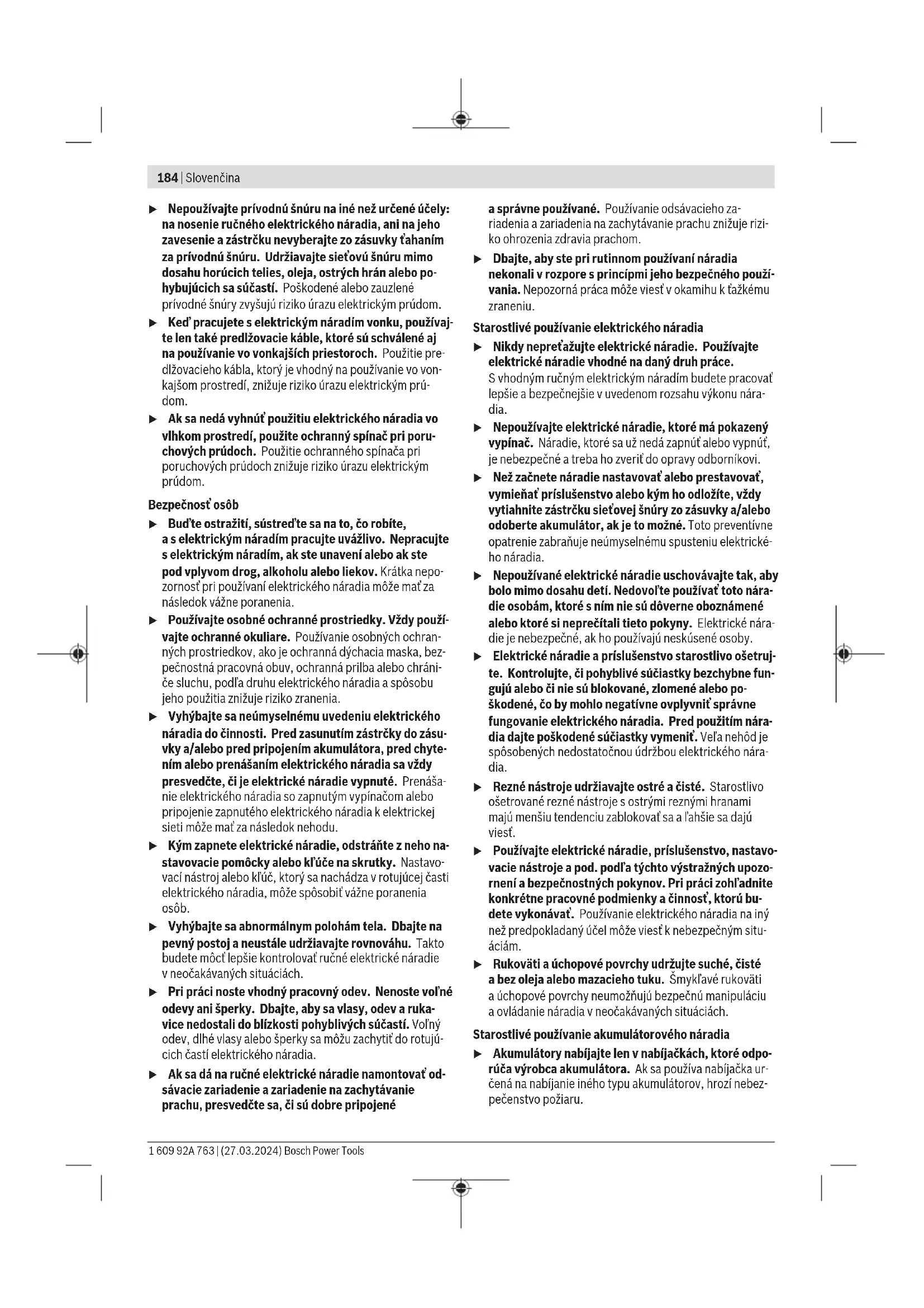 Konštantná elektronika udržiava počet otáčok pri voľnobehu apri zaťažení na približne rovnakej úrovni, atým zabezpeču- je rovnomerný pracovný výkon náradia. Montáž Montáž ochranného zariadenia u Pred všetkými prácami na elektrickom náradí (naprí- klad údržba, výmena nástroja apodobne), ako aj pri jeho preprave auskladnení vyberte akumulátor zelektrického náradia. Vprípade neúmyselného aktivo- vania vypínača hrozí nebezpečenstvo poranenia. u Pred všetkými prácami na elektrickom náradí vytiah- nite sieťovú zástrčku zo zásuvky. Bosch Power Tools 1 609 92A 763 | (27.03.2024)190 | Slovenčina Upozornenie: Po zlomení brúsneho kotúča počas prevádzky alebo pri poškodení upínacích zariadení na ochrannom kryte/na elektrickom náradí sa musí elektrické náradie bez- odkladne zaslať zákazníckemu servisu. Adresu si pozrite vodseku „Zákaznícka služba a poradenstvo ohľadom použi- tia“. Ochranný kryt na brúsenie Ochranný kryt (7) položte na uchyte- nie na elektrickom náradí tak, aby sa kódovacie narážky ochranného krytu zhodovali suchytením. Stlačte apri- tom držte odisťovaciu páčku (1). Ochranný kryt (7) položte na krk vre- tena tak, aby okraj ochranného krytu dosadal na prírubu elektrického nára- dia aochranný kryt otáčajte, kým zre- teľne počuteľne nezapadne. Nastavte polohu ochranného krytu (7) podľa požiadaviek príslušnej práce. Zatlačte na odisťovaciu páčku (1) nahor aotočte ochranný kryt (7) do požadovanej polohy. u Nastavte ochranný kryt (7) vždy tak, aby obidva vý- stupky odisťovacej páčky (1) zapadali do príslušných výrezov ochranného krytu (7). u Ochranný kryt (7) nastavte tak, aby sa zabránilo od- lietavaniu iskier do smeru obsluhujúcej osoby. u Ochranný kryt(7) sa smie dať otočiť vsmere otáčania príslušenstva iba pri aktivovaní odisťovacej páčky(1) ! Vopačnom prípade sa elektrické náradie nesmie vžiadnom prípade používať ďalej amusí sa odovzdať na opravu do zákazníckeho servisu. Upozornenie: Kódovacie výstupky na ochrannom kryte (7) zaistia, že sa na elektrické náradie dá namontovať len vhod- ný ochranný kryt. Odsávací kryt na brúsenie Na dosiahnutie minimálnej prašnosti pri brúsení farieb, lakov aplastov vspojení smiskovitými brúsnymi kotúčmi zo spekaného karbidu(11) môžete použiť odsávací kryt(6). Odsávací kryt(6) nie je vhodný na opracovávanie kovov. Na odsávací kryt(6) môžete pripojiť vhodný vysávač Bosch. Nasaďte pritom saciu hadicu sodsávacím adaptérom na prí- slušný upevňovací nátrubok odsávacieho krytu. Ochranný kryt na rezanie u Pri rezaní vždy používajte ochranný kryt na rezanie(8) alebo ochranný kryt na brúsenie (7) spolu skrytom na rezanie (9). u Pri rezaní do kameňa sa postarajte odostatočné odsá- vanie prachu. Ochranný kryt na rezanie(8) sa montuje tak ako ochranný kryt na brúsenie(7). Kovový kryt na rezanie Namontujte kovový kryt na rezanie(9) na ochranný kryt na brúsenie(7) (pozriobrázokA): Vyklopte prídržné ramienko dozadu (➊). Nasuňte kryt(9) na ochranný kryt na brúsenie (7) (➋). Pritlačte prídržné ramienko pevne na ochranný kryt(7) (➌). Pri demontáži (pozriobrázokB) stlačte gombík na prídrž- nom ramienku (➊) avyklopte ho dozadu (➋). Stiahnite kryt(9) zochranného krytu(7) (➌). Plastový kryt na rezanie Nasuňte plastový kryt na rezanie(9) na ochranný kryt na brúsenie(7) (pozriobrázokC). Kryt(9) počuteľne aviditeľ- ne zaskočí do ochranného krytu(7). Pri demontáži (pozriobrázokD) odistite kryt(9) na ochran- nom kryte(7) (➊) vľavo alebo vpravo akryt stiahnite (➋). Odsávací kryt na rezanie svodiacimi sánkami Odsávací kryt na rezanie svodiacimi saňami(30) sa montuje tak ako ochranný kryt na brúsenie. Upevnením prídavnej rukoväti(5)/(4) pomocou strmeňa od- sávacieho krytu na telo prevodovky sa elektrické náradie pevne spojí sodsávacím krytom. Na odsávací kryt svodiaci- mi saňami(30) môžete pripojiť vhodný vysávač Bosch. Na- saďte pritom saciu hadicu sodsávacím adaptérom na prí- slušný upevňovací nátrubok odsávacieho krytu. Upozornenie: Trenie, ktoré vzniká pri odsávaní kvôli prítom- nosti prachu vsacej hadici avpríslušenstve, spôsobuje vznik elektrostatického náboja, ktorý môže používateľ pocítiť ako statický výboj (vzávislosti od podmienok okolia ajeho fyzi- ologického stavu). Bosch vo všeobecnosti odporúča použí- vať na vysávanie jemného prachu asuchých materiálov anti- statickú saciu hadicu (príslušenstvo). Ochrana rúk u Pri práci sgumeným brúsnym tanierom(23) alebo smiskovitou kefou/kužeľovou kefou/diamantovou vŕ- tacou korunkou vždy namontujte ochranu rúk (22). Ochranu rúk(22) upevnite sprídavnou rukoväťou(5)/(4). Štandardná prídavná rukoväť/prídavná rukoväť tlmiaca vibrácie Naskrutkujte prídavnú rukoväť(5)/(4) podľa spôsobu práce vpravo alebo vľavo na hlavu prevodovky. u Elektrické náradie používajte iba sprídavnou rukovä- ťou (5)/(4). u Elektrické náradie prestaňte používať, keď je prídav- ná rukoväť (5)/(4) poškodená. Na prídavnej rukoväti(5)/(4) nerobte žiadne úpravy. Prídavná rukoväť tlmiaca vibrácie(4) umožňuje prácu smenšími vibráciami atak zabezpečuje príjemnejšiu abez- pečnú prácu. Montáž brúsnych nástrojov u Pred všetkými prácami na elektrickom náradí (naprí- klad údržba, výmena nástroja apodobne), ako aj pri jeho preprave auskladnení vyberte akumulátor zelektrického náradia. Vprípade neúmyselného aktivo- vania vypínača hrozí nebezpečenstvo poranenia. u Pred všetkými prácami na elektrickom náradí vytiah- nite sieťovú zástrčku zo zásuvky. u Nedotýkajte sa brúsnych arezacích kotúčov, kým ne- ochladnú. Kotúče sú pri práci veľmi horúce. 1 609 92A 763 | (27.03.2024) Bosch Power ToolsSlovenčina | 191