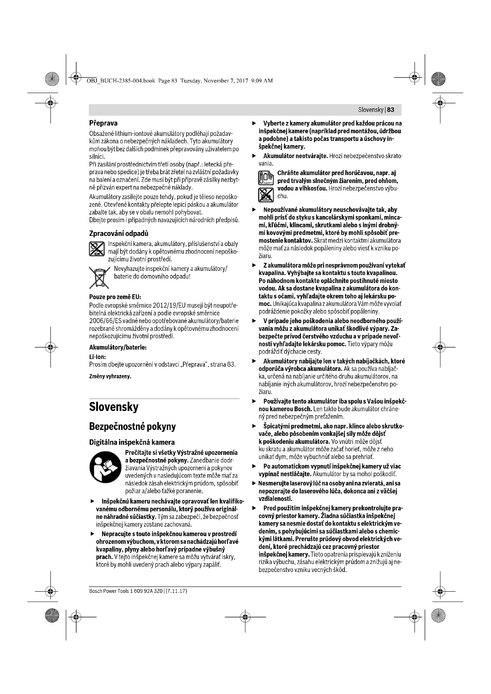OBJ_BUCH-2385-004.book Page 85 Tuesday, November 7, 2017 9:09 AM86 | Slovensky 1 609 92A 3Z0 | (7.11.17) Bosch Power Tools Na vloženie nabitého akumulátora 17 ho zasúvajte do šachty 28, až kým citeľne nezaskočí a nebude sa nachádzať v jednej rovine s držadlom inšpekčnej kamery. Na vybratie akumulátora 17 stlačte odisťovacie tlačidlá 18 a vytiahnite akumulátor zo šachty 28. Nepoužívajte pritom neprimeranú silu. Prevádzka s adaptérom na batérie (nevyberateľným) (3 601 B41 270) (pozri obrázok C) Na otvorenie krytu priehradky na batérie 29 stlačte odisťova- cie tlačidlá 18 a odoberte kryt priehradky na batérie. Pri vkladaní batérií dávajte pozor na správne pólovanie. Kryt priehradky na batérie 29 znova nasaďte a nechajte do počuteľne zaskočiť. Vymieňajte vždy všetky batérie súčasne. Pri jednej výmene používajte len batérie jedného výrobcu a vždy také, ktoré ma- jú rovnakú kapacitu. Vyberte batérie z inšpekčnej kamery v prípade, že ju nebudete dlhší čas používať. Batérie môžu pri dlhšom skladovaní korodovať a dochádza k ich samočinnému vybí- janiu. Stav nabitia akumulátora/batérií Pri nízkej úrovni nabitia akumulátora/batérií sa najprv na disp- leji zobrazí symbol . Keď je symbol prázdny, musíte akumu- látor/batérie vymeniť alebo je potrebné akumulátor nabiť. Vy- konávanie inšpekcií už nie je možné. Montáž kábla kamery (pozri obrázok D) Pri používaní inšpekčnej kamery musí byť kábel kamery 13 primontovaný k ručnému prístroju 1. Nasuňte konektor kábla kamery 13 v správnej pozícii na prí- pojku kamery 21, až pokiaľ nezaskočí. Demontáž kábla kamery (pozri obrázok E) Na odobratie kábla kamery 13 stlačte aretáciu 22 dohromady a vytiahnite konektor z ručného prístroja 1. Montáž zrkadla, magnetu a háčika (pozri obrázok F) Zrkadlo 25, magnet 23 a háčik 24 môžete namontovať na hla- vu kamery 14 ako pomôcky. Nasuňte jednu z týchto troch pomôcok podľa polohy na ob- rázku až na doraz na výrez na hlave kamery 14. Upozornenie: Magnet 23 a háčik 24 sú vhodné iba na pohy- bovanie a odstraňovanie voľne položených, drobných a ľah- kých predmetov. V prípade príliš silného ťahania sa môže in- špekčná kamera alebo príslušná pomôcka poškodiť. Používanie Ručný prístroj 1 a akumulátor 17 chráňte pred vlhkos- ťou a priamym slnečným žiarením. Kábel kamery a hlava kamery sú pri správnej montáži vodotesné. Ručný prístroj a akumulátor nie sú však chránené proti vode, pri kontakte s vodou existuje riziko úrazu elektrickým prúdom alebo ri- ziko poškodenia. Nevystavujte inšpekčnú kameru extrémnym teplotám ani príliš veľkému kolísaniu teploty. Nenechávajte ju napríklad odloženú dlhší čas v motorovom vozidle. V prípa- de väčšieho kolísania teploty nechajte najprv inšpekčnú kameru pred použitím temperovať na teplotu prostredia, v ktorom ju budete používať. Nepoužívajte inšpekčnú kameru vtedy, keď je objektív v hlave kamery 14 orosený. Inšpekčnú kameru zapínaj- te až vtedy, keď sa spomínaná vlhkosť odparila. V ta- komto prípade by sa mohla inšpekčná kamera poškodiť. Zapnuté svetlo 15 môže byť počas prevádzky horúce. Nedotýkajte sa svetla, čím zabránite vzniku popálenín. Uvedenie do prevádzky Vloženie karty Micro-SD Otvorte horný kryt 10 azasuňte kartu Micro-SD 20 až na do- raz do priestoru na kartu 11. Opäť uzatvorte horný kryt. Zapínanie/vypínanie Na zapnutie inšpekčnej kamery stlačte tlačidlo vypínača 3. Na displeji 9 sa na krátky čas zobrazí úvodná obrazovka. Ak chcete inšpekčnú kameru vypnúť, stlačte tlačidlo vypína- ča 3 znova. Ak nestlačíte žiadne tlačidlo na inšpekčnej kamere, prístroj sa po uplynutí nastaveného času (k) automaticky vypne. Regulovanie lampičky v hlave kamery Na zvýšenie jasu obrazu kamery môžete zapnúť svetlo 15 v hlave kamery a regulovať jas. Jas je možné nastavovať v 4 stupňoch (0 %, 25 %, 50 %, 100 %). Na zapnutie svetla kamery 15 a na zvýšenie jasu stláčajte tla- čidlo 7 dovtedy, pokiaľ sa nedosiahne želaná úroveň jasu. Nepozerajte sa priamo do lampičky 15 a nesmerujte svetlo lampičky ani na iné osoby. Svetlo lampičky by mohlo poškodiť ľudský zrak. Na zníženie jasu a vypnutie svetla kamery 15 stláčajte tlačidlo 7 dovtedy, pokiaľ sa nedosiahne želaná úroveň jasu alebo po- kiaľ sa svetlo nevypne. Zväčšenie obrazu na displeji (priblíženie/zoom) Krátkym stlačením tlačidla 2 môžete obraz na displeji zväčšiť 1,5- alebo 2-násobne. Otočenie obrazu na displeji (Up is Up™) (pozri obrázok G) Tlačidlom 5 otočíte obraz tak, že strana označovaná ako „hore“ sa aj na displeji zobrazuje hore. Upozornenie: Funkcia je obmedzená pri namontovanom zrkadle 25 a/alebo pri vertikálnom vyrovnaní kábla kamery