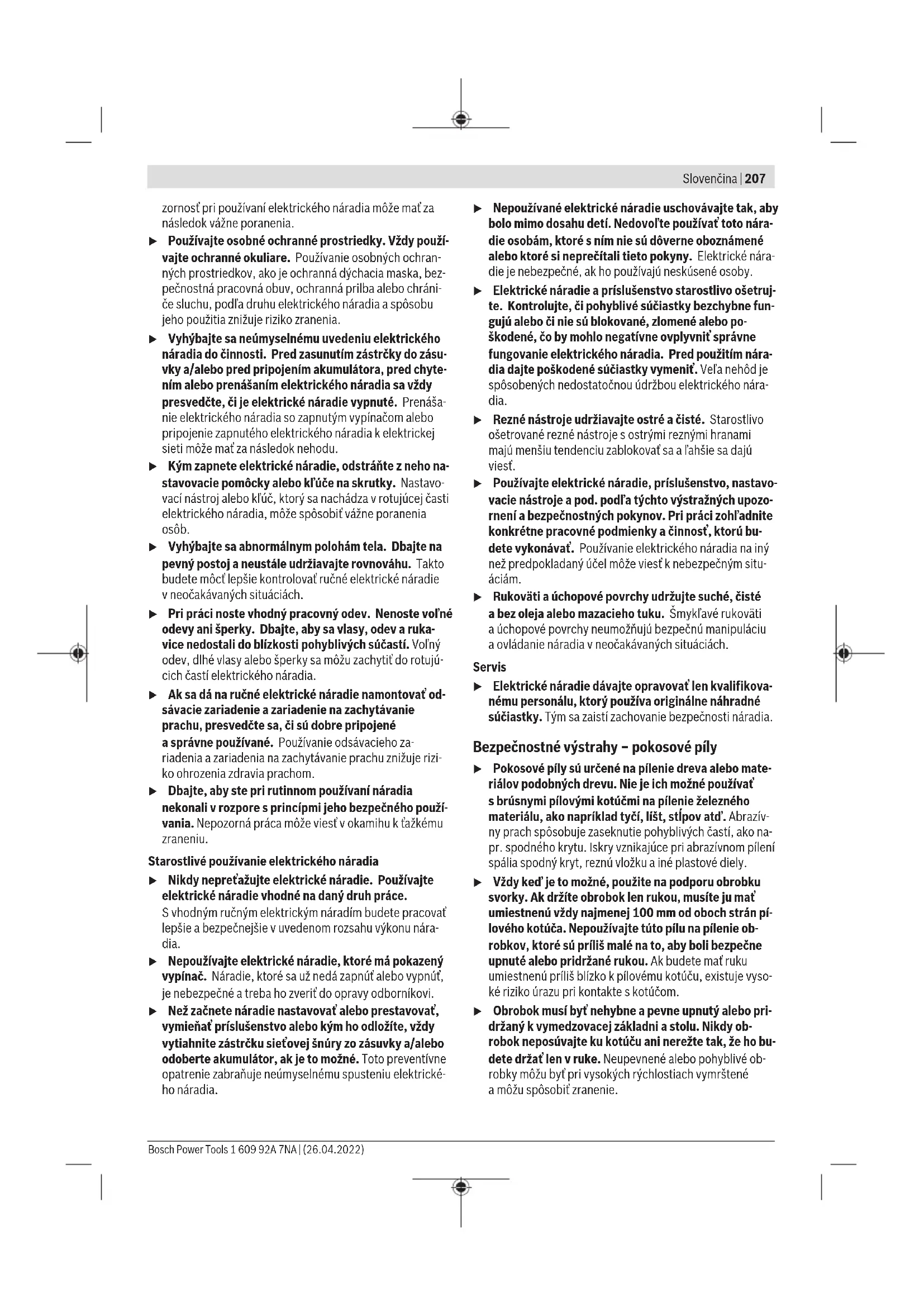 Zákaznická služba aporadenství ohledně použití Zákaznická služba zodpoví vaše dotazy kopravě aúdržbě vašeho výrobku atéž knáhradním dílům. Rozkladové Bosch Power Tools 1 609 92A 7NA | (26.04.2022)206 | Slovenčina výkresy ainformace onáhradních dílech najdete také na: www.bosch-pt.com Vpřípadě dotazů knašim výrobkům apříslušenství vám ochotně pomůže poradenský tým Bosch. Vpřípadě veškerých otázek aobjednávek náhradních dílů bezpodmínečně uveďte 10místné věcné číslo podle typového štítku výrobku. Czech Republic Robert Bosch odbytová s.r.o. Bosch Service Center PT K Vápence 1621/16 692 01 Mikulov Na www.bosch-pt.cz si si můžete objednat opravu Vašeho stroje nebo náhradní díly online. Tel.: +420 519 305700 Fax: +420 519 305705 E-Mail: servis.naradi@cz.bosch.com www.bosch-pt.cz Další adresy servisů najdete na: www.bosch-pt.com/serviceaddresses Likvidace Elektronářadí, příslušenství aobaly odevzdejte kekologické recyklaci. Elektronářadí nevyhazujte do domovního odpadu! Pouze pro zeměEU: Podle evropské směrnice 2012/19/EU oodpadních elektrických aelektronických zařízeních ajejí realizace vnárodních zákonech se již nepoužitelné elektronářadí musí shromažďovat odděleně od ostatního odpadu aodevzdat kekologické recyklaci. Při nesprávné likvidaci mohou odpadní elektrická aelektronická zařízení kvůli případnému obsahu nebezpečných látek poškodit životní prostředí alidské zdraví. Slovenčina Bezpečnostné upozornenia Všeobecné bezpečnostné výstrahy – elektrické náradie VÝSTRAHA Prečítajte si všetky bezpečnostné upozornenia, pokyny, ilustrácie ašpecifikácie dodané stýmto elektrickým náradím. Nedodržiavanie všetkých uvedených pokynov môže mať za následok úraz elektrickým prúdom, požiar a/alebo ťažké poranenie. Tieto výstražné upozornenia abezpečnostné pokyny starostlivo uschovajte na budúce použitie. Pojem „elektrické náradie“ používaný vnasledujúcom texte sa vzťahuje na elektrické náradie napájané zo siete (sprívod- nou šnúrou) ana elektrické náradie napájané akumulátoro- vou batériou (bez prívodnej šnúry). Bezpečnosť na pracovisku u Pracovisko vždy udržiavajte čisté adobre osvetlené. Neporiadok aneosvetlené priestory pracoviska môžu mať za následok pracovné úrazy. u Nepoužívajte elektrické náradie vo výbušnom pro- stredí, napr. tam, kde sa nachádzajú horľavé kvapali- ny, plyny alebo horľavý prach. Ručné elektrické náradie vytvára iskry, ktoré by mohli zapáliť prach alebo výpary. u Nedovoľte deťom ainým nepovolaným osobám, aby sa počas používania elektrického náradia zdržiavali vblízkosti pracoviska. Pri rozptyľovaní môžete stratiť kontrolu nad náradím. Bezpečnosť na pracovisku u Zástrčka prívodnej šnúry elektrického náradia musí zodpovedať použitej zásuvke. Vžiadnom prípade nija- ko nemeňte zástrčku. Suzemneným elektrickým náradím nepoužívajte ani žiadne zástrčkové adapté- ry. Neupravované zástrčky avhodné zásuvky znižujú rizi- ko úrazu elektrickým prúdom. u Vyhýbajte sa telesnému kontaktu suzemnenými povr- chovými plochami, ako sú napr. potrubia, vykurovacie telesá, sporáky achladničky. Ak je vaše telo uzemnené, hrozí zvýšené riziko úrazu elektrickým prúdom. u Nevystavujte elektrické náradie dažďu ani vlhkosti. Vniknutie vody do ručného elektrického náradia zvyšuje riziko úrazu elektrickým prúdom. u Nepoužívajte prívodnú šnúru na iné než určené účely: na nosenie ručného elektrického náradia, ani na jeho zavesenie azástrčku nevyberajte zo zásuvky ťahaním za prívodnú šnúru. Udržiavajte sieťovú šnúru mimo dosahu horúcich telies, oleja, ostrých hrán alebo po- hybujúcich sa súčastí. Poškodené alebo zauzlené prívodné šnúry zvyšujú riziko úrazu elektrickým prúdom. u Keď pracujete selektrickým náradím vonku, používaj- te len také predlžovacie káble, ktoré sú schválené aj na používanie vo vonkajších priestoroch. Použitie pre- dlžovacieho kábla, ktorý je vhodný na používanie vo von- kajšom prostredí, znižuje riziko úrazu elektrickým prú- dom. u Ak sa nedá vyhnúť použitiu elektrického náradia vo vlhkom prostredí, použite ochranný spínač pri poru- chových prúdoch. Použitie ochranného spínača pri poruchových prúdoch znižuje riziko úrazu elektrickým prúdom. Bezpečnosť osôb u Buďte ostražití, sústreďte sa na to, čo robíte, aselektrickým náradím pracujte uvážlivo. Nepracujte selektrickým náradím, ak ste unavení alebo ak ste pod vplyvom drog, alkoholu alebo liekov. Krátka nepo- 1 609 92A 7NA | (26.04.2022) Bosch Power ToolsSlovenčina | 207 zornosť pri používaní elektrického náradia môže mať za následok vážne poranenia. u Používajte osobné ochranné prostriedky. Vždy použí- vajte ochranné okuliare. Používanie osobných ochran- ných prostriedkov, ako je ochranná dýchacia maska, bez- pečnostná pracovná obuv, ochranná prilba alebo chráni- če sluchu, podľa druhu elektrického náradia aspôsobu jeho použitia znižuje riziko zranenia. u Vyhýbajte sa neúmyselnému uvedeniu elektrického náradia do činnosti. Pred zasunutím zástrčky do zásu- vky a/alebo pred pripojením akumulátora, pred chyte- ním alebo prenášaním elektrického náradia sa vždy presvedčte, či je elektrické náradie vypnuté. Prenáša- nie elektrického náradia so zapnutým vypínačom alebo pripojenie zapnutého elektrického náradia kelektrickej sieti môže mať za následok nehodu. u Kým zapnete elektrické náradie, odstráňte zneho na- stavovacie pomôcky alebo kľúče na skrutky. Nastavo- vací nástroj alebo kľúč, ktorý sa nachádza vrotujúcej časti elektrického náradia, môže spôsobiť vážne poranenia osôb. u Vyhýbajte sa abno