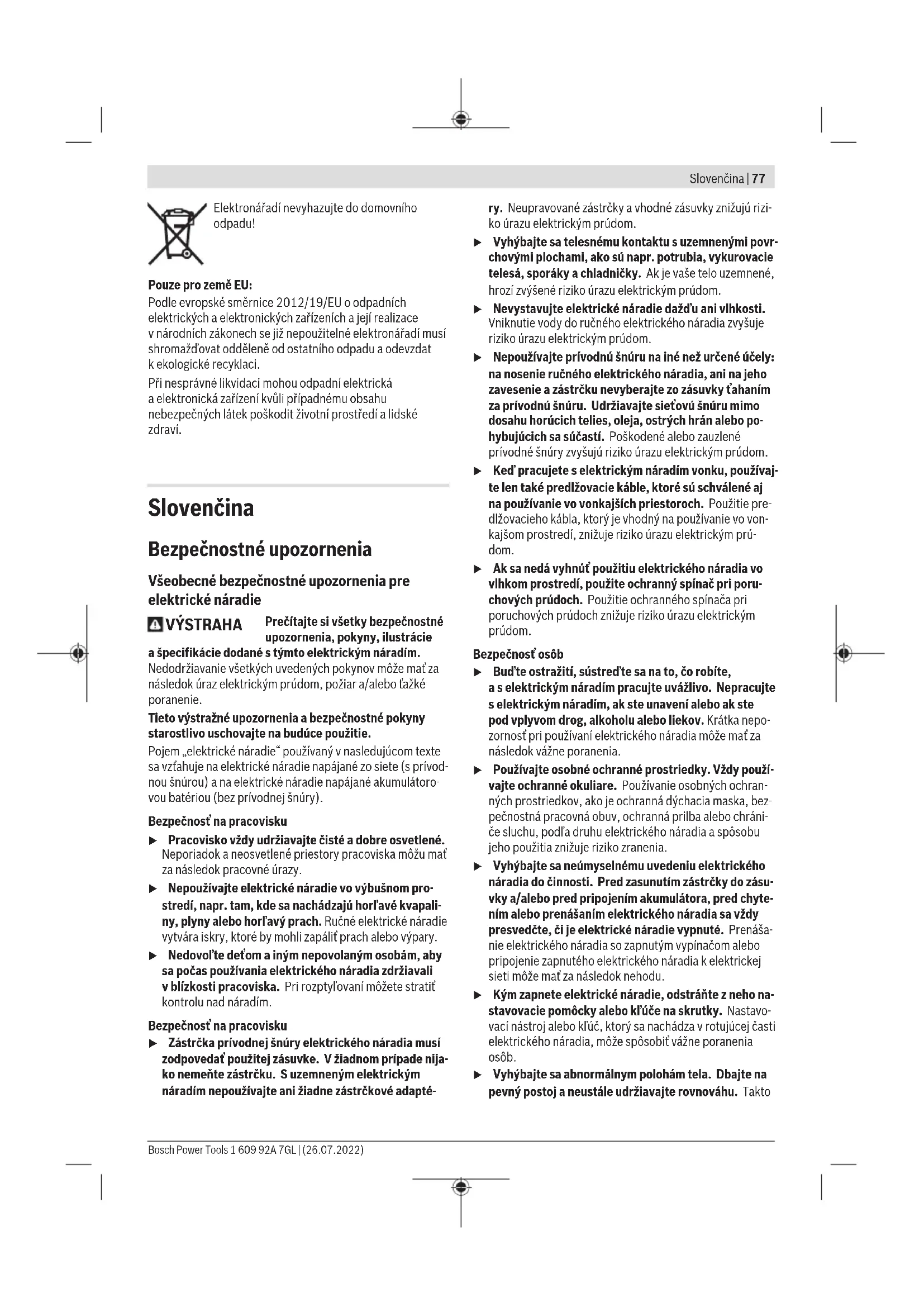 Vyobrazené alebo opísané príslušenstvo nepatrí do štan- dardného rozsahu dodávky. Kompletné príslušenstvo náj- dete vnašom sortimente príslušenstva. Technické údaje Vŕtačka GBM 1600 RE Vecné číslo 3601AB00.. Menovitý príkon W 850 Voľnobežné otáčky ot/min 630 Menovitý krútiaci moment Nm 11 Priemer stopky vretena mm 43 Max. Ø vrtáka – Oceľ mm 16 – Drevo mm 40 – Hliník mm 16 Upínací rozsah skľučovadla mm 3 – 16 Pravobežný/ľavobežný chod ● Maximálny priemer mieša- cieho nástroja mm 160 Vŕtačka GBM 1600 RE Hmotnosť podľa EPTA-Procedure 01:2014 kg 3,0 Trieda ochrany / II Údaje platia pre menovité napätie [U] 230 V. Pri odlišných napätiach avo vyhotoveniach špecifických pre jednotlivé krajiny sa môžu tieto údaje líšiť. Informácia ohlučnosti/vibráciách Hodnoty emisií hluku zistené podľaEN62841-2-1. Úroveň hluku elektrického náradia pri použití váhového fil- traA je typicky: úroveň akustického tlaku 85dB(A); úroveň akustického výkonu 96dB(A). Neistota K=5dB. Noste prostriedky na ochranu sluchu! Celkové hodnoty vibrácií a