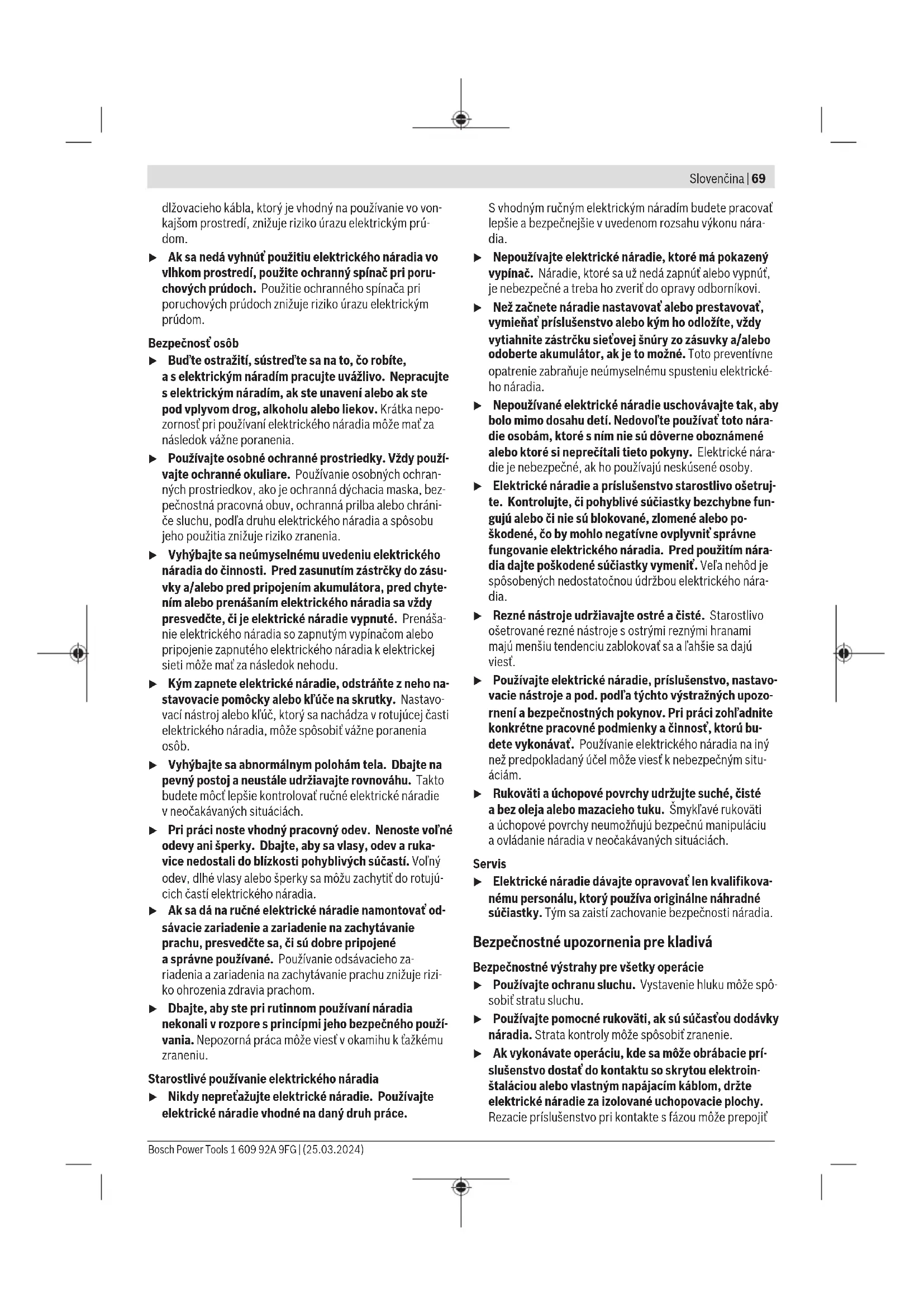 kg 5,8 Trieda ochrany /II A) Hmotnosť bez sieťového pripojovacieho kábla abez sieťovej zá- strčky Údaje platia pre menovité napätie [U] 230 V. Pri odlišných napätiach avo vyhotoveniach špecifických pre jednotlivé krajiny sa môžu tieto údaje líšiť. Hodnoty sa môžu líšiť podľa výrobku azávisia od podmienok použitia aprostredia. Ďalšie informácie na adrese www.bosch-professional.com/wac. Informácia ohlučnosti/vibráciách Hodnoty emisií hluku zistené podľa ENIEC62841-2-6. Úroveň hluku elektrického náradia pri použití váhového fil- traA je typicky: úroveň akustického tlaku 92dB(A); úroveň akustického výkonu 100dB(A). Neistota K=3dB. Noste prostriedky na ochranu sluchu! Celkové hodnoty vibrácií a