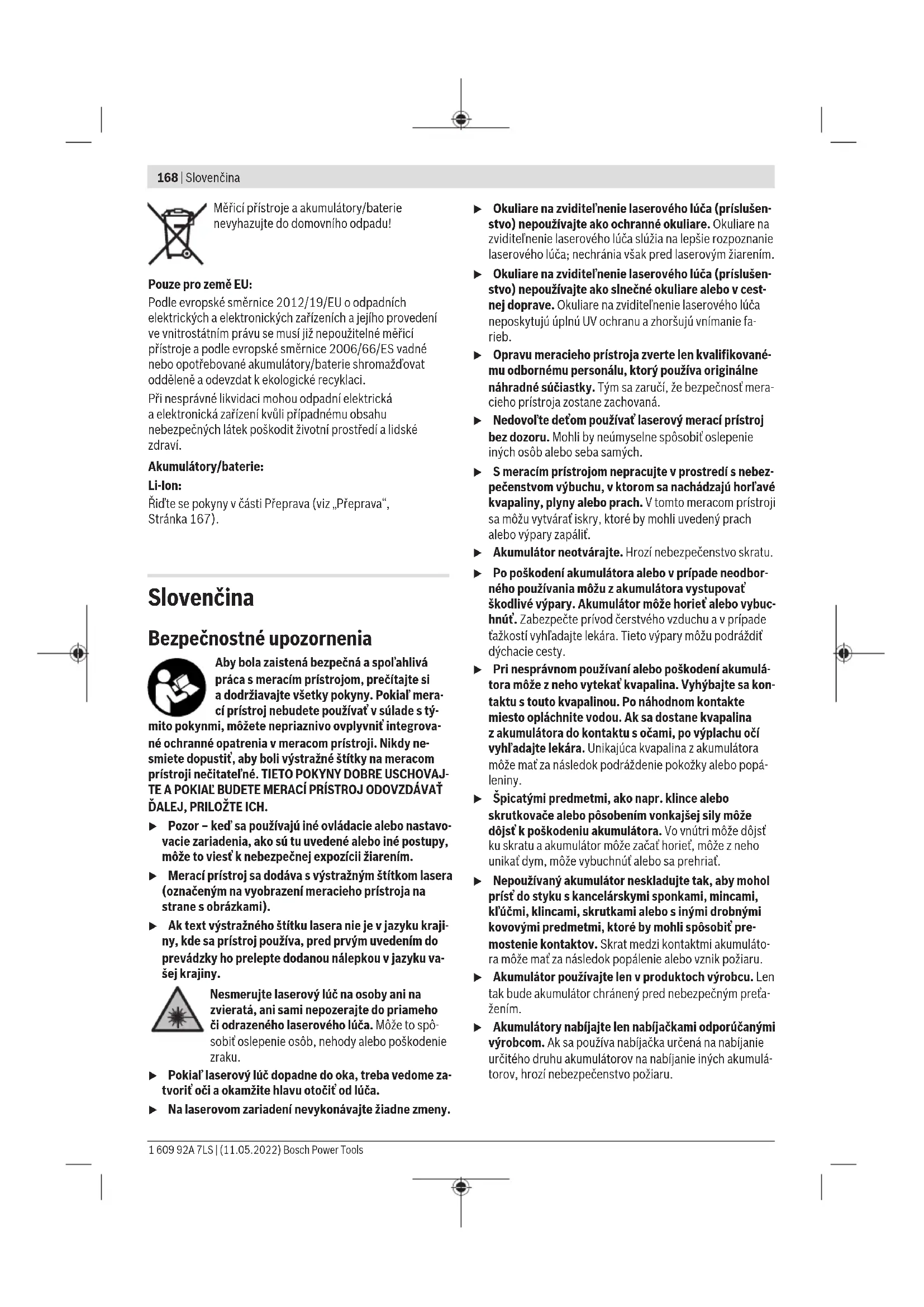 pri 20–25°C C) Uvedené hodnoty predpokladajú normálne až priaznivé podmienky okolia (napr. bez vibrácií, hmly, dymu, nepriameho slnečného žiarenia). Po silných teplotných výkyvoch môže dôjsť kodchýlkam presnosti. D) Vyskytuje sa len nevodivé znečistenie, pričom sa však príležitostne očakáva dočasná vodivosť spôsobená kondenzáciou. E) Kratšie doby prevádzky pri prevádzke s Bluetooth® a/alebo v spojení s RM 3 F) Pri použití prístrojov Bluetooth®-Low-Energy môže byť v závislosti od modelu a operačného systému možné, že sa nevytvorí spojenie. Prí- stroje Bluetooth® musia podporovať SPP profil. G) vzávislosti od použitého akumulátora H) Lítiovo-iónový akumulátor aadaptér na batérie AA1 sú pre IP 54 vylúčené. Technické údaje určené pomocou akumulátora, ktorý je súčasťou balenia. Na jednoznačnú identifikáciu vášho meracieho prístroja slúži sériové číslo (19) uvedené na typovom štítku. Montáž Napájanie meracieho prístroja Tento merací prístroj sa dá používať buď pomocou bežných batérií, aké ponúka maloobchod, alebo pomocou lítiovo-ió- nových akumulátorov. Používanie s akumulátorom u Používajte len nabíjačky uvedené v technických úda- joch. Len tieto nabíjačky sú prispôsobené lítium-iónové- mu akumulátoru použitému vo vašom meracom prístroji. Upozornenie: Používanie akumulátorov, ktoré nie sú vhodné pre váš merací prístroj, môže viesť k chybnému fungovaniu alebo k poškodeniu meracieho prístroja. Upozornenie: Akumulátor sa dodáva v čiastočne nabitom stave. Aby ste zaručili plný výkon akumulátora, pred prvým použitím ho úplne nabite v nabíjačke. Lítiovo-iónové akumulátory možno kedykoľvek dobíjať bez toho, aby to negatívne ovplyvnilo ich životnosť. Prerušenie nabíjania takýto akumulátor nepoškodzuje. Lítiovo-iónový akumulátor je vďaka „Electronic Cell Protec- tion (ECP)“ chránený proti hlbokému vybitiu. Keď je akumu- látor vybitý, merací prístroj sa pomocou ochranného obvodu samočinne vypne. u Nikdy nezapínajte znova merací prístroj, keď bol vy- pnutý prostredníctvom ochranného vypínania. Akumu- látor by sa mohol poškodiť. Bosch Power Tools 1 609 92A 7LS | (11.05.2022)172 | Slovenčina Keď vkladáte nabitý akumulátor (12) zasuňte ho do šachty na akumulátor (11) tak, aby citeľne zaskočil. Ak chcete vybrať akumulátor (12), stlačte odisťovacie tlačidlá (15) a akumulátor vytiahnite z priehradky na akumu- látor (11). Nepoužívajte pritom neprimeranú silu. Používanie pomocou batérií Na prevádzku meracieho prístroja sa odporúča používať alkalické mangánové batérie. Batérie sa vložia do adaptéra na batérie. u Adaptér na batérie je určený výlučne na používanie v meracích prístrojoch Bosch, ktoré sú na to určené a nesmie sa používať s elektrickým náradím. Pred vložením batérií vsuňte puzdro (13) adaptéra na baté- rie do priehradky na akumulátor (11). Batérie vložte do pu- zdra podľa vyobrazenia na uzatváracom kryte (16). Nasaďte kryt na puzdro tak, aby zaskočil. Vyberte (14) batérie tak, že stlačíte odisťova- cie tlačidlá (15) uzatvarácieho krytu (16) a uzatvárací kryt vytiahnete. Dávajte pritom po- zor na to, aby batérie nevypadli. Merací prí- stroj držte pritom tak, aby priehradka na aku- mulátor (11) smerovala nahor. Vyberte batérie. Na od- stránenie puzdra (13) nachádzajúceho sa vnútri siahnite do puzdra a vytiahnite ho z meracieho prístroja miernym za- tlačením na bočnú stenu. Vždy vymieňajte všetky batérie súčasne. Používajte len baté- rie od jedného výrobcu asrovnakou kapacitou. u Ak merací prístroj dlhší čas nepoužívate, batérie zneho vyberte. Batérie môžu pri dlhšom skladovaní vmeracom prístroji korodovať adochádza kich samočin- nému vybíjaniu. Indikácia stavu nabitia Indikácia stavu nabitia batérie(4) na displeji zobrazuje stav nabitia akumulátora, príp. batérie: LED Stav nabitia akumulátora Trvalé zelené svetlo 100–75% Trvalé žlté svetlo 75–35% Blikajúce červené svet-