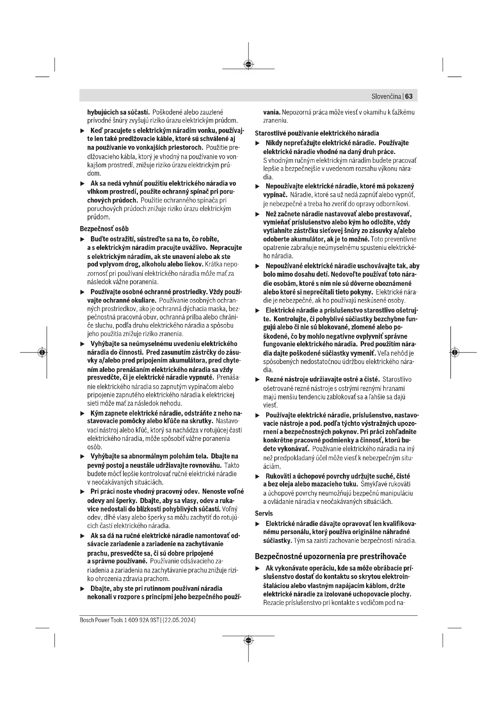 0,7 hliník 200 2,0 Mazání/chlazení razníku Pro prodloužení životnosti razníku(6) byste měli používat mazivo sdobrou chladicí funkcí (např. řezný olej). Naneste na horní stranu plechu podél plánované linie stříhání pruh maziva. Stříhání podle nárysu nebo sšablonou Přímé stříhání je snadnější, když vedete elektronářadí podél pravítka. Kontury lze stříhat vedením elektronářadí podél šablony. Pro vnitřní výřezy je nutný předvrtaný otvor oprůměru 21mm. Údržba aservis Údržba ačištění u Před každou prací na elektronářadí vytáhněte zástrčku ze zásuvky. u Udržujte elektronářadí avětrací otvory čisté, aby pracovalo dobře abezpečně. Je-li nutná výměna přívodního kabelu, nechte ji provést firmou Bosch nebo autorizovaným servisem pro elektronářadí Bosch, abyste zabránili ohrožení bezpečnosti. Každé 3provozní hodiny vyčistěte anaolejujte razník(6) amatrici(7). Razník amatrici při opotřebení včas vyměňte, neboť jen ostré nástroje poskytují dobrý stříhací výkon ašetří elektronářadí. Razník(6) amatrice(7) se nesmí ostřit. Výměna matrice Vyšroubujte šroub srýhovanou hlavou(9) zdržáku matrice(5). Vyjměte matrici(7). Bosch Power Tools 1 609 92A 9ST | (22.05.2024)62 | Slovenčina Vpřípadě potřeby držák matrice(5) vyčistěte. Nasaďte novou, řádně naolejovanou matrici(7). Dbejte přitom na orientaci zploštělé strany. Šroub srýhovanou hlavou (9) snasazeným gumovým kroužkem(8) opět zašroubujte. Utáhněte šroub pomocí klíče na vnitřní šestihran proti odporu gumového kroužku (3−4Nm). Výměna razníku Povolte šroub(2) držáku matrice avytáhněte držák matrice(5) úplně zkrytu. Odsuňte razník(6) zupnutí do strany avytáhněte ho dolů. Do drážky upnutí nasaďte nový, dobře naolejovaný razník(6) avystřeďte ho. Opatrně zasuňte držák matrice(5) přes razník dozadu do krytu. Otočte držák matrice podle požadovaného směru stříhání do jedné ze tří možných poloh. Dostatečně pevně utáhněte šroub(2) držáku matrice. Zákaznická služba aporadenství ohledně použití Zákaznická služba zodpoví vaše dotazy kopravě aúdržbě vašeho výrobku atéž knáhradním dílům. Rozkladové výkresy ainformace onáhradních dílech najdete také na: www.bosch-pt.com Vpřípadě dotazů knašim výrobkům apříslušenství vám ochotně pomůže poradenský tým Bosch. Vpřípadě veškerých otázek aobjednávek náhradních dílů bezpodmínečně uveďte 10místné věcné číslo podle typového štítku výrobku. Czech Republic Robert Bosch odbytová s.r.o. Bosch Service Center PT K Vápence 1621/16 692 01 Mikulov Na www.bosch-pt.cz si si můžete objednat opravu Vašeho stroje nebo náhradní díly online. Tel.: +420 519 305700 Fax: +420 519 305705 E-Mail: servis.naradi@cz.bosch.com www.bosch-pt.cz Další adresy servisů najdete na: www.bosch-pt.com/serviceaddresses Likvidace Elektronářadí, příslušenství aobaly odevzdejte kekologické recyklaci. Elektronářadí nevyhazujte do domovního odpadu! Pouze pro zeměEU: Již nepoužitelná elektrická nářadí se musí likvidovat ve tříděném odpadu. Použijte určená sběrná místa. Při nesprávné likvidaci mohou odpadní elektrická aelektronická zařízení kvůli případnému obsahu nebezpečných látek poškodit životní prostředí alidské zdraví. Slovenčina Bezpečnostné upozornenia Všeobecné bezpečnostné upozornenia pre elektrické náradie VÝSTRAHA Prečítajte si všetky bezpečnostné upozornenia, pokyny, ilustrácie ašpecifikácie dodané stýmto elektrickým náradím. Nedodržiavanie všetkých uvedených pokynov môže mať za následok úraz elektrickým prúdom, požiar a/alebo ťažké poranenie. Tieto výstražné upozornenia abezpečnostné pokyny starostlivo uschovajte na budúce použitie. Pojem „elektrické náradie“ používaný vnasledujúcom texte sa vzťahuje na elektrické náradie napájané zo siete (sprívod- nou šnúrou) ana elektrické náradie napájané akumulátoro- vou batériou (bez prívodnej šnúry). Bezpečnosť na pracovisku u Pracovisko vždy udržiavajte čisté adobre osvetlené. Neporiadok aneosvetlené priestory pracoviska môžu mať za následok pracovné úrazy. u Nepoužívajte elektrické náradie vo výbušnom pro- stredí, napr. tam, kde sa nachádzajú horľavé kvapali- ny, plyny alebo horľavý prach. Ručné elektrické náradie vytvára iskry, ktoré by mohli zapáliť prach alebo výpary. u Nedovoľte deťom ainým nepovolaným osobám, aby sa počas používania elektrického náradia zdržiavali vblízkosti pracoviska. Pri rozptyľovaní môžete stratiť kontrolu nad náradím. Bezpečnosť – elektrina u Zástrčka prívodnej šnúry elektrického náradia musí zodpovedať použitej zásuvke. Vžiadnom prípade nija- ko nemeňte zástrčku. Suzemneným elektrickým náradím nepoužívajte ani žiadne zástrčkové adapté- ry. Neupravované zástrčky avhodné zásuvky znižujú rizi- ko úrazu elektrickým prúdom. u Vyhýbajte sa telesnému kontaktu suzemnenými povr- chovými plochami, ako sú napr. potrubia, vykurovacie telesá, sporáky achladničky. Ak je vaše telo uzemnené, hrozí zvýšené riziko úrazu elektrickým prúdom. u Nevystavujte elektrické náradie dažďu ani vlhkosti. Vniknutie vody do ručného elektrického náradia zvyšuje riziko úrazu elektrickým prúdom. u Nepoužívajte prívodnú šnúru na iné než určené účely: na nosenie ručného elektrického náradia, ani na jeho zavesenie azástrčku nevyberajte zo zásuvky ťahaním za prívodnú šnúru. Udržiavajte sieťovú šnúru mimo dosahu horúcich telies, oleja, ostrých hrán alebo po- 1 609 92A 9ST | (22.05.2024) Bosch Power ToolsSlovenčina | 63 hybujúcich sa súčastí. Poškodené alebo zauzlené prívodné šnúry zvyšujú riziko úrazu elektrickým prúdom